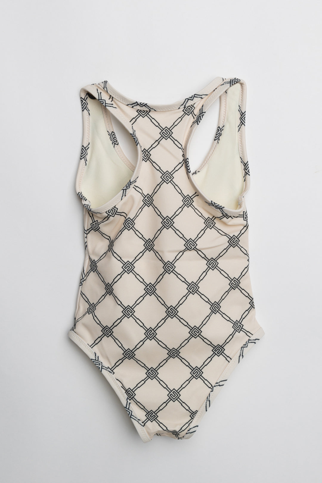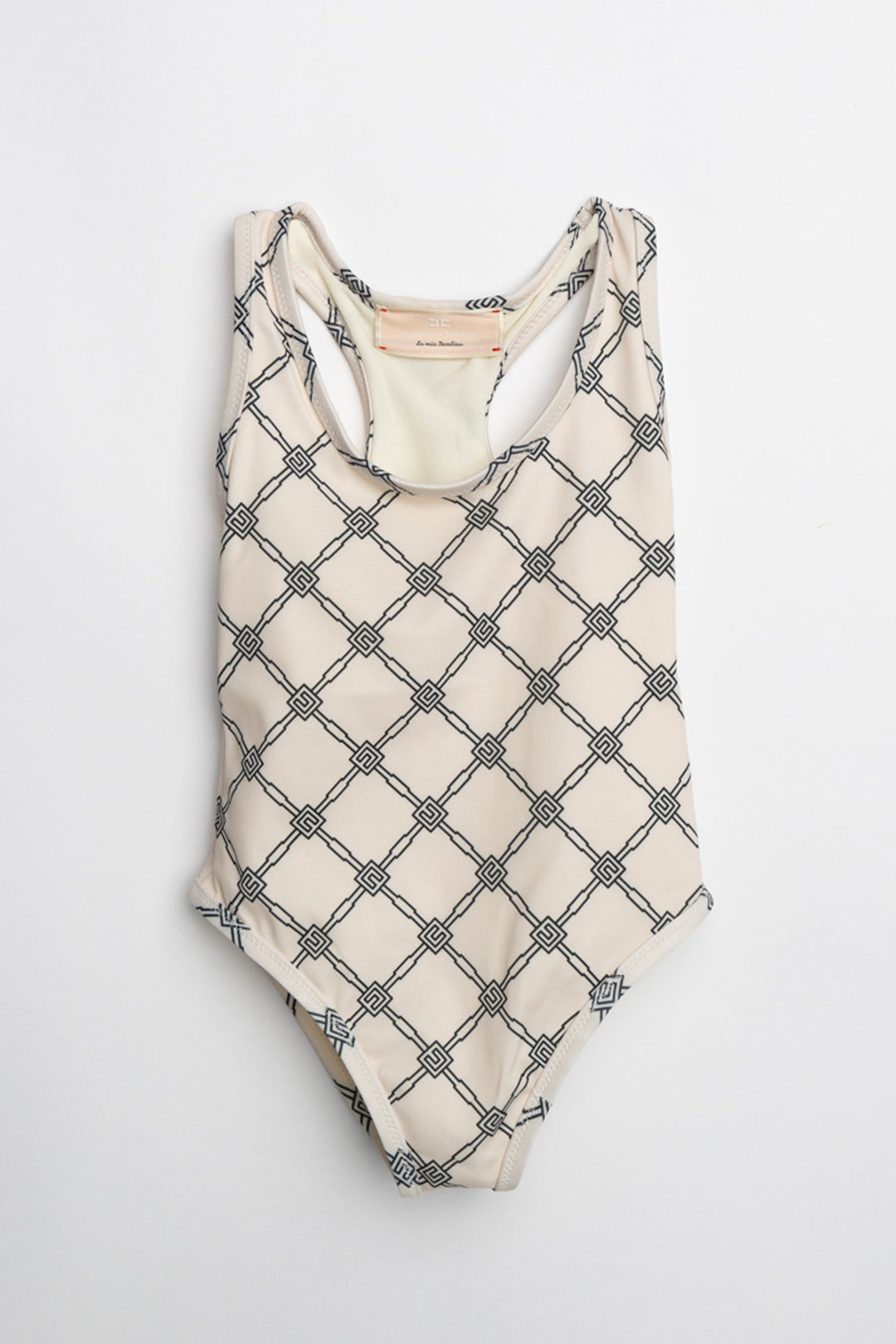 Costume Elisabetta Franchi La Mia Bambina intero sportivo e chic, con scollo olimpionico e stampa logo all-over effetto chain. Design accattivante e fit perfetto per un’estate all’insegna dello stile.