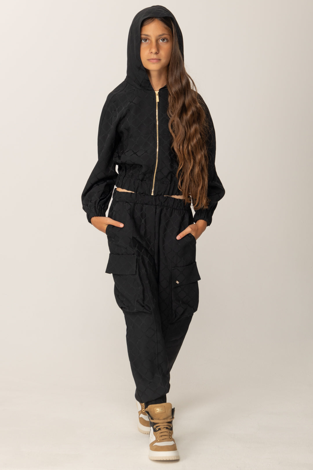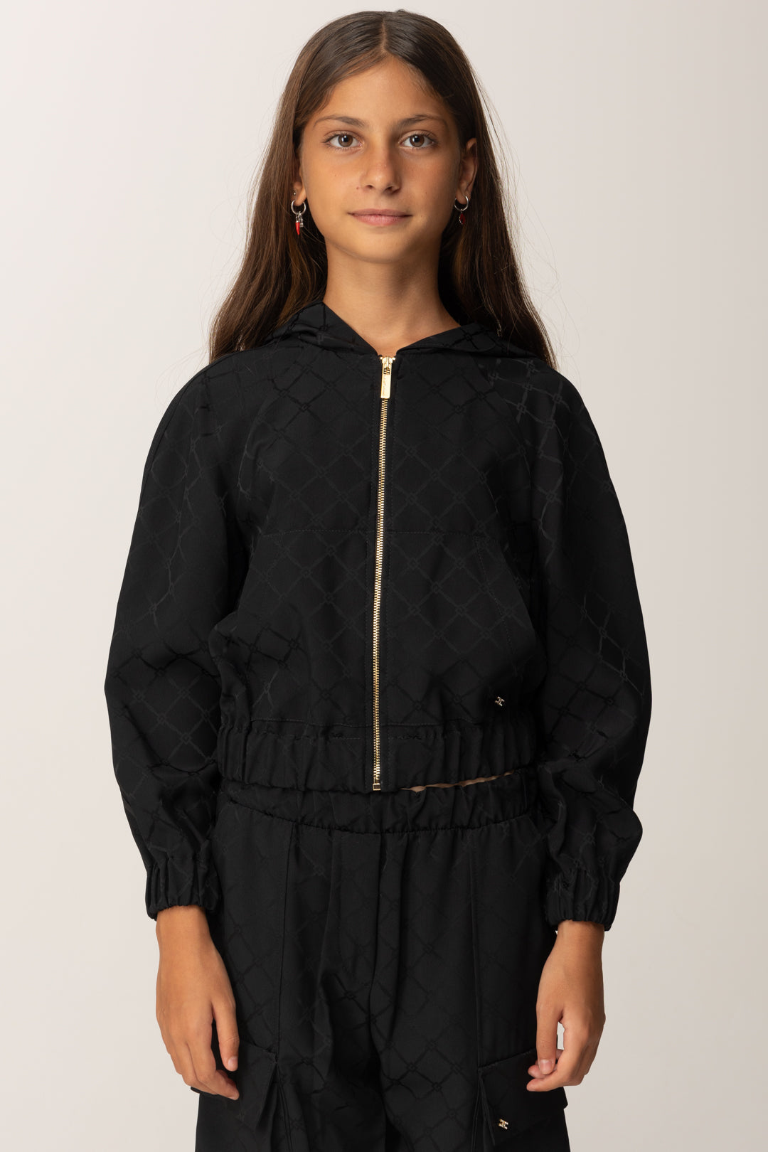 Un giubbotto Elisabetta Franchi La mia Bambina che fonde insieme spirito urban e ricercatezza per un capospalla pieno di stile. Taglio corto con elastico in vita e ai polsi, è realizzato in raso con stampa logo all over, illluminato da uan chiuzura zip frontale in metallo gold e corredato di cappuccio per il massimo della comodità: un vero gioiellino per i suoi outerwear di stagione.
