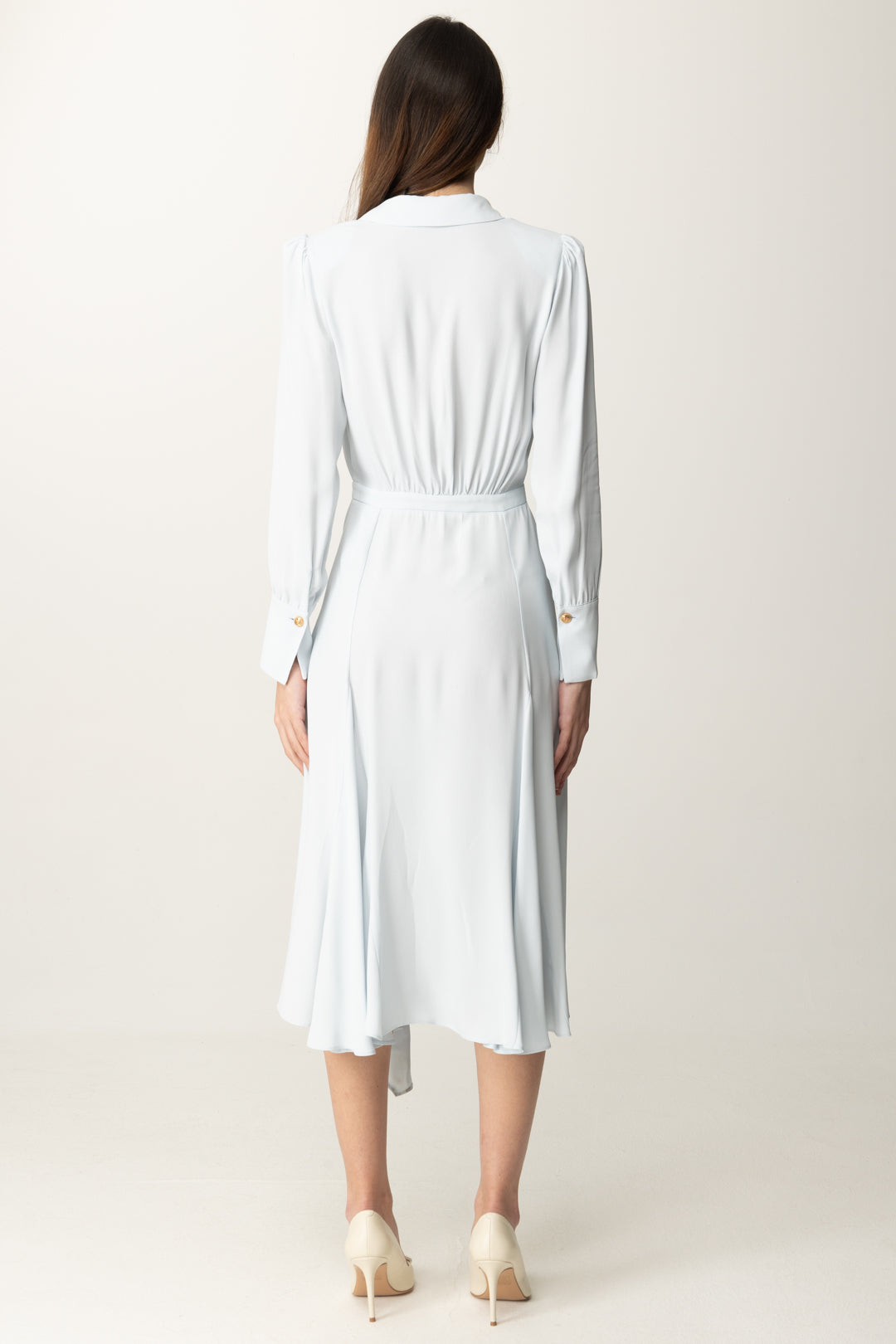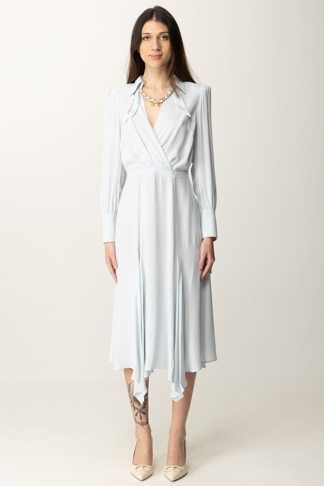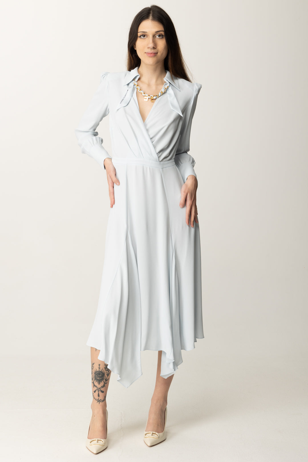 Chic ed impeccabile con questo abito Elisabetta Franchi in georgette, dal design vivace e raffinato a partire dal taglio midi con fondo asimmetrico, per proseguire con la scollatura a incrocio con maxi plissé che crea un effetto drappeggiato sul busto, enfatizzandone il volume. Maniche lunghe con bottoni logo, ultima ma non meno importante la collana con foulard infilato e charm logo CC, per un look accessoriato e di classe in ogni particolare.