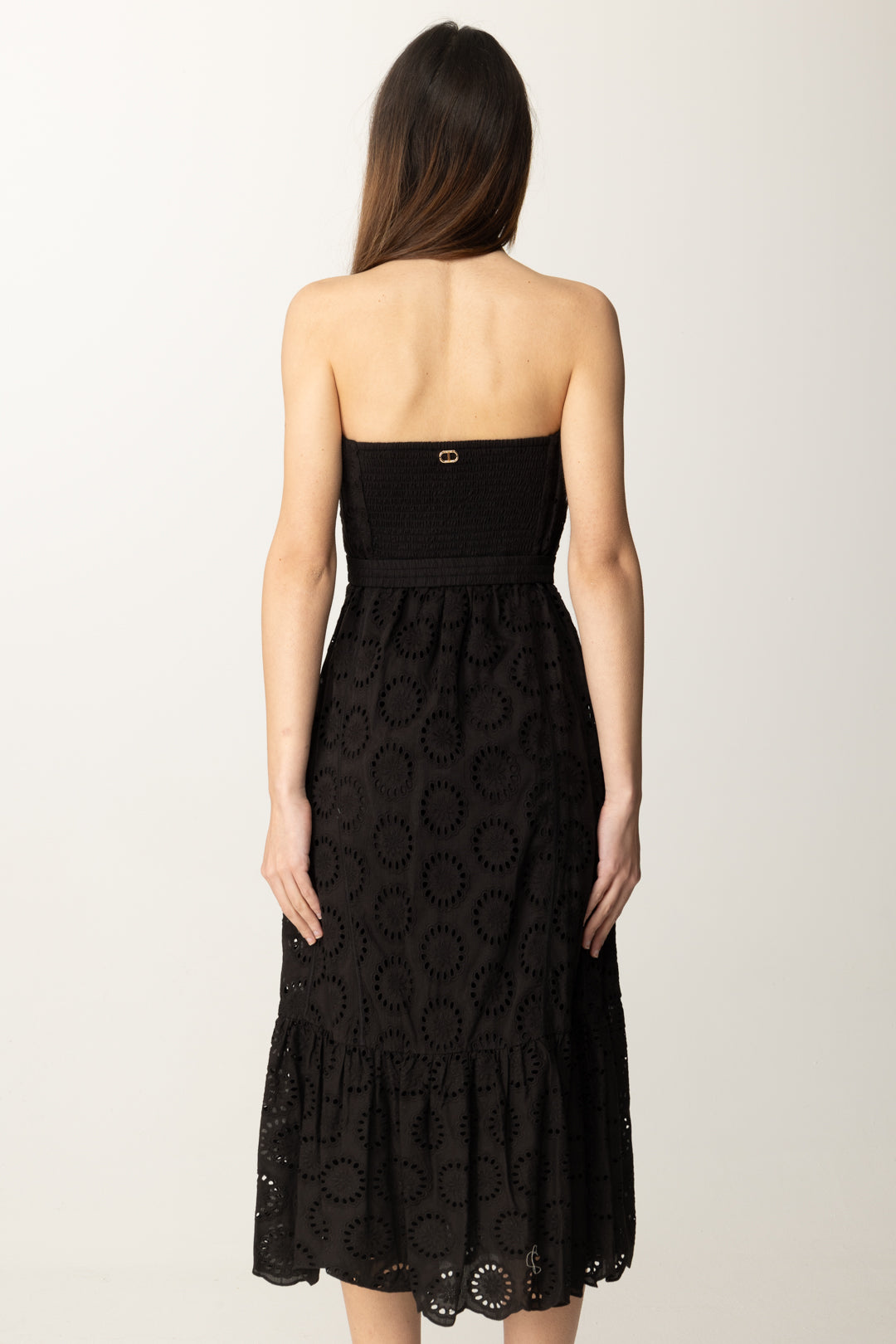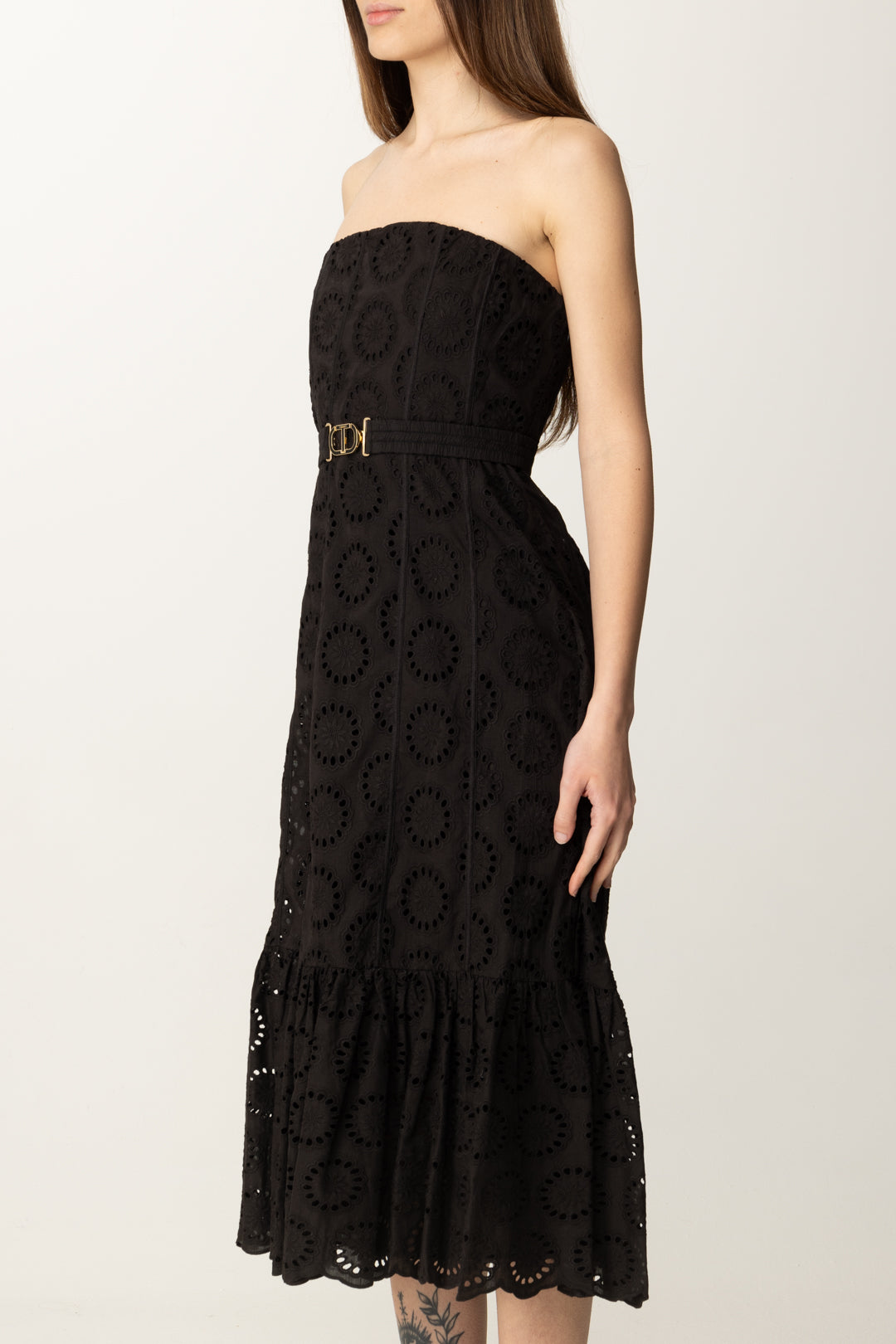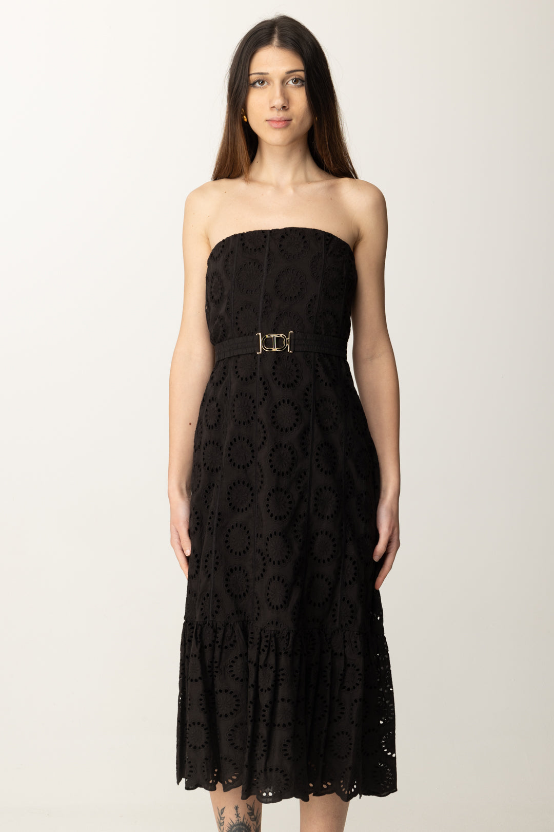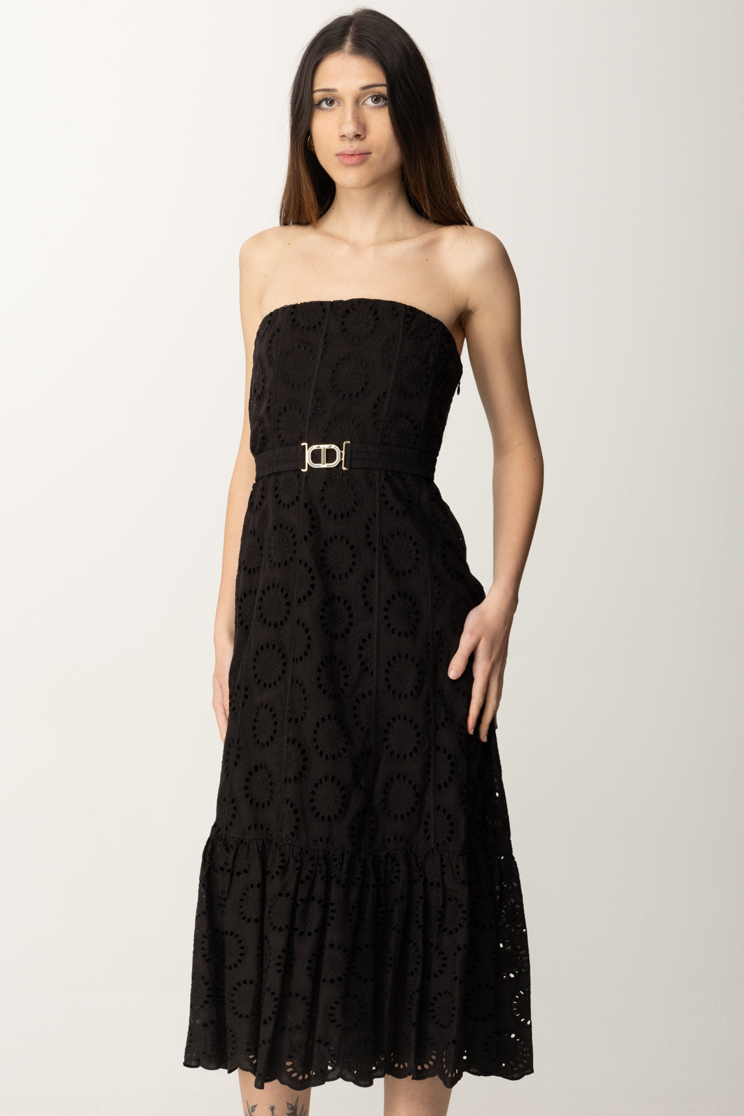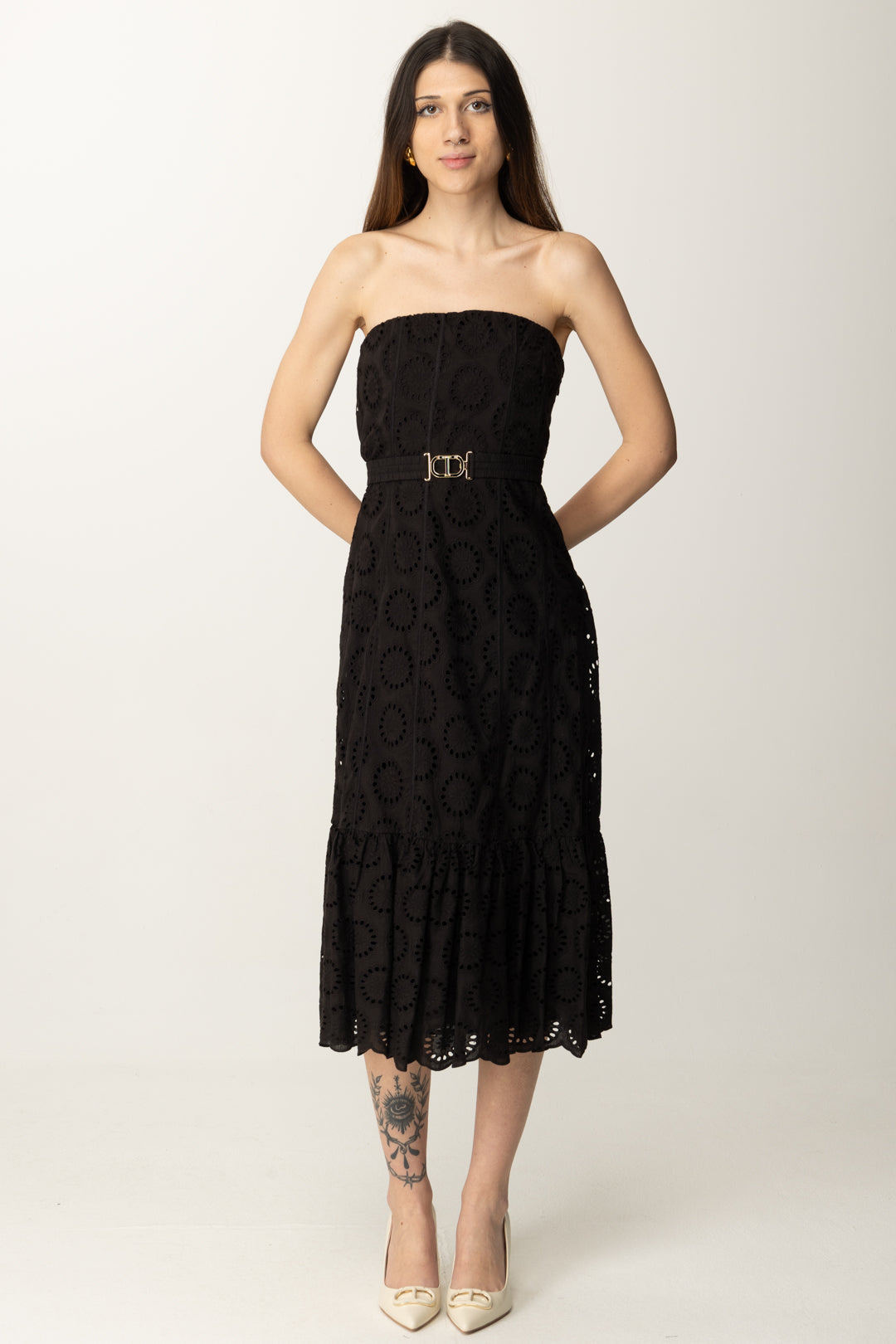 Scollo a fascia e taglio midi con balza sul fondo, ma soprattutto il sangallo all over sono le caratteristiche distintive di questo abito Twinset, con il suo design flare dalla vita in giù. Fresco e spensierato, completato da una cintura logata al punto vita, da indossare sia con shopper e sandali flat che con minibag e tacchetto per un look da aperitivo al tramonto casual chic.