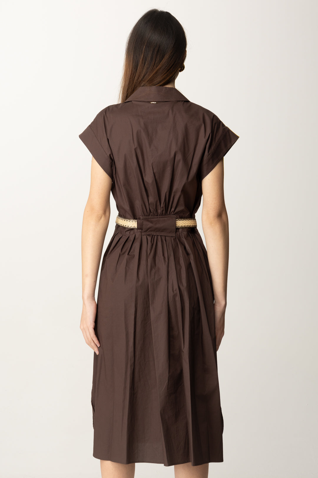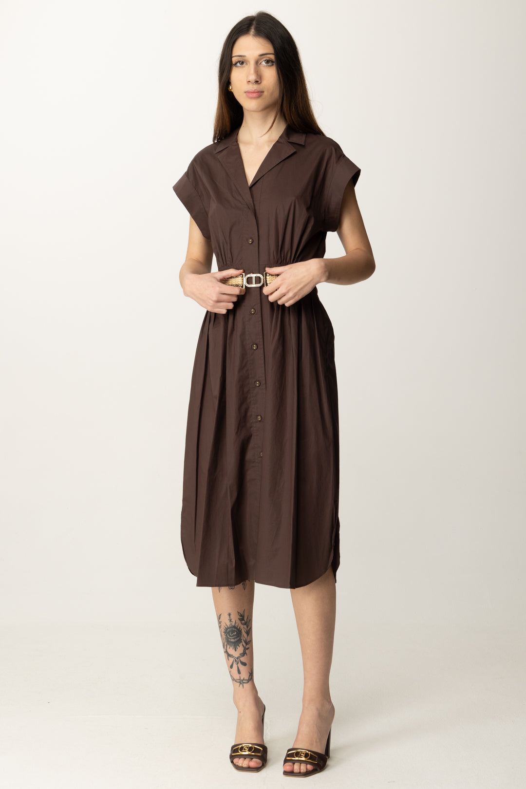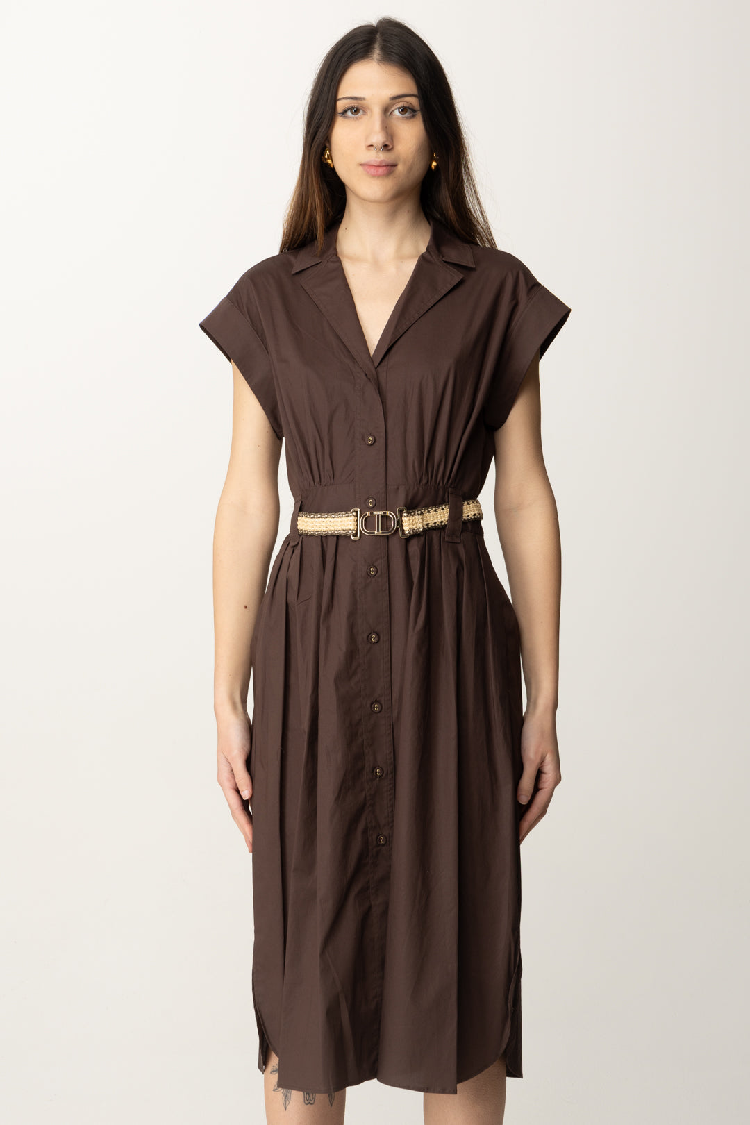 Ancora una versione chemisier Twinset per poter scegliere il meglio per le tue giornate: design classico con abbottonatura frontale, colletto a camicia e maniche corte a kimono, il punto vita è contrassegnato da una cintura in rafia bicolore con fibbia logata per non sottolineare la silhouette con discrezione ed eleganza. Un look versatile e easy, da completare come vuoi tu quanto a calzature ed accessori.
