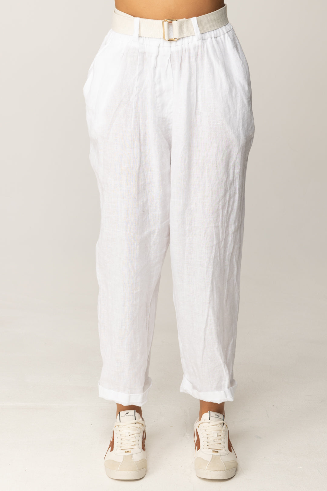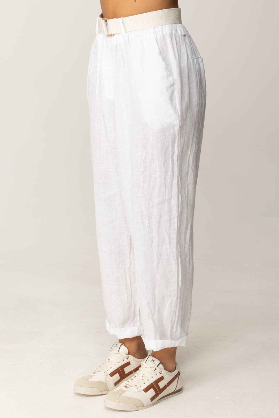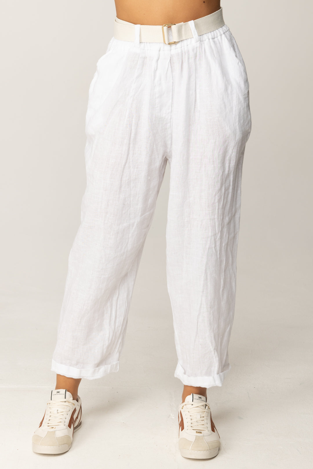 Il taglio cropped con risvolto al fondo esalta la caviglia e dona un’aria spensierata al look, mentre la cintura abbinata aggiunge un tocco grafico e contemporaneo. Abbinali a un top attillato o una blusa leggera per creare un equilibrio tra volumi e materiali, oppure provalo con un crop top a costine e un paio di sneakers per un look casual-chic da weekend.
