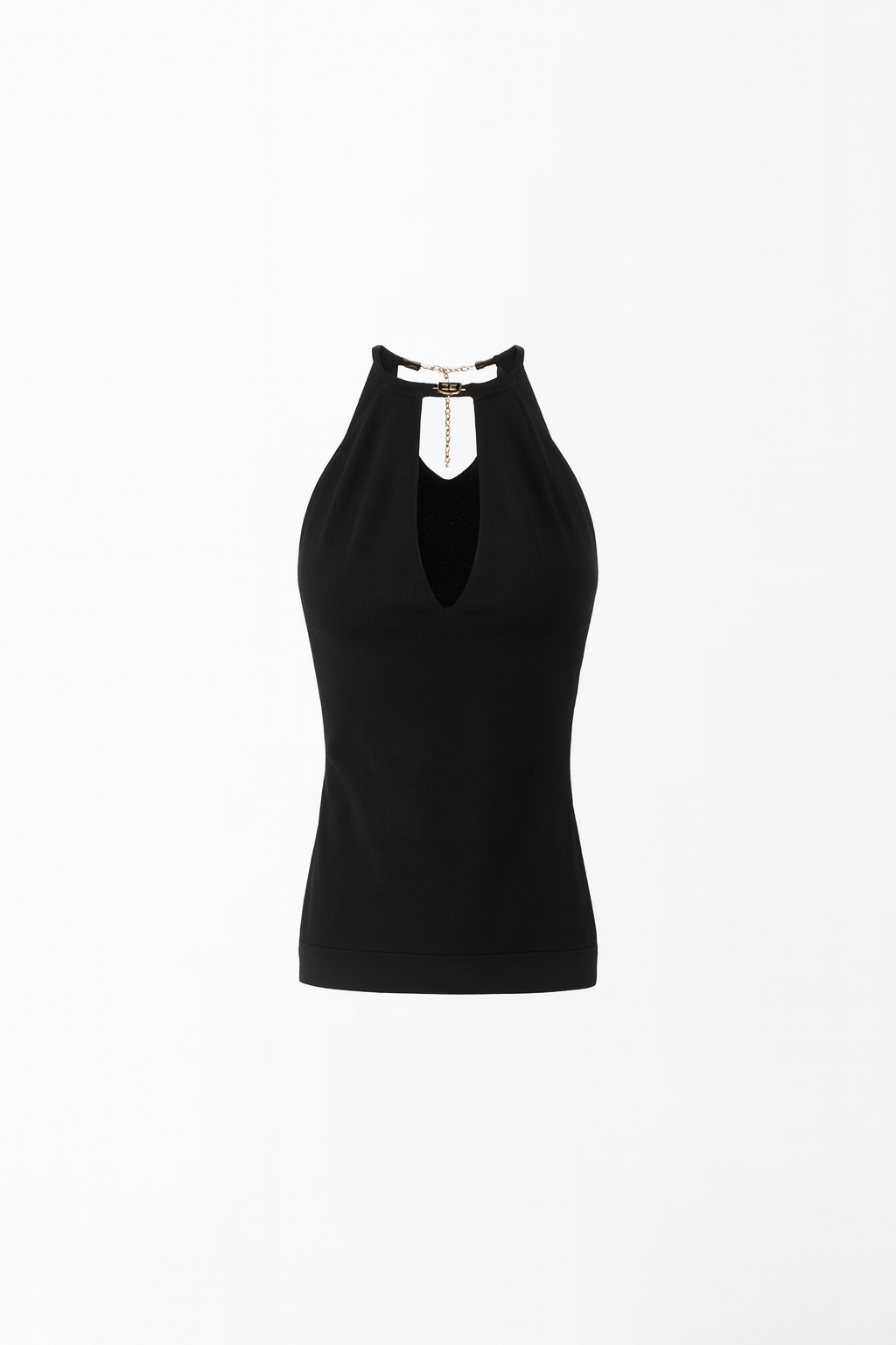 Un capo dal carattere deciso che esprime femminilità attraverso linee essenziali e dettagli preziosi. Questo top Elisabetta Franchi è realizzato in maglia stretch dalla mano morbida, pensata per abbracciare la figura con eleganza e sensualità. Il punto focale del capo è lo scollo decorato da uno snake gioiello, un dettaglio scenografico che richiama i codici iconici della maison, aggiungendo una nota brillante e misteriosa a un design altrimenti pulito.È il tipico pezzo che sa trasformare un look con un solo gesto: indossalo con un pantalone palazzo o una gonna midi e l'effetto sarà immediatamente sofisticato e glamour. Il top si presta anche a essere portato sotto un blazer aperto per occasioni più formali, lasciando intravedere il dettaglio gioiello con discrezione e stile. Grazie alla sua costruzione minimale ma d'impatto, è ideale per chi desidera aggiungere un tocco di carattere al guardaroba senza rinunciare all’eleganza. Che tu lo scelga per una cena, un evento serale o un aperitivo, sarà sempre il dettaglio che fa la differenza.