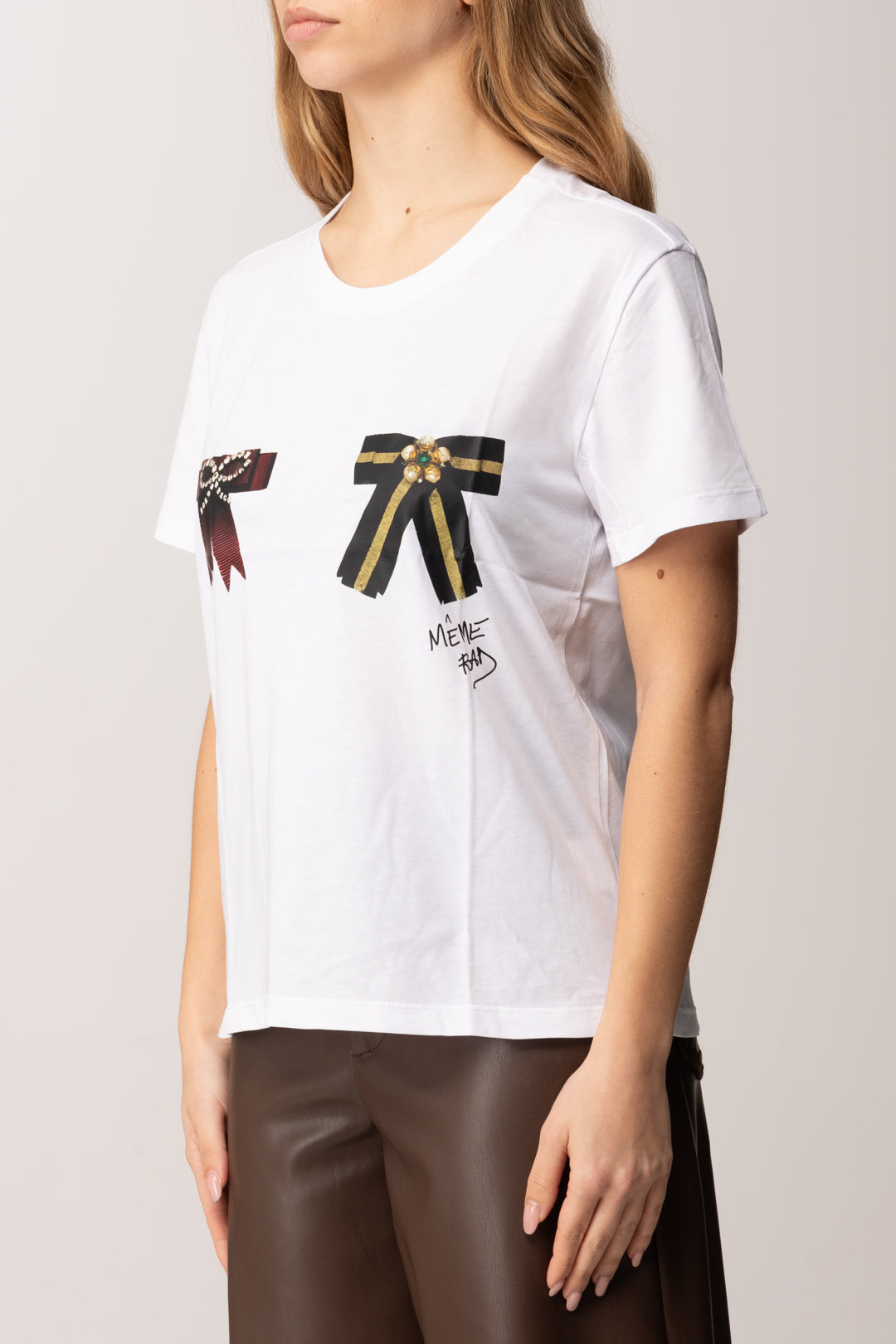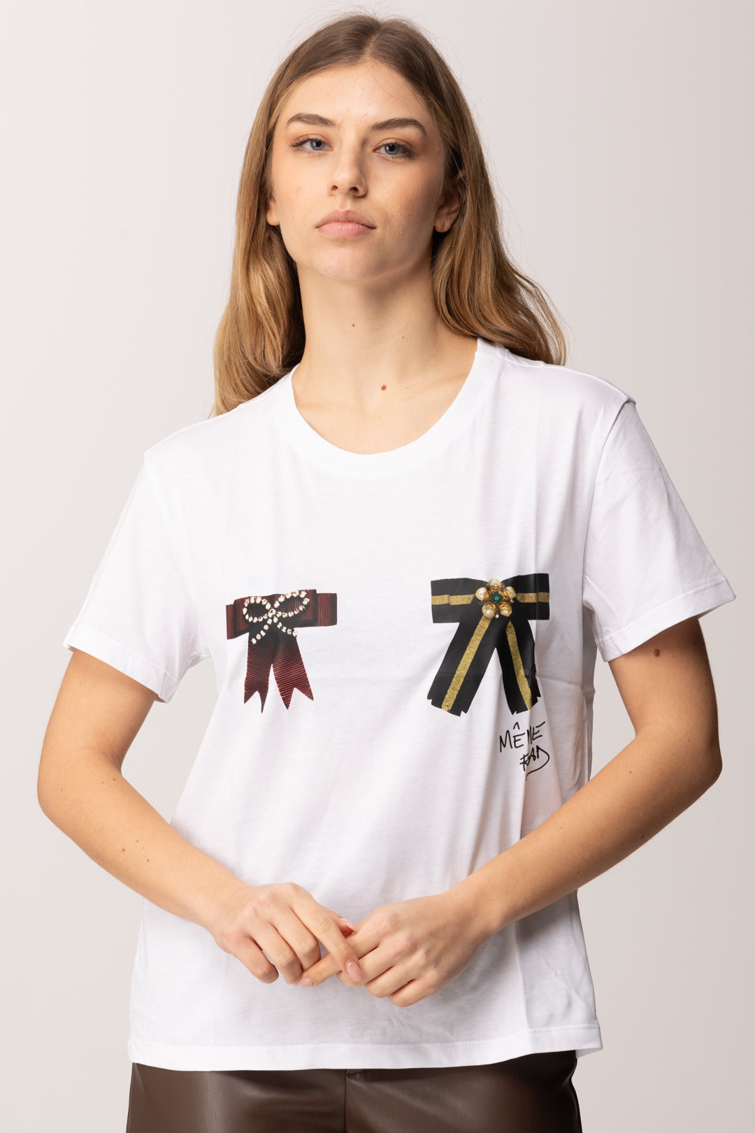 Essenziale ma con un twist ironico, questa t-shirt Meme Road reinventa il classico capo daily con un dettaglio grafico che cattura subito lo sguardo. La base in cotone leggero garantisce comfort e vestibilità naturale, mentre i fiocchi stampati sul davanti introducono un contrasto visivo deciso, giocando tra femminilità e spirito contemporaneo. Un capo che non ha bisogno di eccessi per farsi notare, ma che lavora sui dettagli per distinguersi.