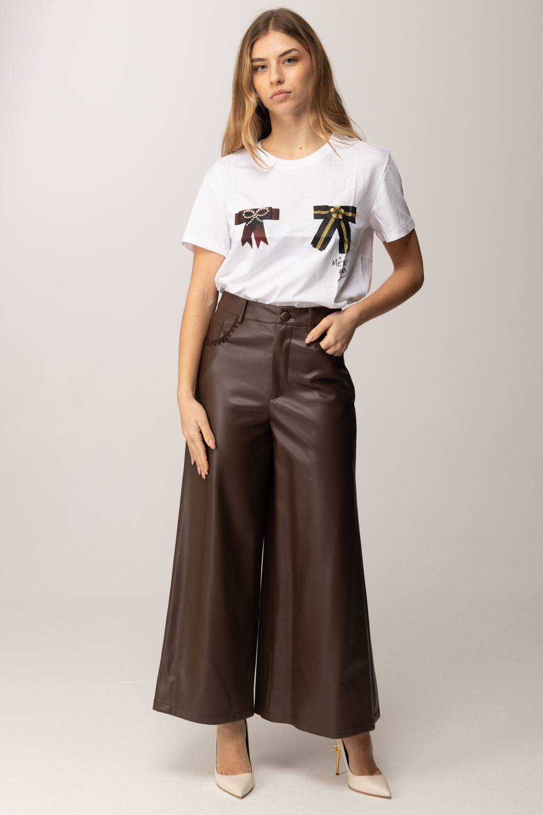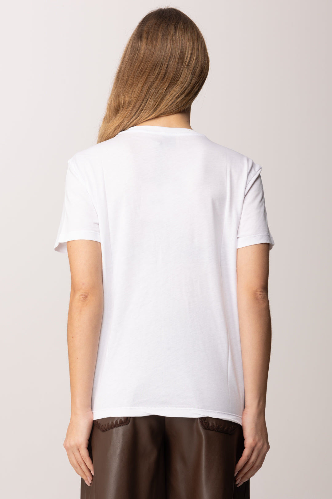 Il fit è pulito e versatile, pensato per adattarsi facilmente a silhouette diverse senza costringere. La linea semplice rende questa t-shirt una base affidabile per look quotidiani, mentre il motivo decorativo aggiunge personalità anche agli outfit più minimal. È il classico capo che puoi indossare senza pensarci troppo, ma che cambia subito il tono del look. Vuoi valorizzarla al massimo? Indossala infilata dentro pantaloni sartoriali o gonne fluide per un contrasto elegante, oppure lasciala morbida su denim e pantaloni in pelle per un’estetica più urbana. Funziona benissimo anche sotto blazer o cardigan leggeri, lasciando intravedere il dettaglio grafico sul davanti.