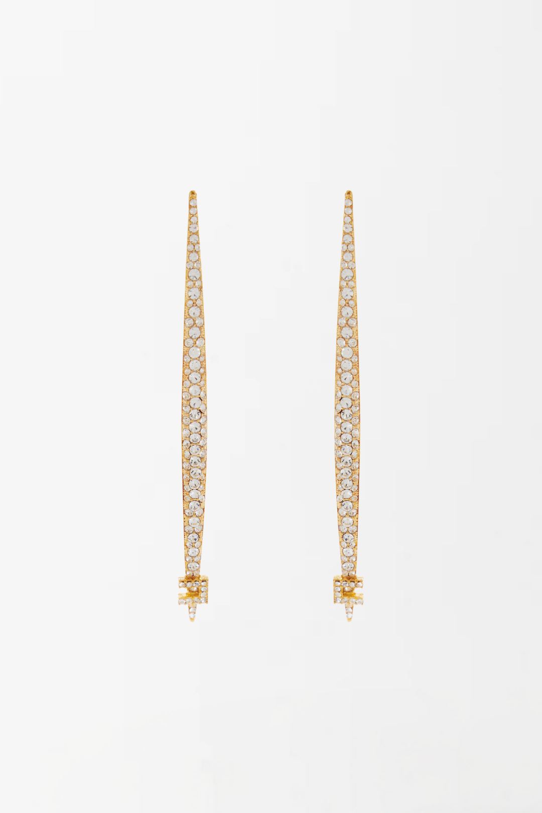 Un accessorio di pura luce, pensato per chi ama un’eleganza sottile ma scenografica: questi orecchini Elisabetta Franchi si distinguono per la loro silhouette affusolata e l’intera superficie ricoperta di strass, che catturano la luce a ogni movimento. Lunghi e sottili, slanciano il collo e donano verticalità al volto, rendendoli perfetti per completare outfit da sera o per aggiungere un tocco sofisticato anche a un look più sobrio. L’effetto che creano è quello di una cascata brillante, discreta ma indimenticabile. Il dettaglio iconico del logo alla base del pendente sigla l’identità del brand in modo raffinato, come una firma luminosa. Indossali con un abito monospalla o con un completo sartoriale: sapranno valorizzare ogni scelta stilistica con classe e personalità, diventando il fulcro visivo del look senza sovrastarlo.