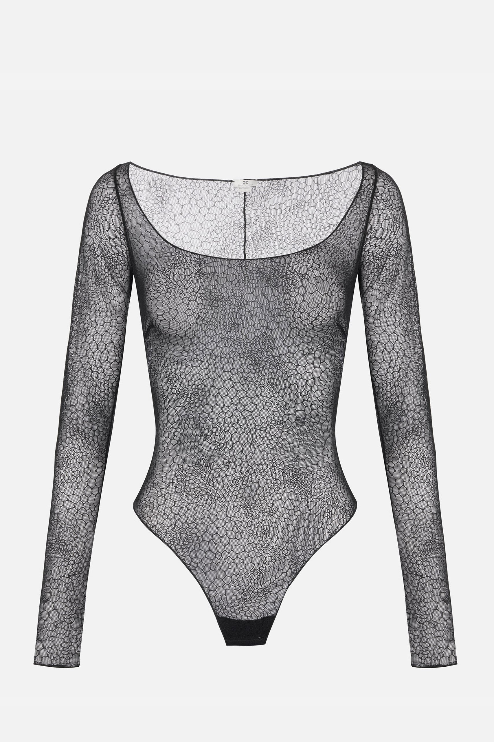 Un capo seducente e sofisticato pensato per lasciare il segno con eleganza. Questo body Elisabetta Franchi è realizzato in tulle jacquard che riproduce una raffinata fantasia snake, capace di catturare la luce con leggerezza e ammaliare con la sua trasparenza di fondo. La silhouette slim fit valorizza la figura mentre le maniche lunghe slanciano le braccia, infondendo un senso di stile "second-skin". Il colletto a girocollo chiude il design con rigore, mantenendo il corpo al centro della scena.