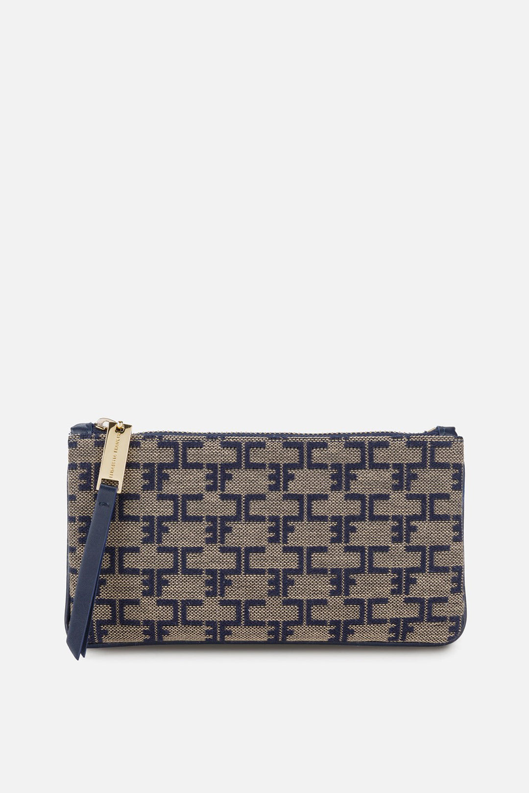 Bustina Elisabetta Franchi realizzata in iconica tela monogram jacquard, un accessorio compatto e sofisticato che racchiude l’essenza estetica della Maison in una forma essenziale ma di forte impatto visivo. Il motivo all-over, grafico e riconoscibile, dona carattere al design e rende questa bustina immediatamente distintiva.