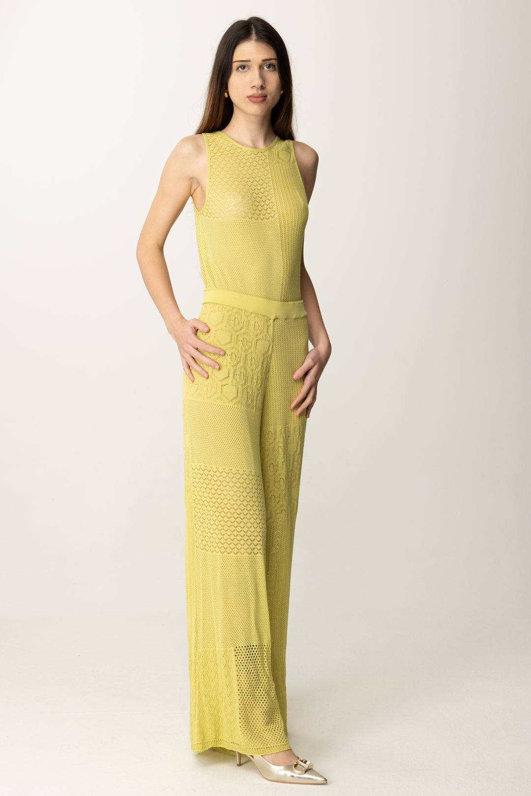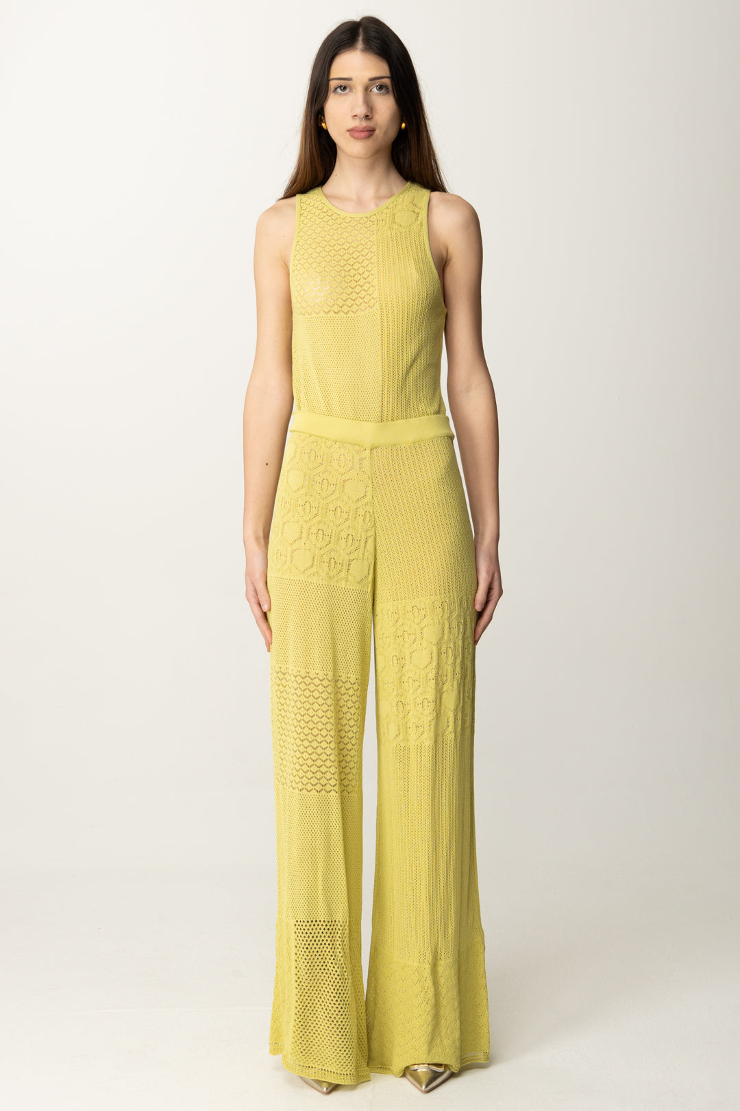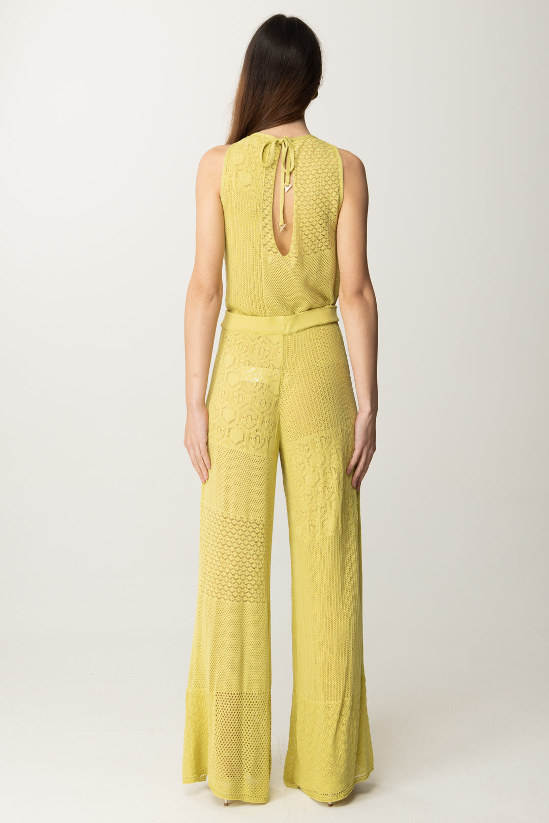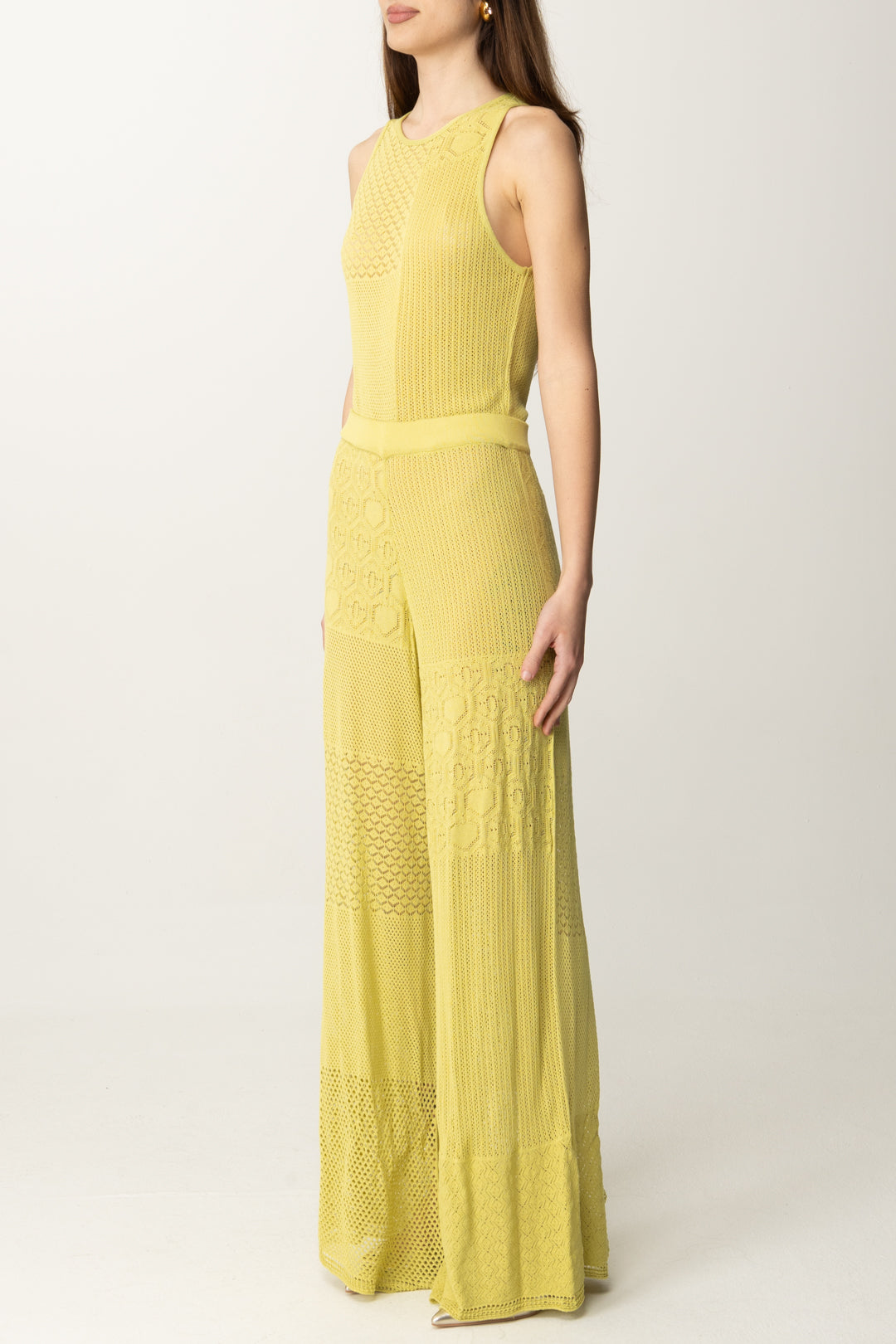 Tuta Akep smanicata dal design patchwork in maglia traforata e lavorazioni geometriche. Effetto seconda pelle con un tocco boho-chic. Perfetta con sandali nude e orecchini statement per un look sofisticato ma rilassato.