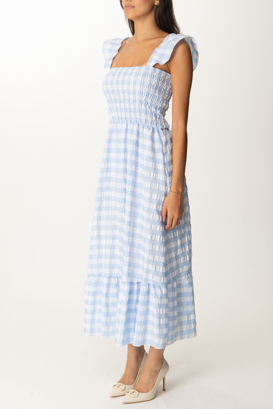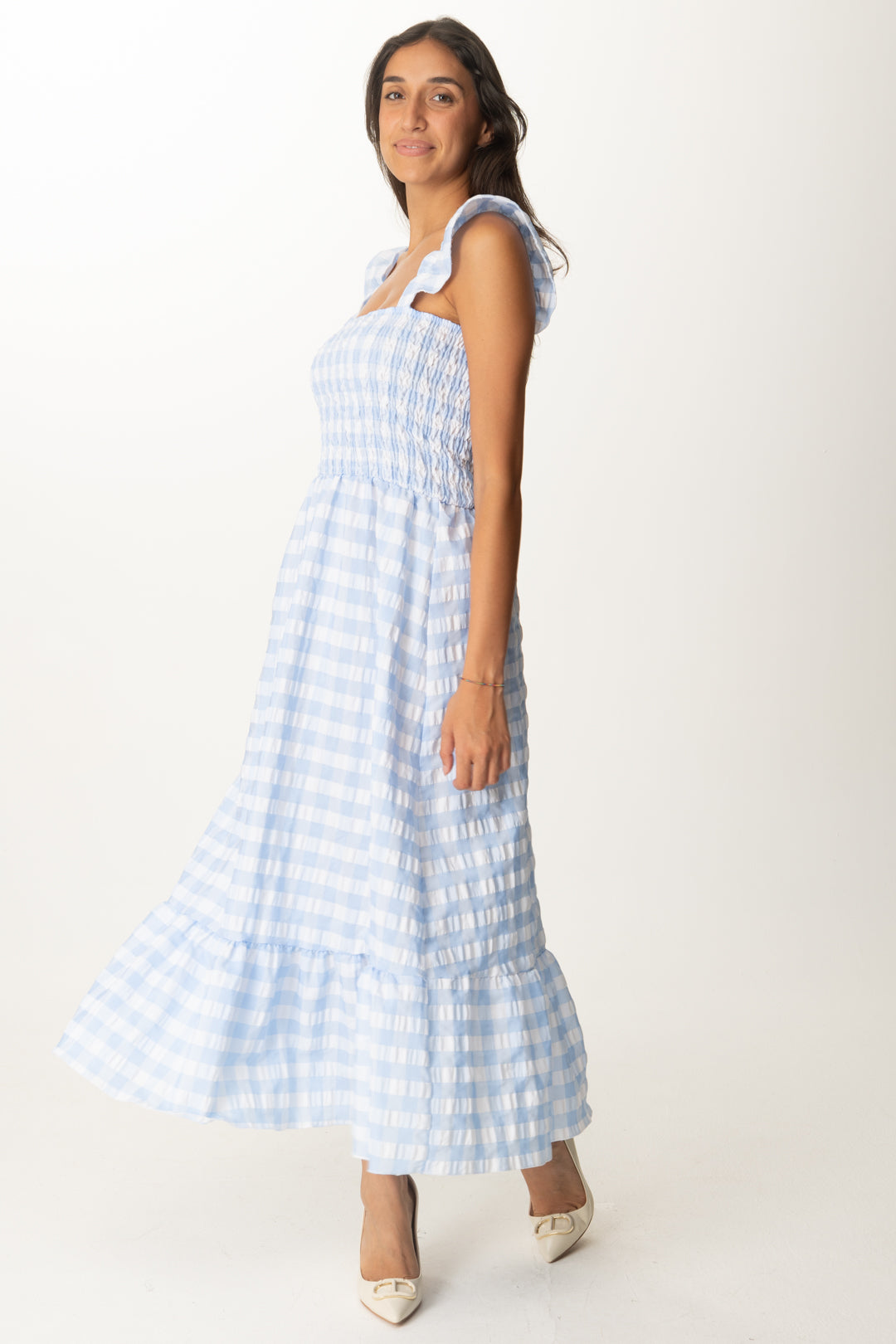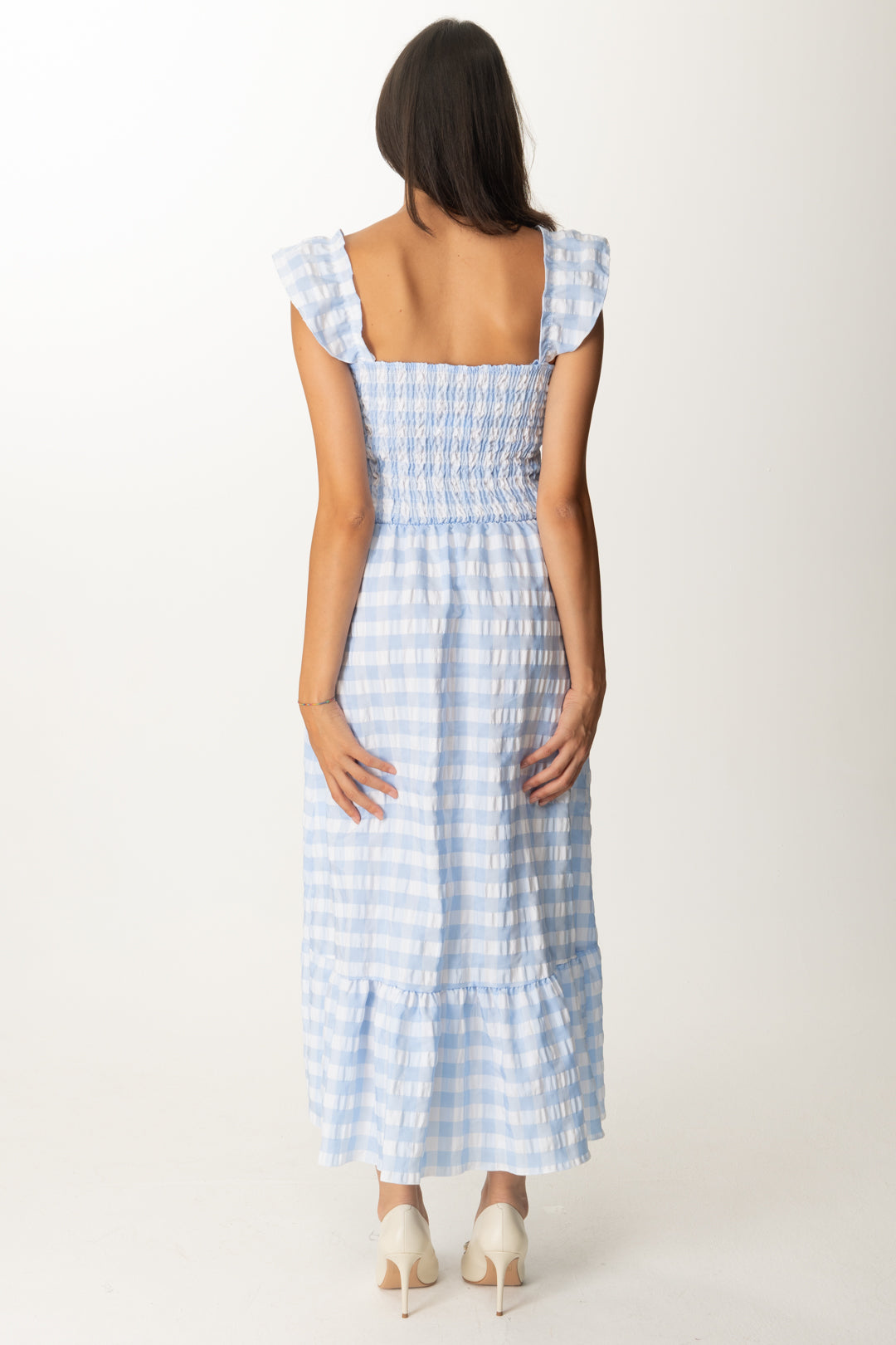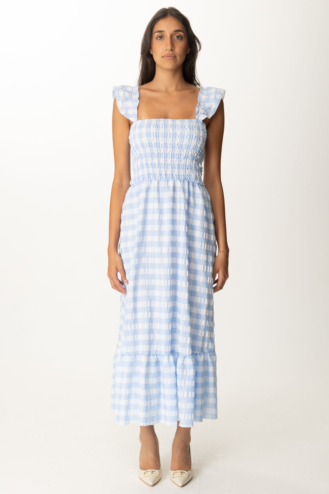 Delizioso abito Khloefemme pensato per accompagnarti nelle giornate più luminose con stile e leggerezza. Realizzato in un tessuto stampato a righe vichy, si distingue per la lavorazione smock sul corpetto e per il dettaglio romantico della balza al fondo. Le spalline con volant aggiungono un tocco femminile e giocoso, valorizzando la scollatura squadrata sia sul fronte che sul retro. Il fit morbido e il tessuto arioso rendono questo abito comodo da indossare anche nelle giornate più calde.