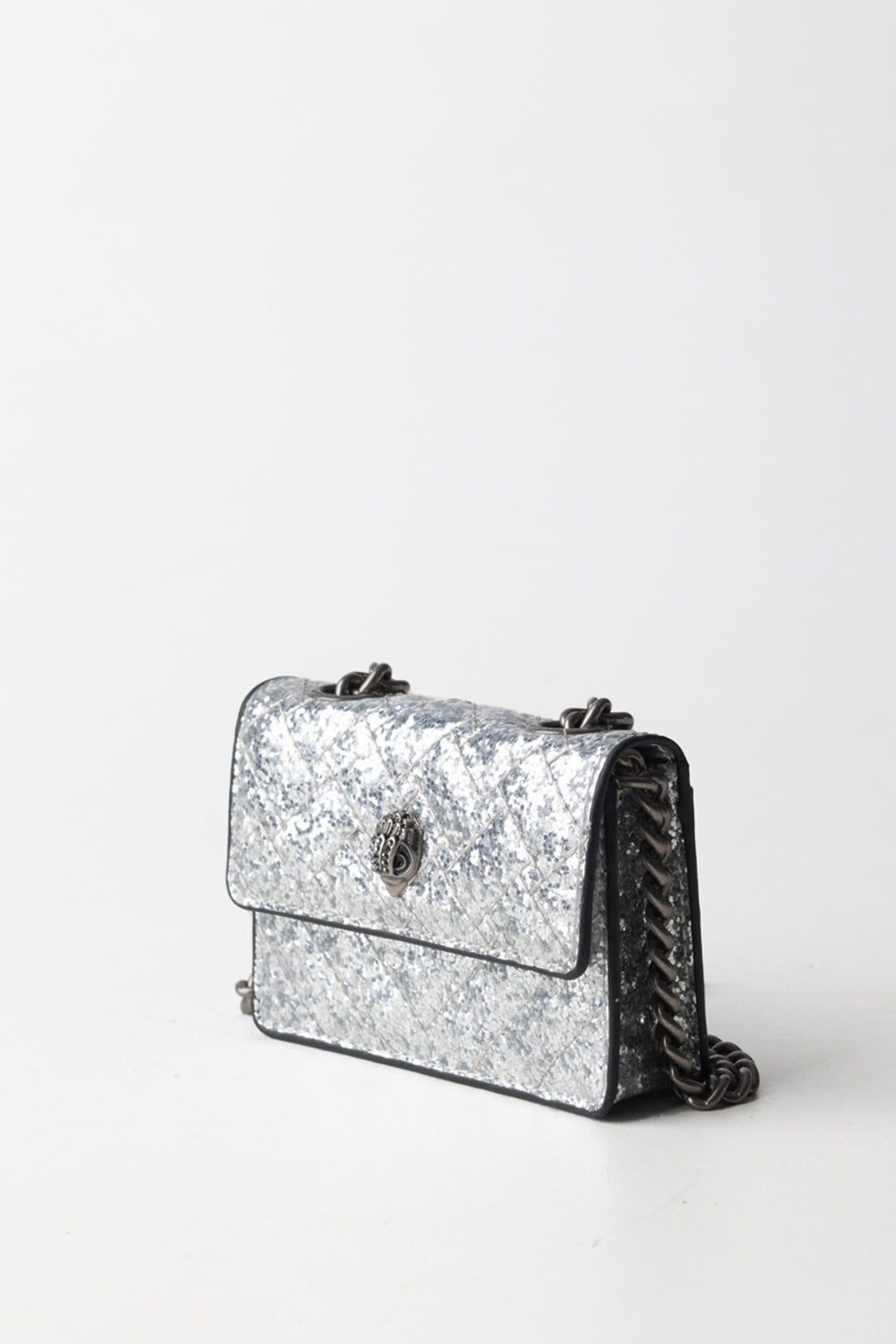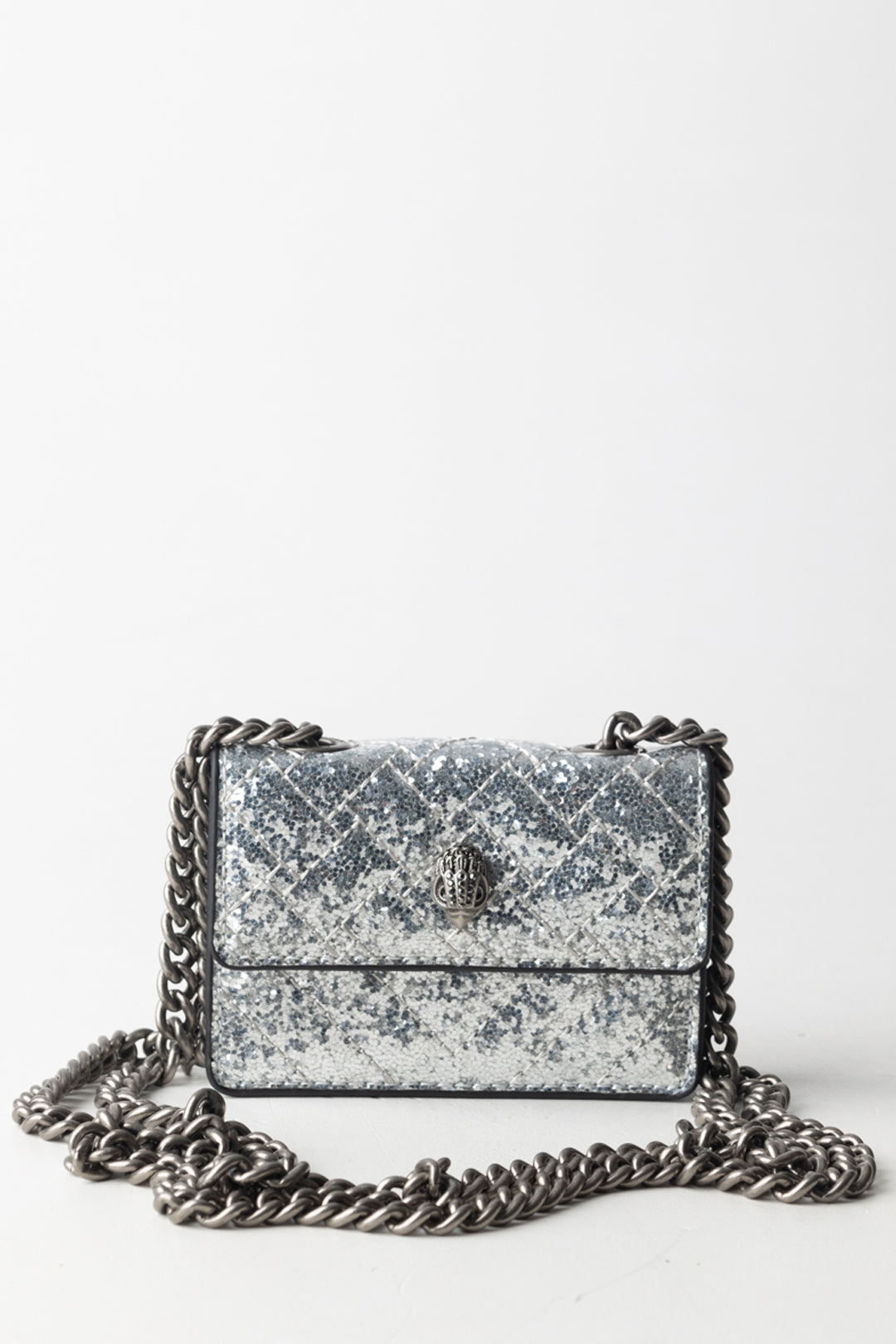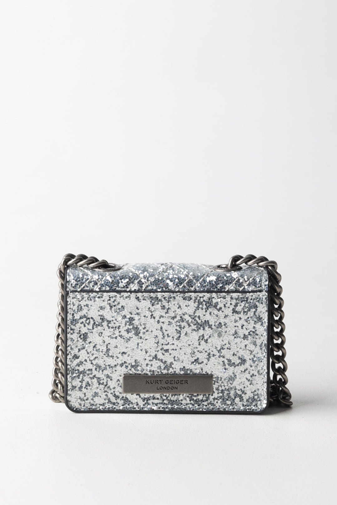 Borsa Kurt Geiger Micro Kensington in versione gioiello: un piccolo scrigno di luce che racchiude tutto il glamour firmato London. Realizzata in glitter rivestito in vinile, presenta impunture che combinano motivi a trama e a zig-zag, creando un effetto tridimensionale di grande impatto visivo. La patta è impreziosita dall’inconfondibile testa d’aquila in metallo argentato anticato, decorata con micro-cristalli multicolor e occhi di perline nere: un simbolo iconico che trasforma una mini bag in un autentico statement di stile.