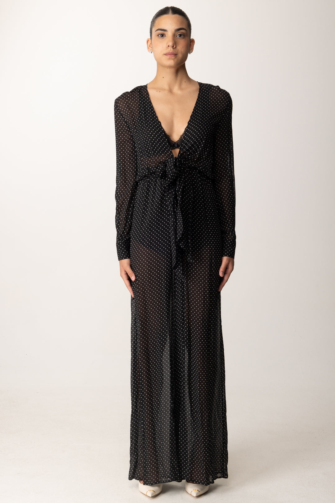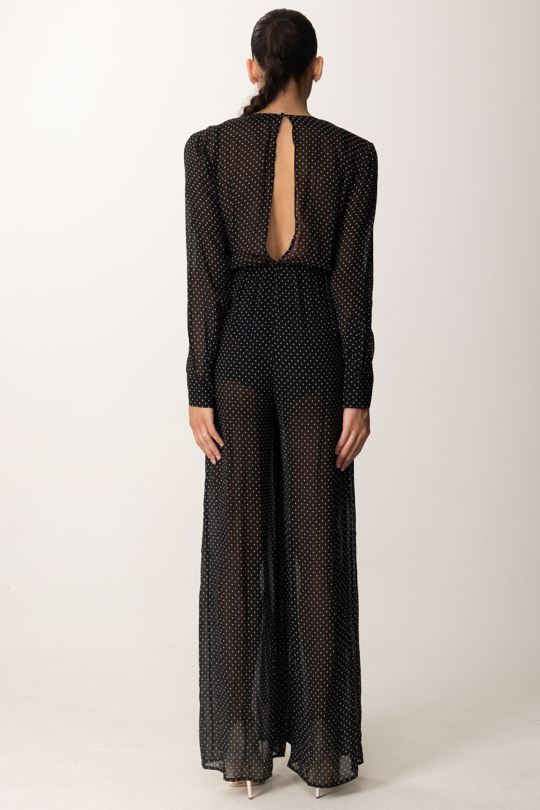 Design romantico e femminile per questa tuta lunga Aniye By caratterizzada da profonda scollatura a V frontale, gamba ampia e fluida, maniche lunghe con polsini e delicata stampa all over con un motivo evergreen come i pois. MAxi apertura a goccia sul retro, completa l'indieme un fiocco da annodare in vita come a creare un focus su questo punto cardine della tua silhouette. Perfetta per serate estive e da mezza stagione, con un bel tacco e un trucco elegante e sobrio.