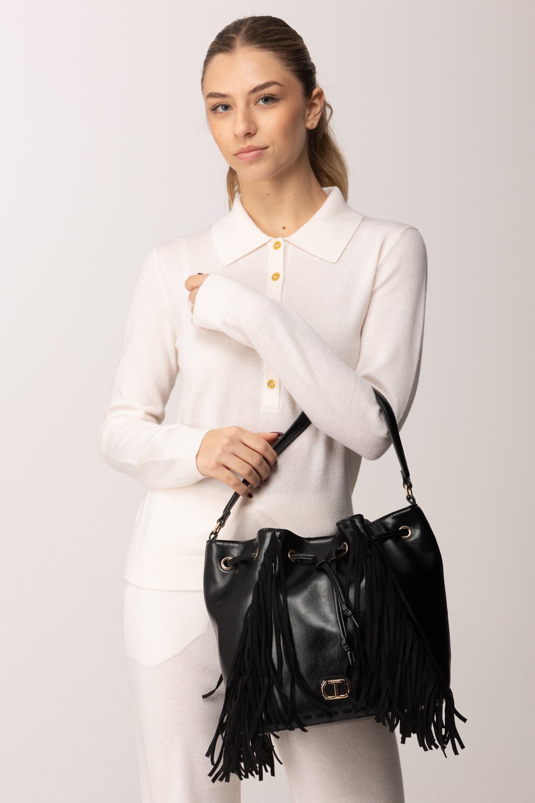 Tra le bag che presentano questa caratteristica di stagione, non poteva mancare questo formato: quindi eccoti una sfiziosa borsa a secchiello Twinset con il suo corredo di frange a renderla un accessorio cool e movimentato. Realizzata in materiale effetto pelle lucida con finitura elegante, presenta anche un dettaglio Logo Oval T in metallo sul fronte e una chiusura arricciata con coulisse come accento non solo funzionale ma anche decorativo. Il plus? Il manico che ti permette di portarla sia a mano che a spalla.