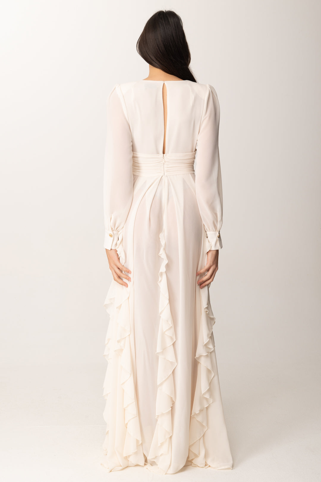 Arioso und ätherisch, super elegant: dieses abito Elisabetta Franchi, perfekt für Veranstaltungen auf dem roten Teppich, ist aus Georgette-Stoff gefertigt und zeichnet sich durch einen weiten V-Ausschnitt und Puffärmel aus, die seinen Charme betonen. Verziert mit aufgesetzten Rüschen und ausgestattet mit einem doppelten Schlitz auf der gonna, der der Silhouette Bewegung und Definition verleiht, während ein weiches Drapé sanft die Taille umschmeichelt: ein Traum in Kleidform, für deine Saison-Events.