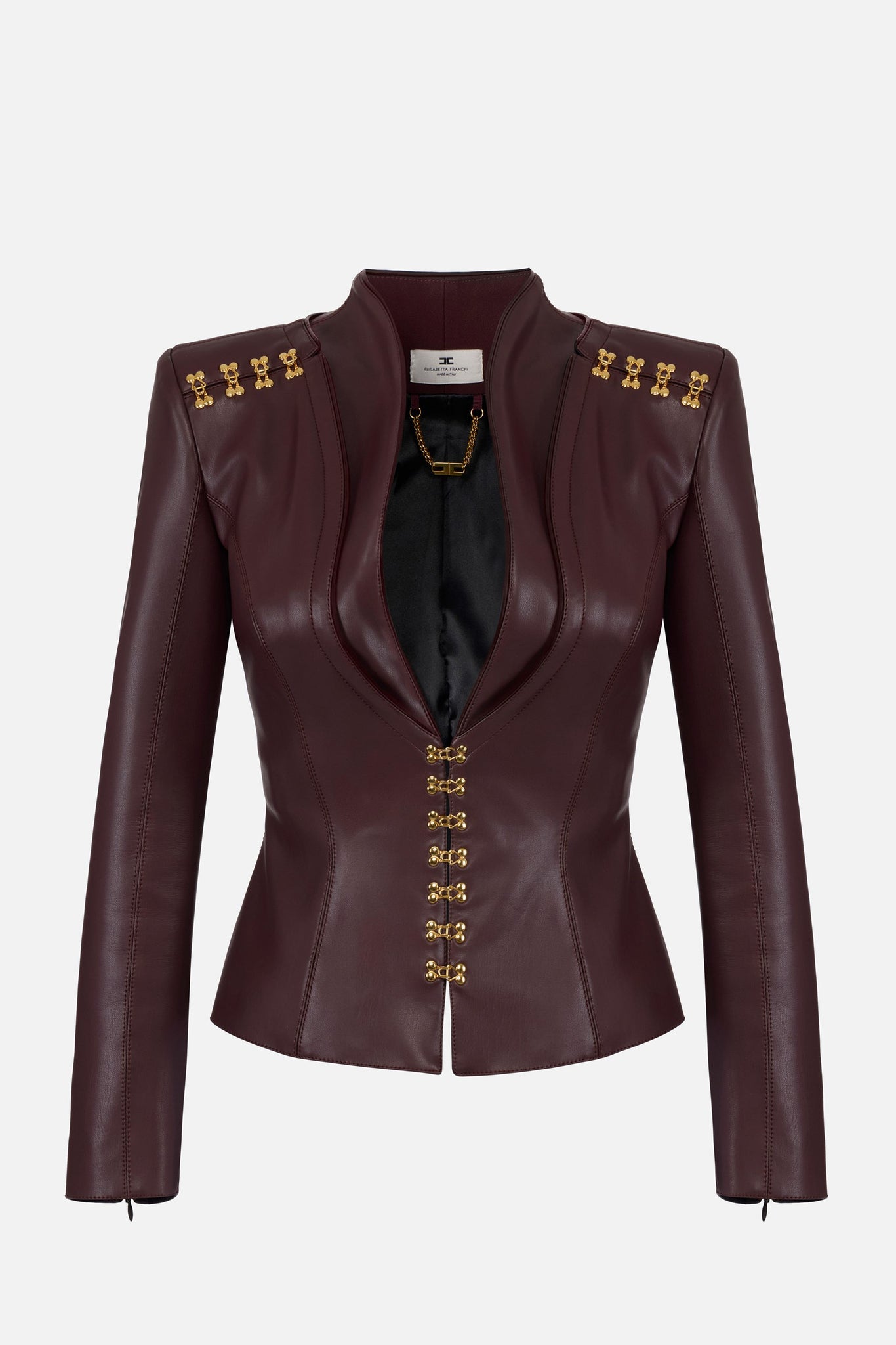 Konzipiert wie eine tragbare Skulptur, bringt diese Elisabetta Franchi Jacke aus synthetischem Material mit Lederoptik die Härte von Nappaleder mit der stilistischen Leichtigkeit des Modedesigns zusammen. Die strukturierten Schultern verleihen Präsenz, das geformte Revers umschließt das Dekolleté präzise, und der Kontrast des Paspelierens betont die Konturen mit visuellem Rhythmus. Das markante Element sind jedoch die goldfarbenen Metallhaken, die Schultern und Oberkörper mit Lichtakzenten schmücken und die Jacke zu einem städtischen Schmuckstück machen. Die schlanke Linie formt die Figur elegant, während die kurze Länge sie vielseitig macht, sodass sie sowohl über Röcken als auch über Hosen getragen werden kann.
