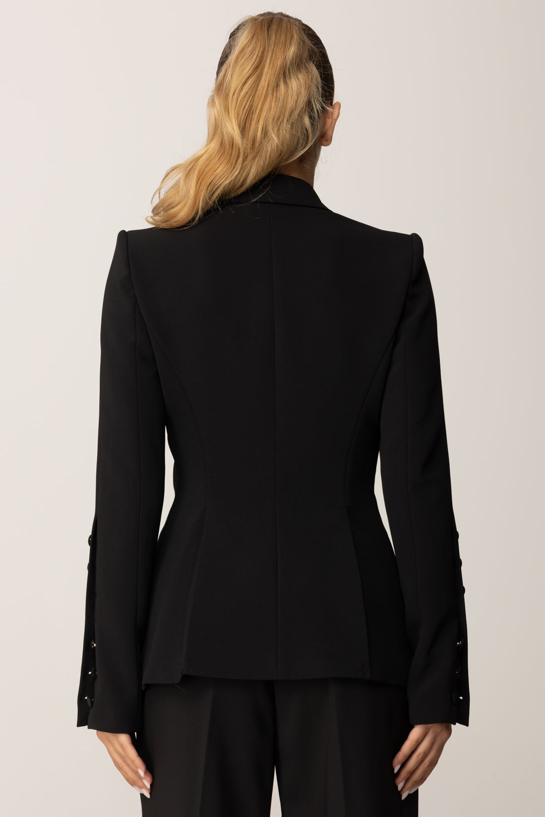 Zeitlose Eleganz mit einem zeitgenössischen Akzent: Diese Elisabetta Franchi Jacke aus leichtem Crêpe ist vom Herren-Tuxedo inspiriert und interpretiert ihn mit femininen, klaren Linien neu. Die schmale Passform mit betonten Hüften und Taillenlinie betont die Figur, ohne sie einzuschränken, während die glänzenden Satin-Revers einen dezenten Helligkeitsakzent setzen. Die strukturierten Schultern mit Polsterung verleihen Haltung, während die hohen Schlitze an den Ärmeln mit Druckknöpfen ein unerwartetes Detail bieten, das einem klassischen Stück Modernität verleiht. Der einreihige Verschluss mit tonalen Knöpfen vervollständigt das Design und macht dieses Kleidungsstück zu einem vielseitigen Begleiter für Tag und Abend.
