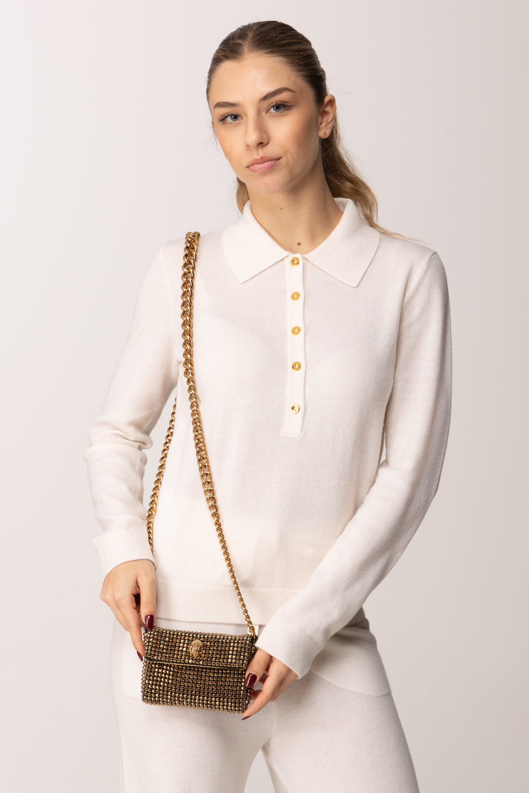 Kurt Geiger Tasche Mini-Partybag, ein Schmuckstück, das Handwerkskunst und dramatischen Charakter vereint. Die Außenseite ist vollständig mit einem dichten Muster aus goldenen Kristallen bedeckt, die auf einem weichen Untergrund appliziert sind und das Licht bei jeder Bewegung einfangen und reflektieren. Die Frontklappe ist mit dem ikonischen goldenen Adlerkopf verziert, dekoriert mit Mikrokristallen, dem unverwechselbaren Markenzeichen.