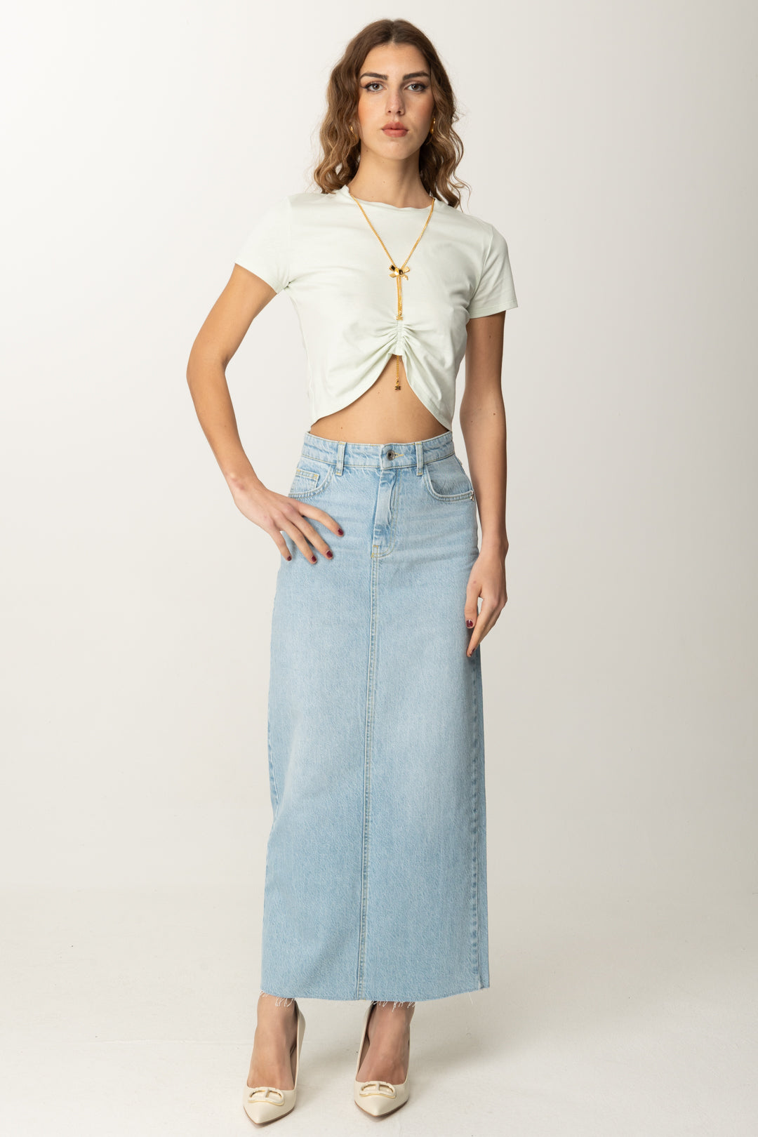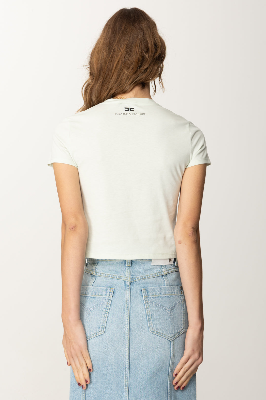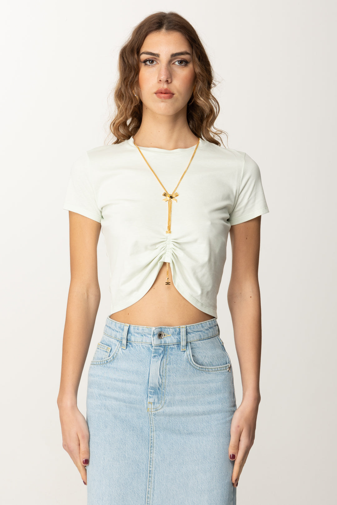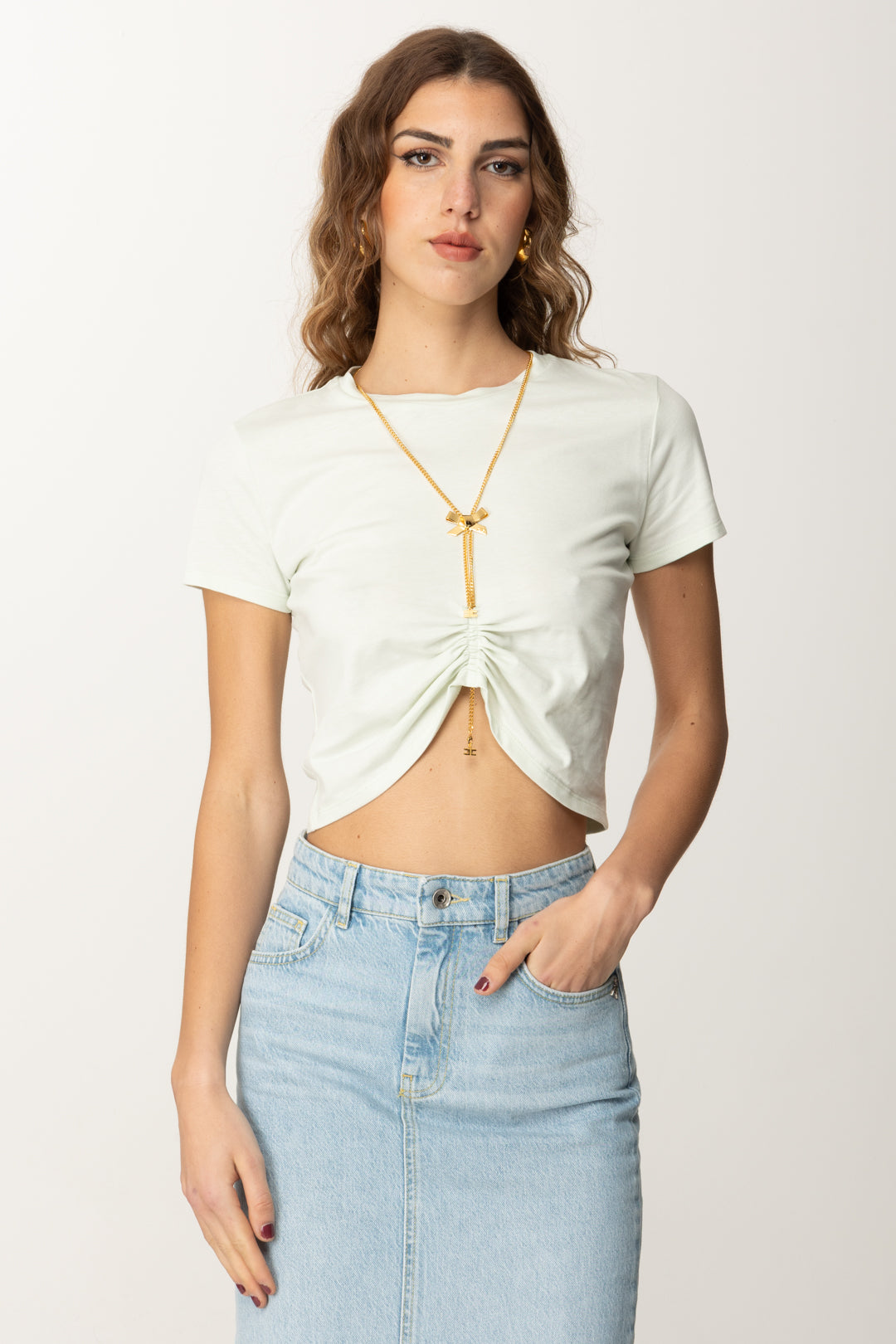T-shirt Elisabetta Franchi veredelt mit typischen Details der Marke, angefangen mit der vorderen Raffung, die den Crop-Schnitt betont, bis hin zum Halsketten-Accessoire mit Anhänger, das auch in dieser Kollektion häufig vorkommt. Ein feminines und vielseitiges Kleidungsstück, frisch und ideal für die Saison.