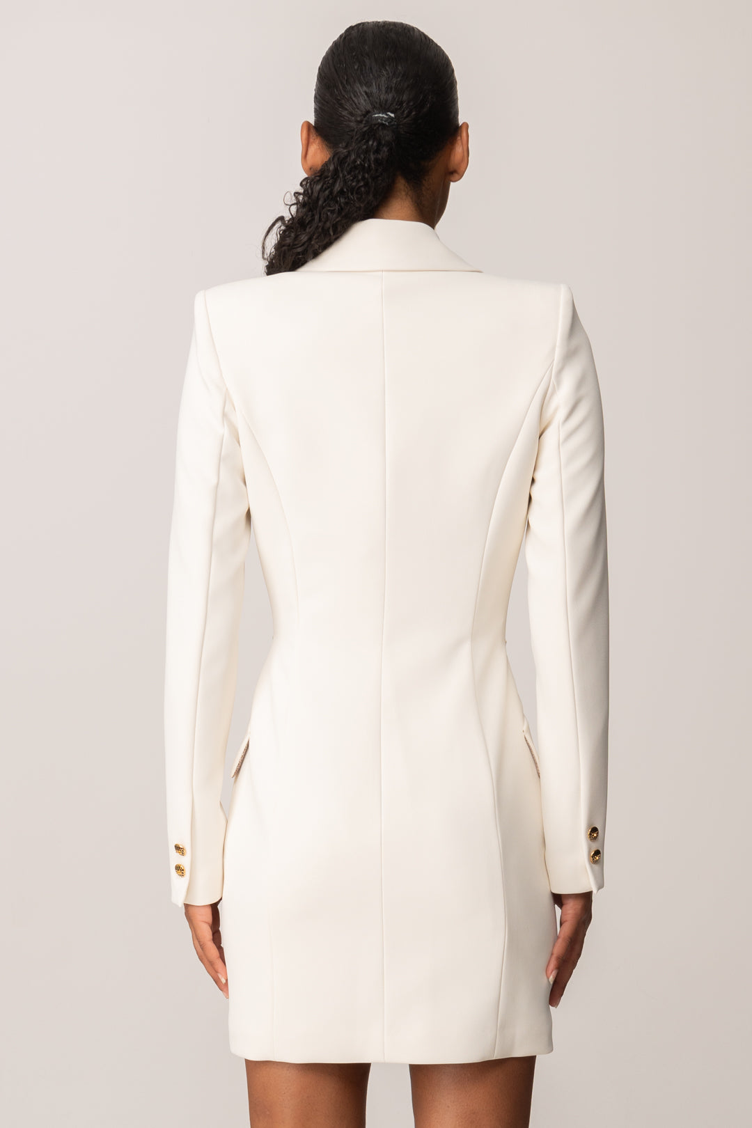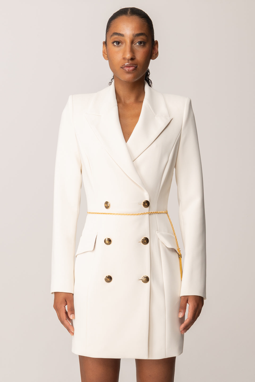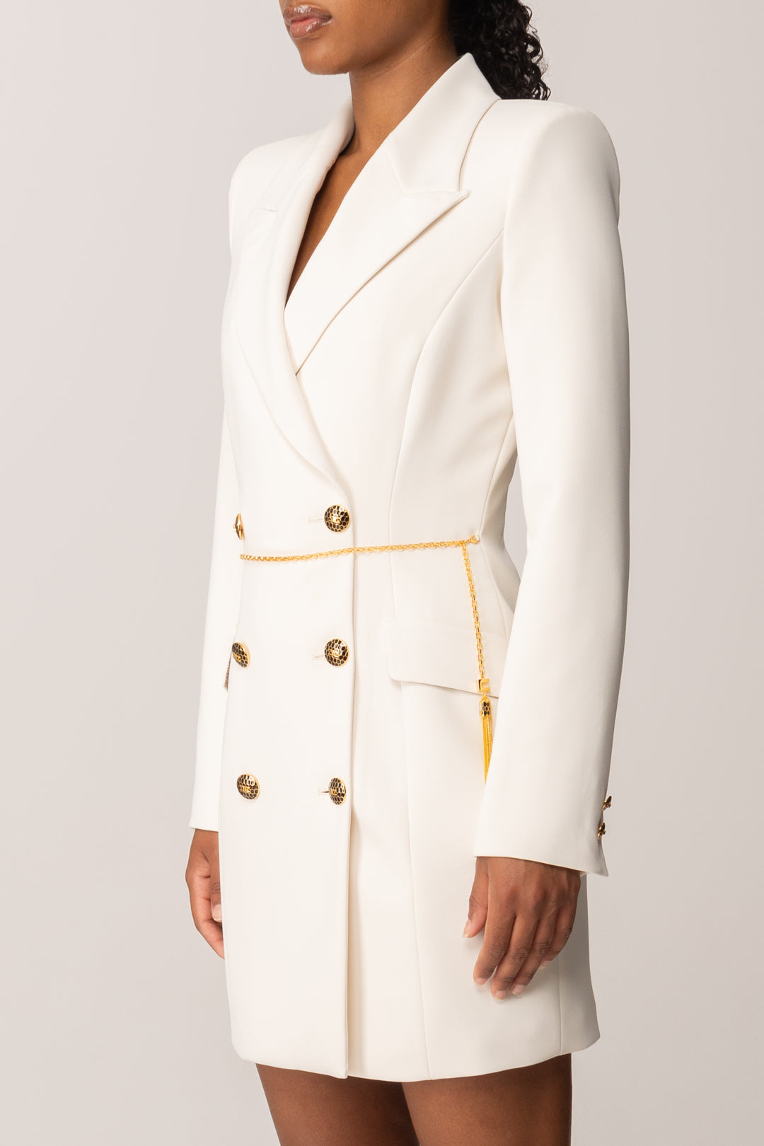 Ein klassisches Kleidungsstück der Marke, neu interpretiert in der Saisonpalette: das typische abito robe manteau Elisabetta Franchi, gedacht, um dich wie ein maßgeschneiderter Blazer zu kleiden, aber mit der Weiblichkeit eines Mini-Kleides. Klare Schultern, spitze Revers und Doppelreihe erinnern an präzises Tailoring, während der Gürtel die Taille mit einer Schmuckkette im Snake-Muster und Quaste betont, ein wertvolles Detail, das bei jedem Schritt das Licht einfängt.