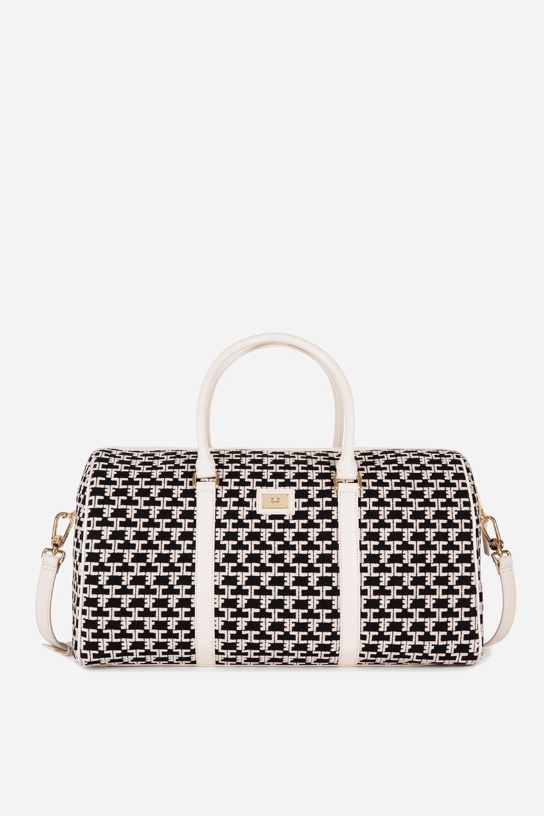 Quando stai preparando un breve viaggio o un fine settimana nel segno dello stile, questo borsone weekender firmato Elisabetta Franchi diventa il compagno perfetto. La sua silhouette ampia e la preziosa chiusura a zip consente di ospitare l’essenziale ma anche qualche extra, senza rinunciare al carattere deciso che contraddistingue il monogram della maison. Maxi manici in pelle per il trasporto a mano, e tracolla rimovibile di supporto.