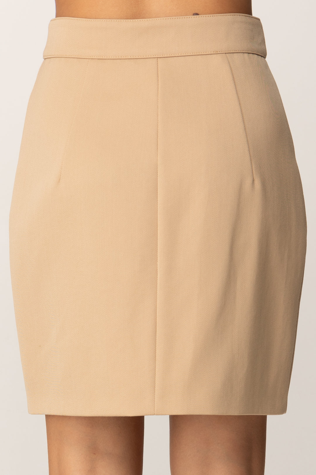 Minigonna Elisabetta Franchi mit einem classy-chic Flair, perfekt, um feminine Kombinationen zu kreieren, die nie an Eleganz verlieren. Das Modell mit Wickelverschluss verfügt über einen originellen Verschluss mit einem logierten Drehknopf, ein Detail, das einen kleinen vorderen Schlitz schafft, und ist mit seitlichen Taschen mit goldfarbenen Zierknöpfen versehen. Hohe Taille, umschließt die Hüften ohne zu viel Enge für ein frisches Design und angenehmen Tragekomfort.