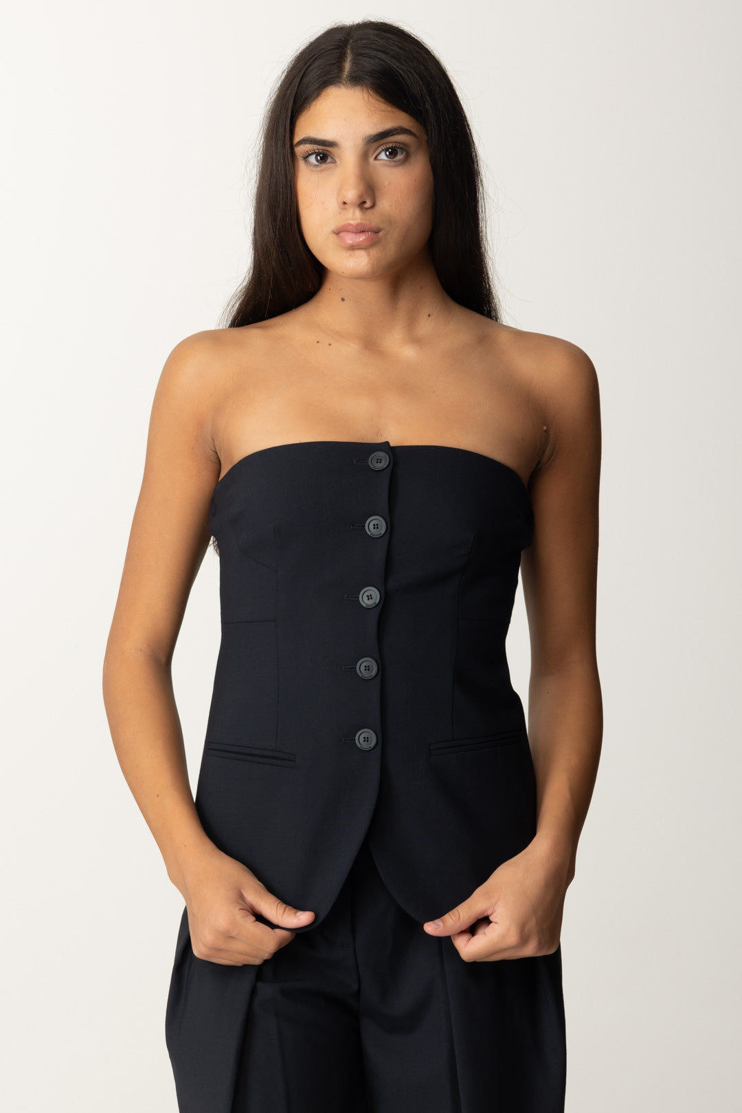 Im Einklang mit einem der vielen Trends der Saison ist dieses Semicouture-Oberteil aus frischer Wolle wie eine Weste gefertigt, kann aber auch allein getragen werden, wobei die durch den Bandausschnitt freigelassenen Schultern voll zur Geltung kommen kombinierbar mit Blusen und Shirts – sogar Maxi! - für einen Endeffekt im absoluten Wildfang-Stil und gleichzeitig äußerst feminin. Und Sie, haben Sie sich bereits entschieden, ob Sie diesen Trend annehmen wollen? Beginnen Sie hier!
