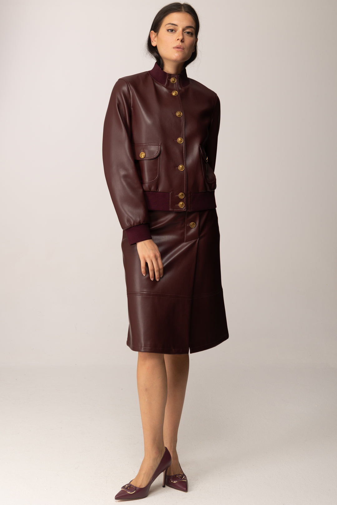 Ein Kleidungsstück, das Kraft und Raffinesse vereint: dieser gonna longuette Twinset aus beschichtetem Stoff mit Lederoptik besticht durch seine leicht ausgestellte Silhouette im Midischnitt und die vordere Fake-Öffnung, betont durch Oval?T-Logoknöpfe. Die Schnitte sind mit doppelten Steppnähten veredelt, die die Linie hervorheben, während der vordere Schlitz visuelle Dynamik verleiht und die Bewegung erleichtert. Der seitliche, unsichtbare Reißverschluss sorgt für eine saubere und elegante Passform.