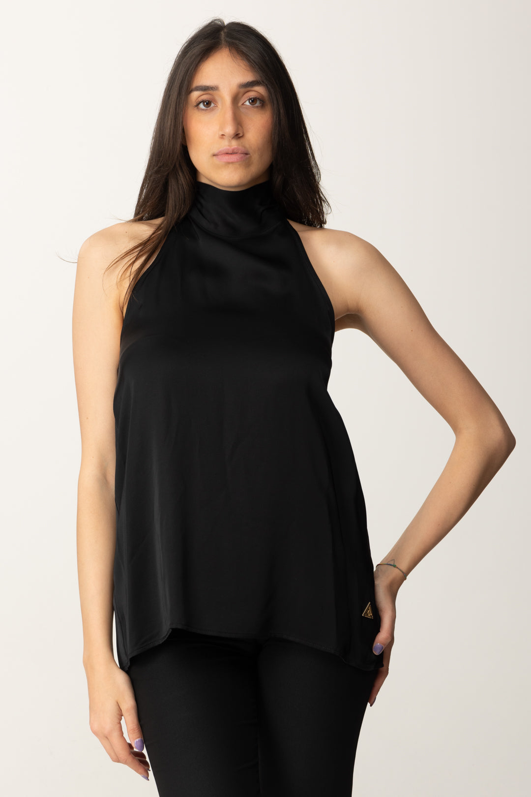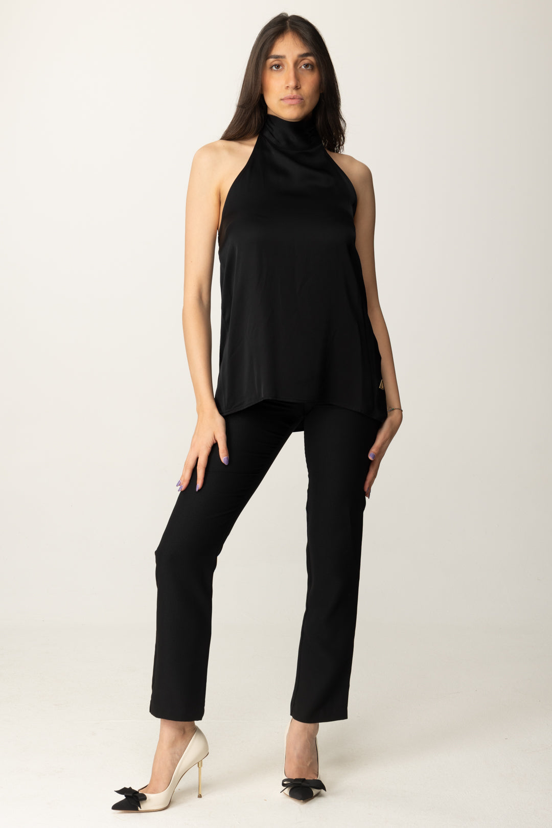 Slim fit, lightweight and super elegant. This Top Akep features a high neck that gives a contemporary touch and a chic scarf that makes it perfect for special evenings. To be worn with statement earrings and cigarette pants for a refined cocktail look.