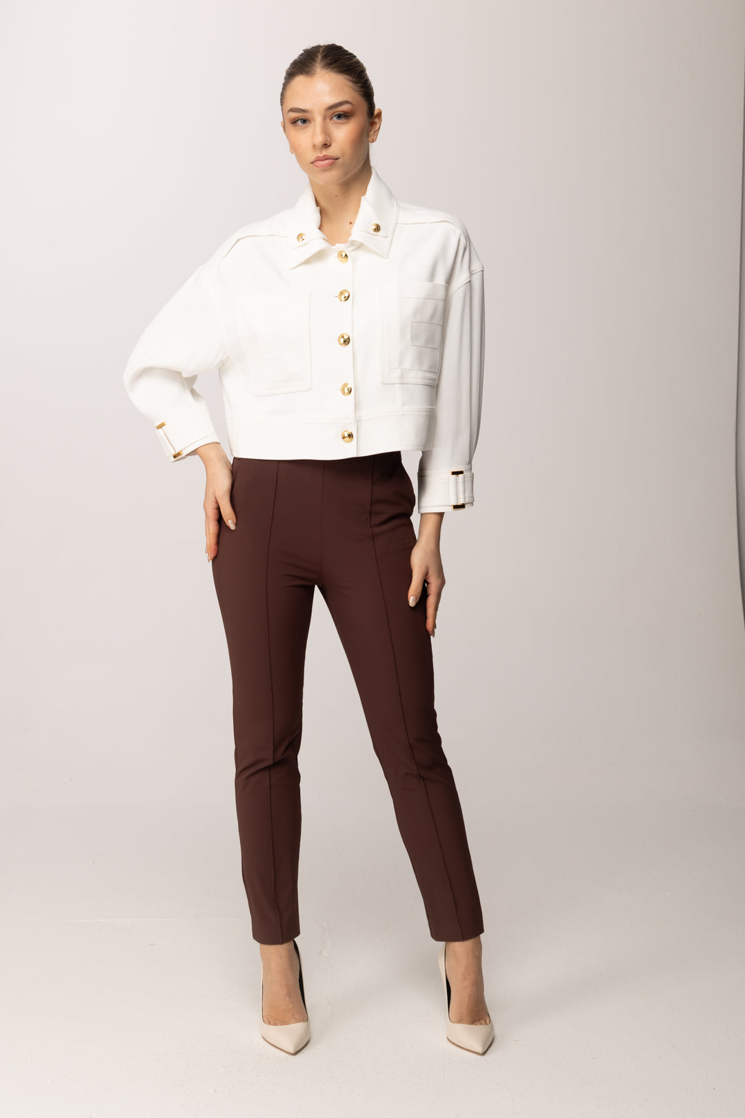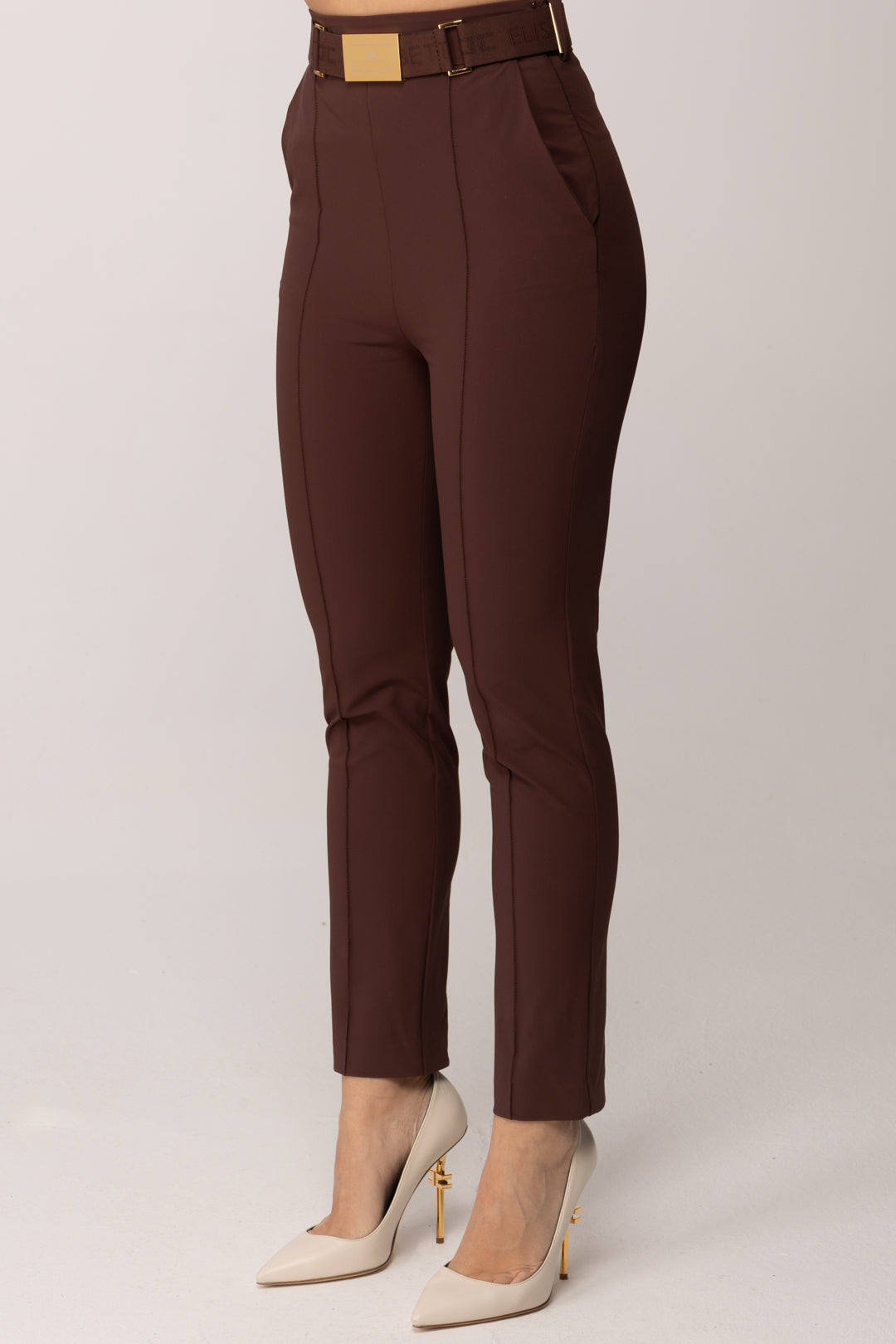 Un paio di pantaloni in tessuto tecnico bielastico Elisabetta Franchi pensati per esaltare la silhouette con un fit aderente e dettagli contemporanei. Realizzati in un materiale tecnico elasticizzato che unisce comfort e performance, questi pantaloni presentano tasche alla francese e cuciture studiate per definire le linee del corpo con eleganza e modernità.