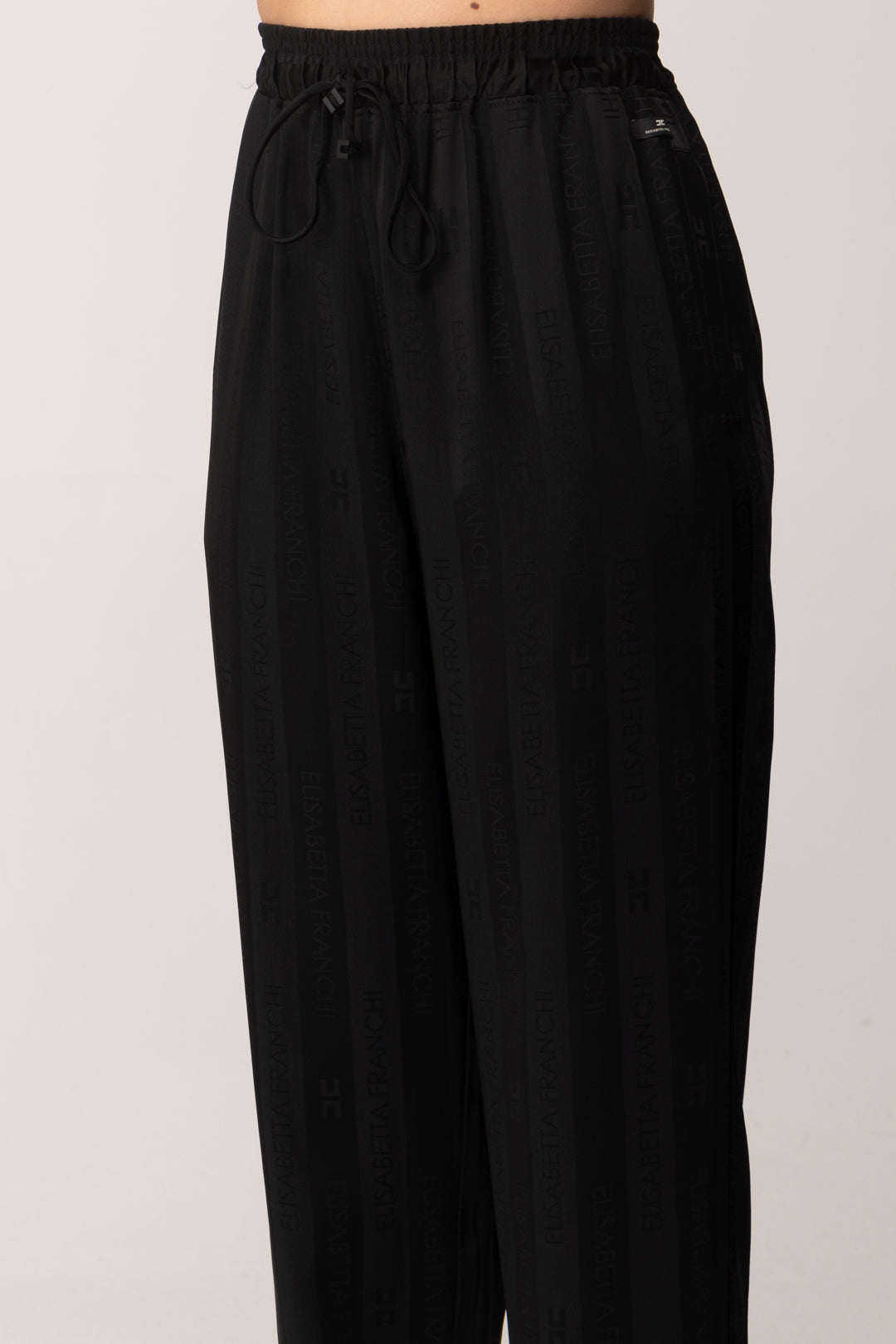 Un motivo ricorrente della collezione applicato anche nei bottom di stagione per creare super look al passo coi tempi: innamorati con noi di questi pantaloni Elisabetta Franchi e la loro texture unica e distintiva che rende moderna una silhouette classica e sartoriale. Realizzati in satin, la lavorazione jacquard dona profondità al tessuto senza appesantirlo, trasformando un capo essenziale in un elemento di stile per i tuoi outfit. L’elastico in vita con laccetto — impreziosito dai finalini con logo — aggiunge praticità e comfort, rendendo questi pantaloni ideali tanto per outfit da giorno eleganti quanto per combinazioni più ricercate e serali.