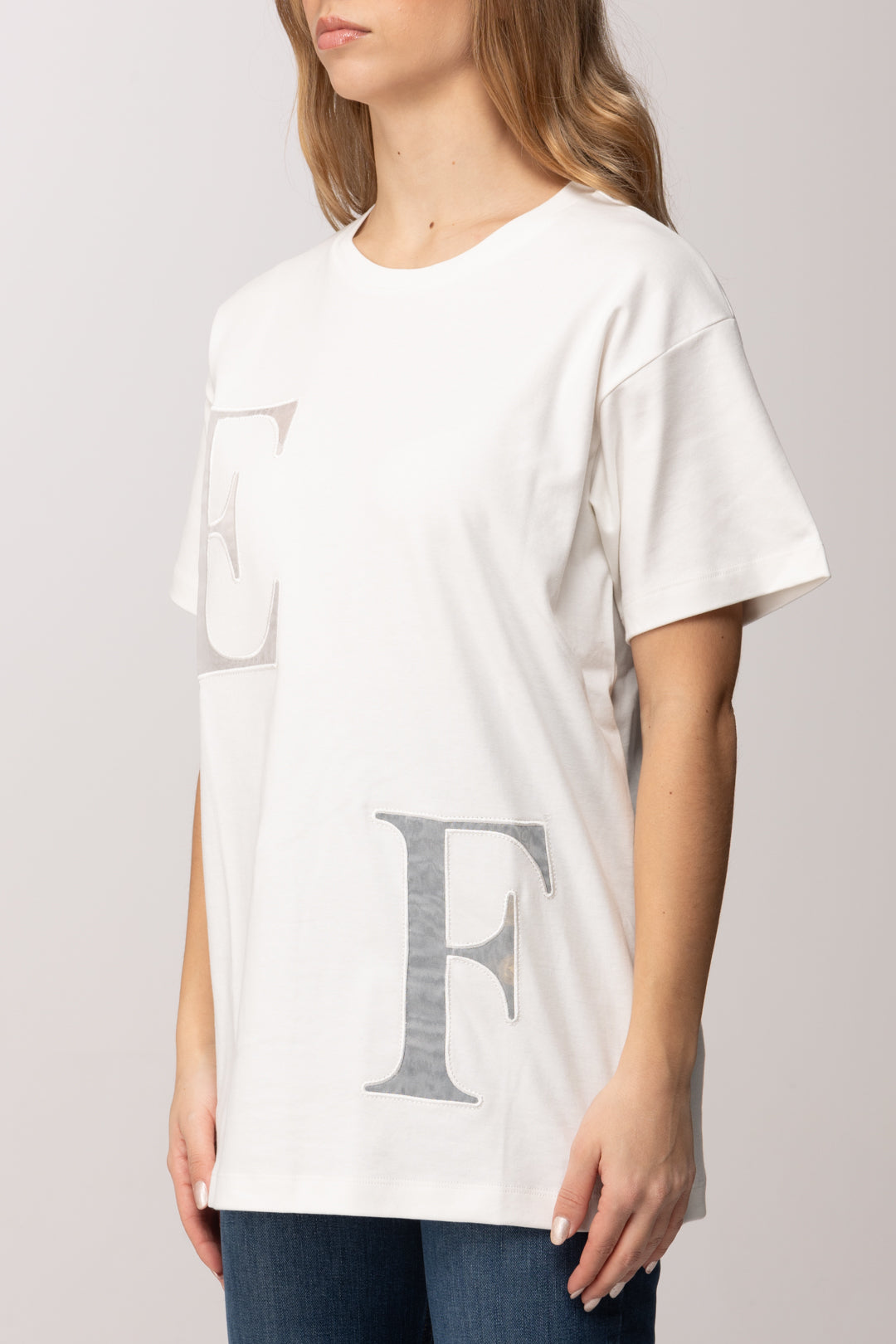 Il lettering frontale diventa elemento decorativo e segno di riconoscibilità, inserito con equilibrio per arricchire il design senza appesantirlo. Il gioco grafico crea un punto focale elegante, coerente con l’estetica del brand, che punta a una femminilità moderna, sicura e mai eccessiva. Un dettaglio che trasforma una t-shirt apparentemente semplice in un capo curato e ricercato.