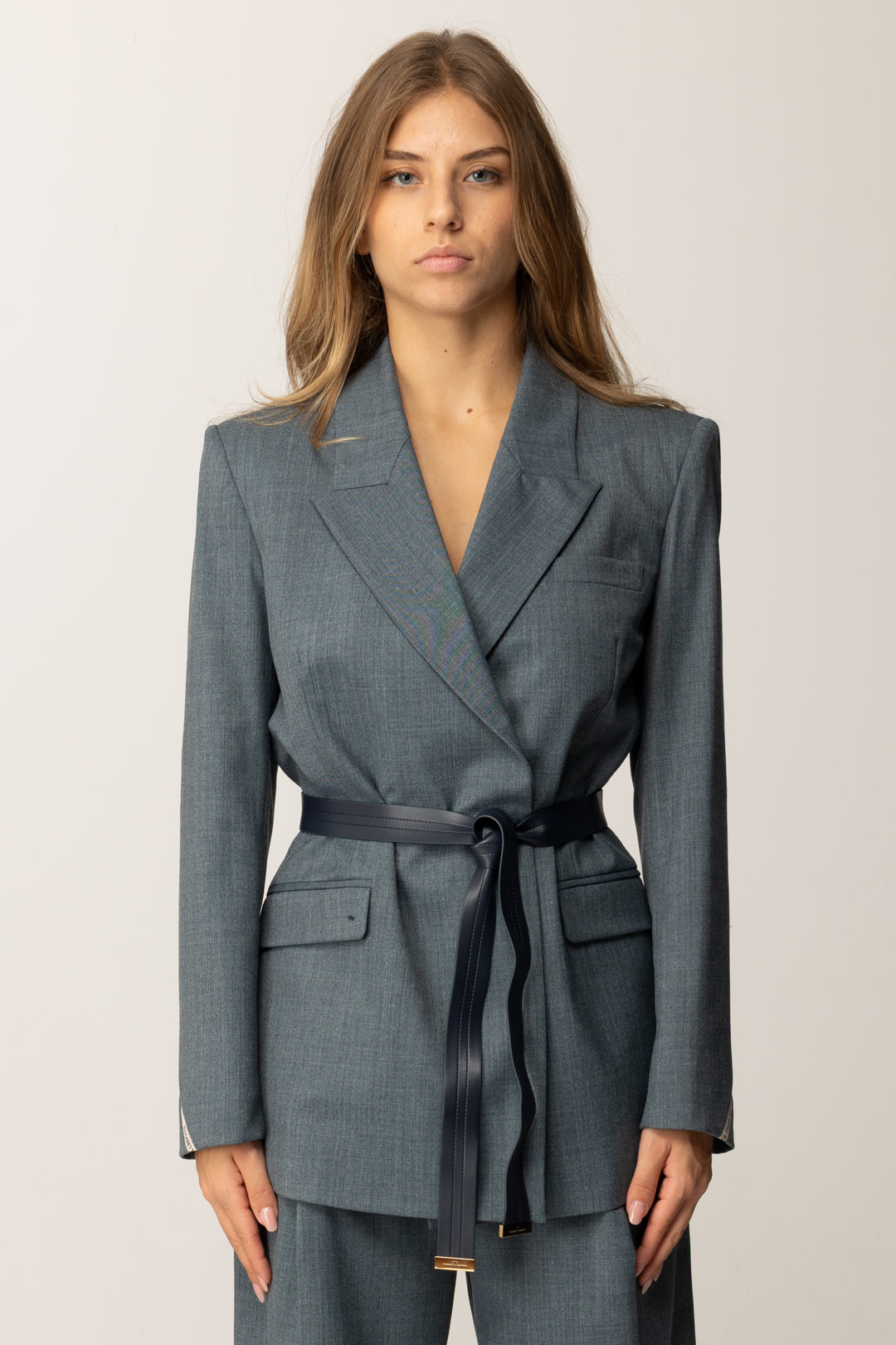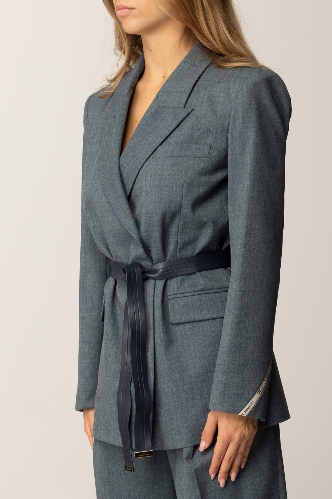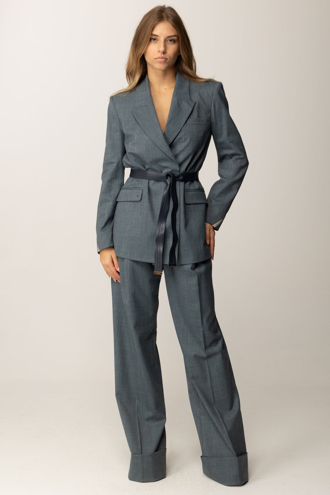 Modern spirit and sartorial precision for this Elisabetta Franchi suit perfect for ceremonies and seasonal events. The contemporary taste can be easily found in the jacket with wrap closure, accompanied by a ribbon belt in the same color with gold tips, and the detail of the sleeves with a logo ribbon insert, a recurring element in the collection. The matching pants have a soft cut, characterized by a wide cuff at the bottom, also enriched by the same ribbon motif, in a play of references perfect to create an impactful total look recognizable in the details.