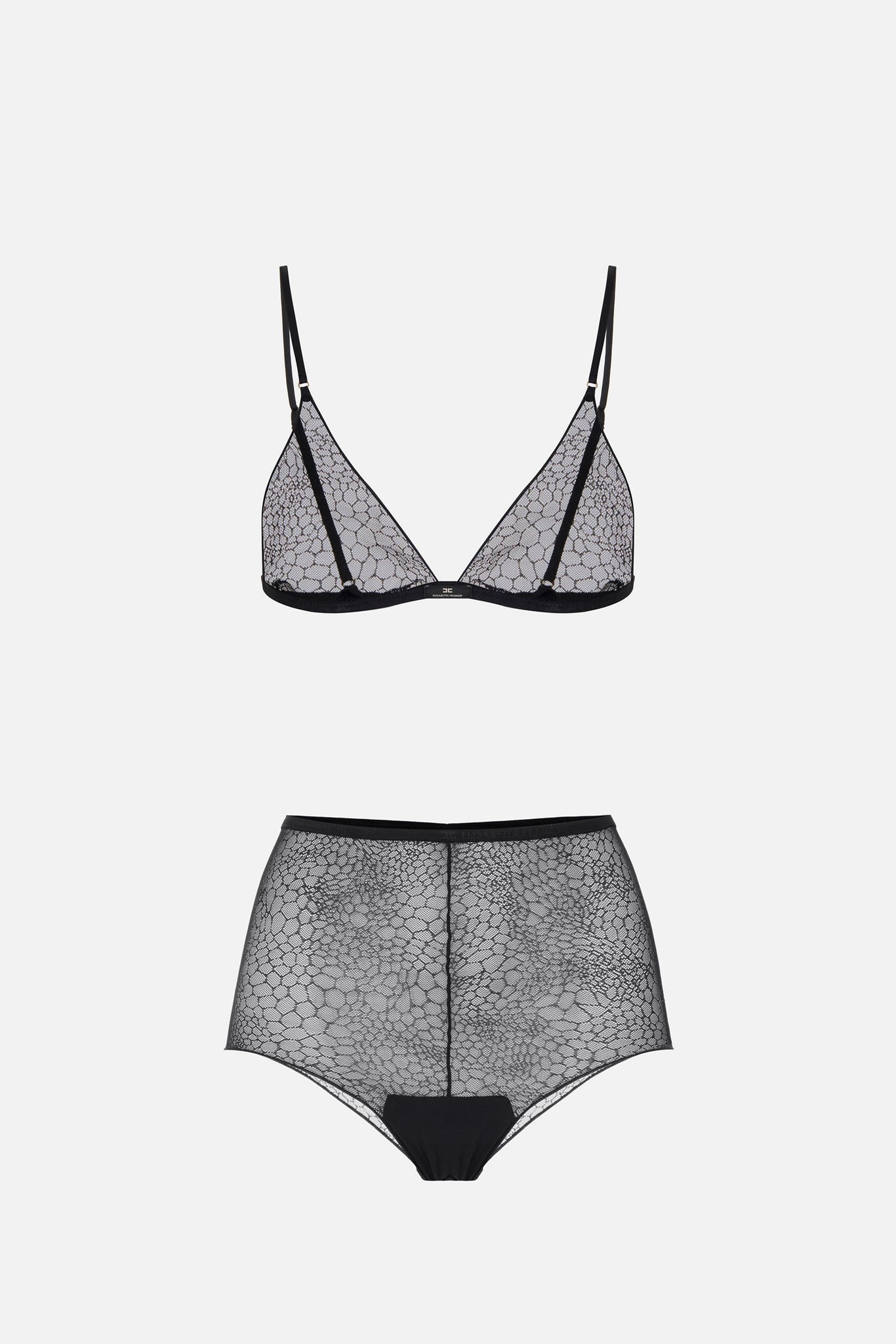A Elisabetta Franchi lingerie set that blends the boldness of snake print with the lightness of tulle, for a result as luxurious as it is intriguing. A secret elegance, designed for the woman who wants to feel comfort and style even under the most sophisticated outfits. The triangle-cut bra and matching culotte are made from finely crafted fabric, which enhances the silhouette without sacrificing delicacy. The snake print, interpreted in a modern key, gives character to the set, making it suitable not only as lingerie but as part of the experience — a detail that can emerge in the boldest looks.