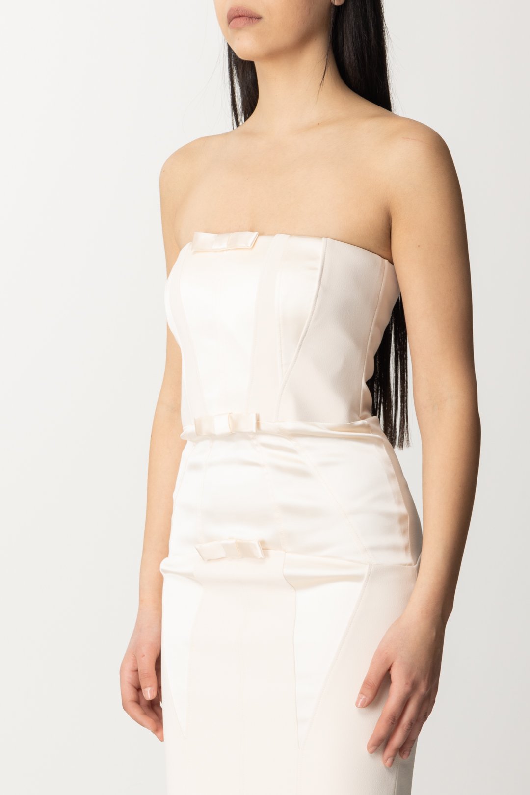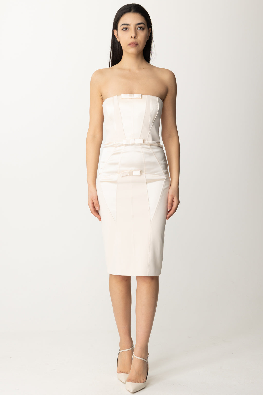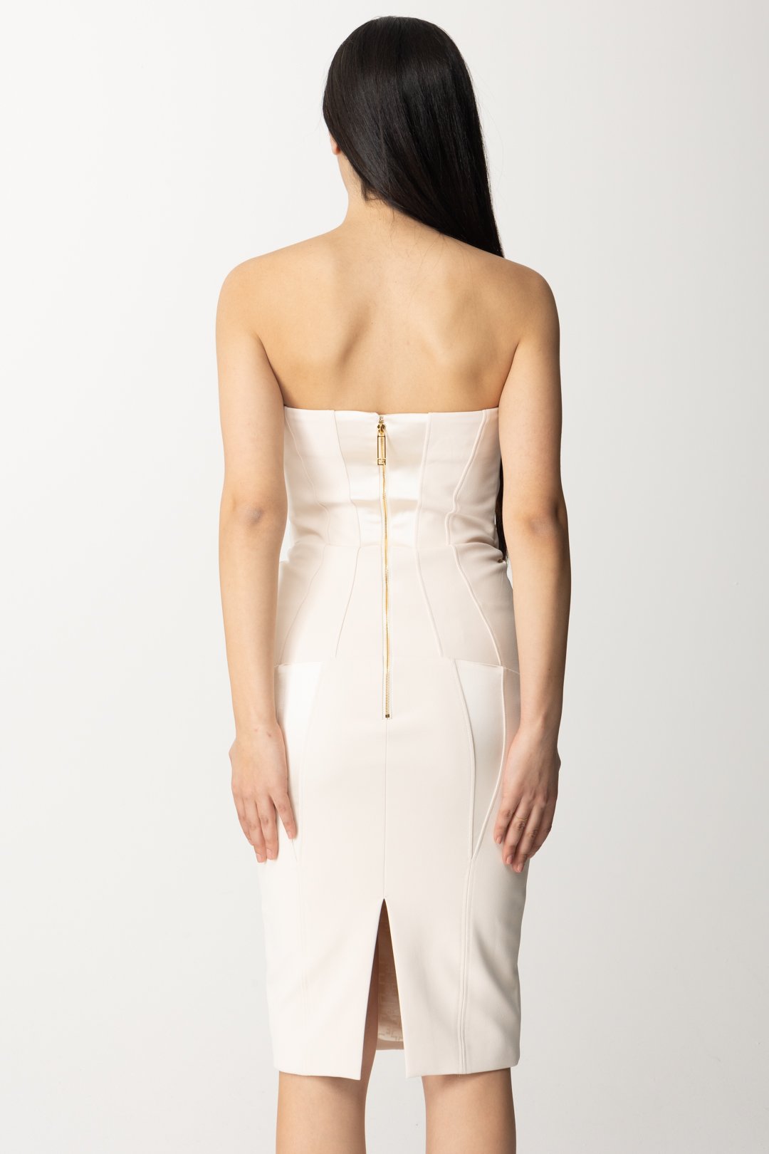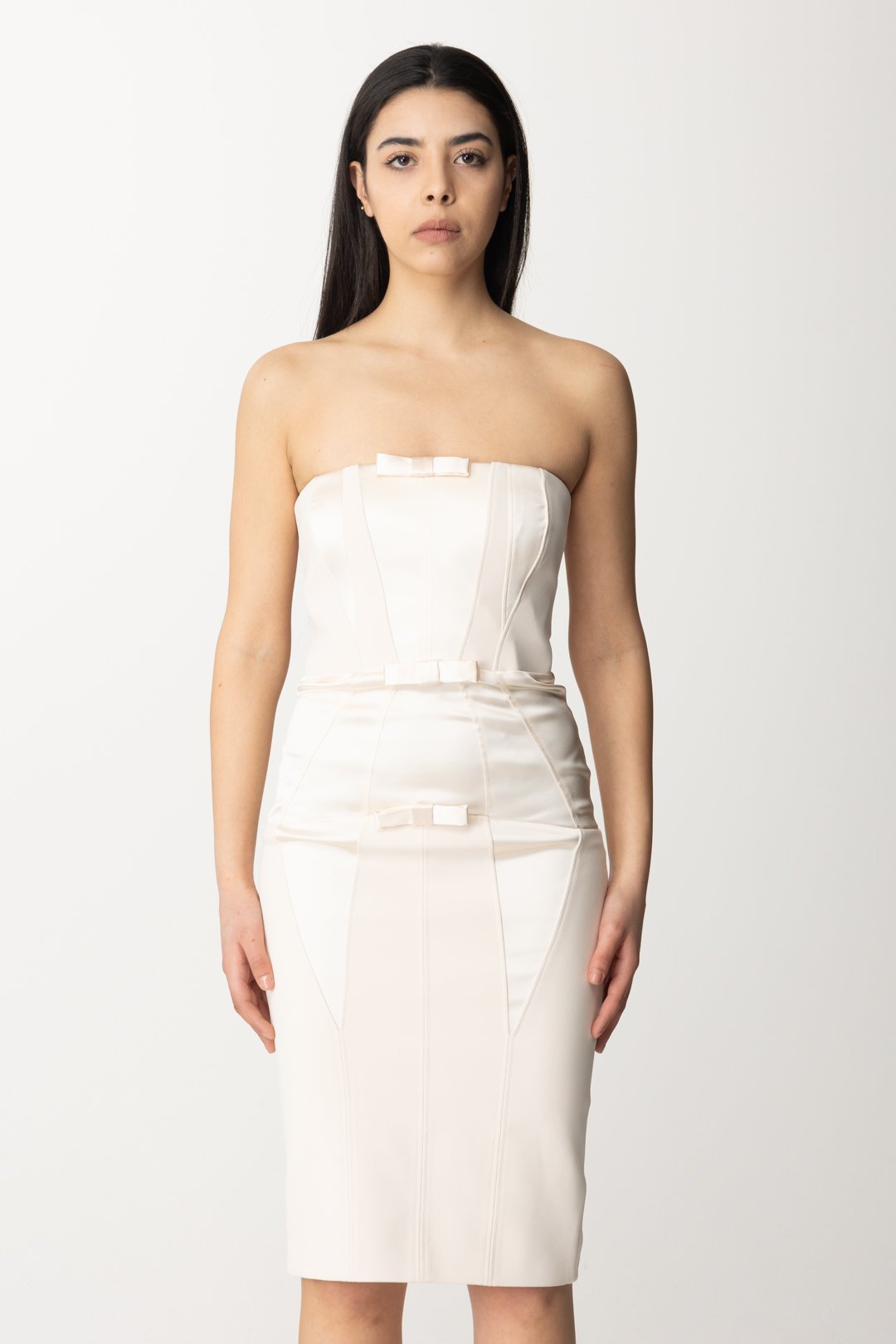 Dress Elisabetta Franchi that combines a bon ton inspiration, with playful details that accentuate the front, featuring a feminine and sexy allure given by the tailored fit and corsetry-style cuts with shiny satin inserts. The bandeau neckline leaves the shoulders completely exposed: you won't have trouble covering up, if necessary, with a nice shawl or a cropped blazer.
