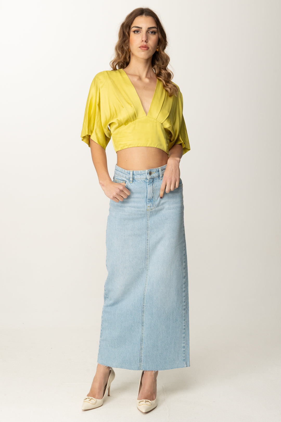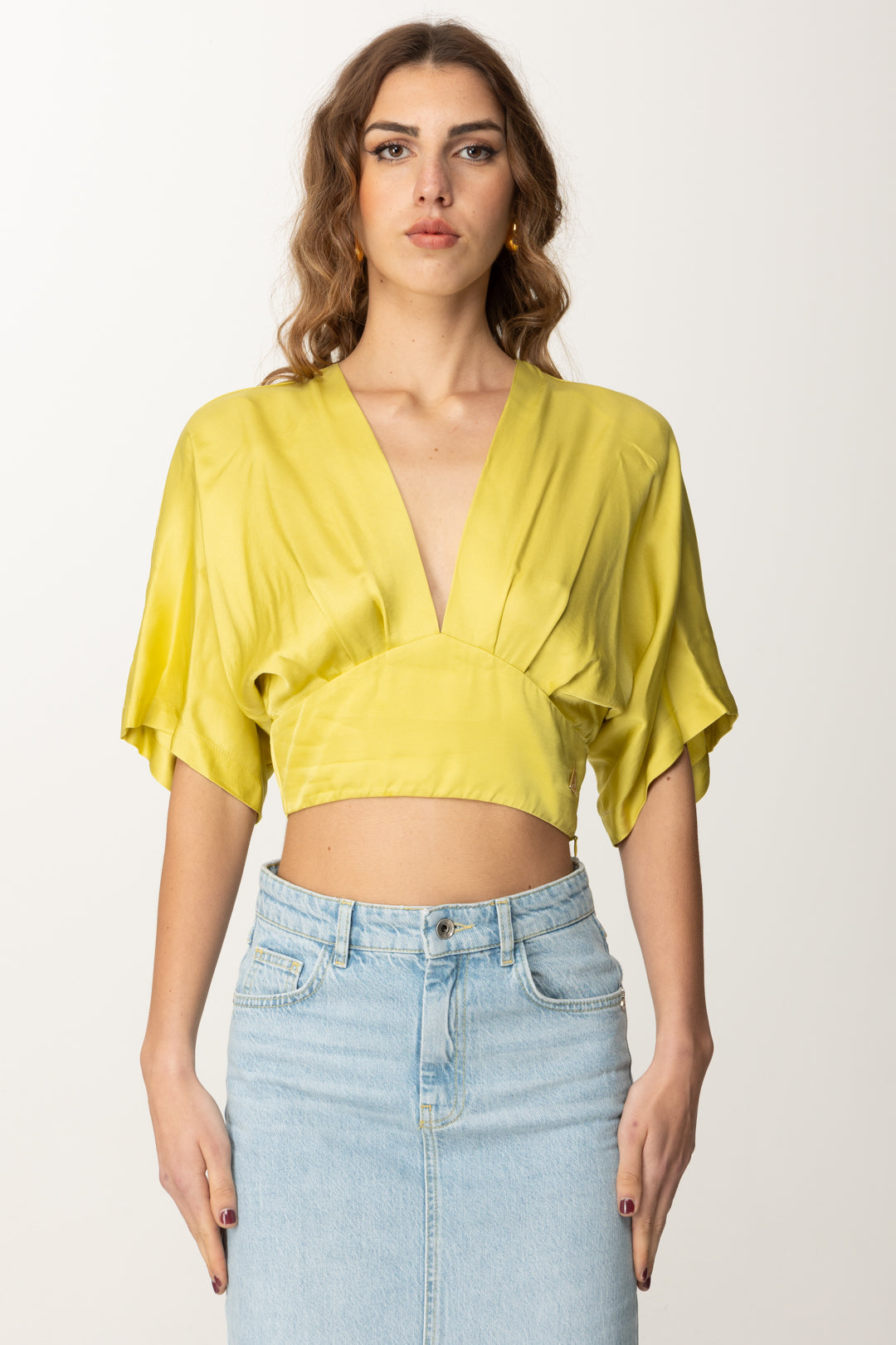 Short cut with deep V-neck and wide sleeves, the Top Akep in satin features a modern and feminine silhouette that enhances the waist, with batwing sleeves that create volume. Perfect with high-waisted pants or midi skirts for a mix of sexy and sophisticated.