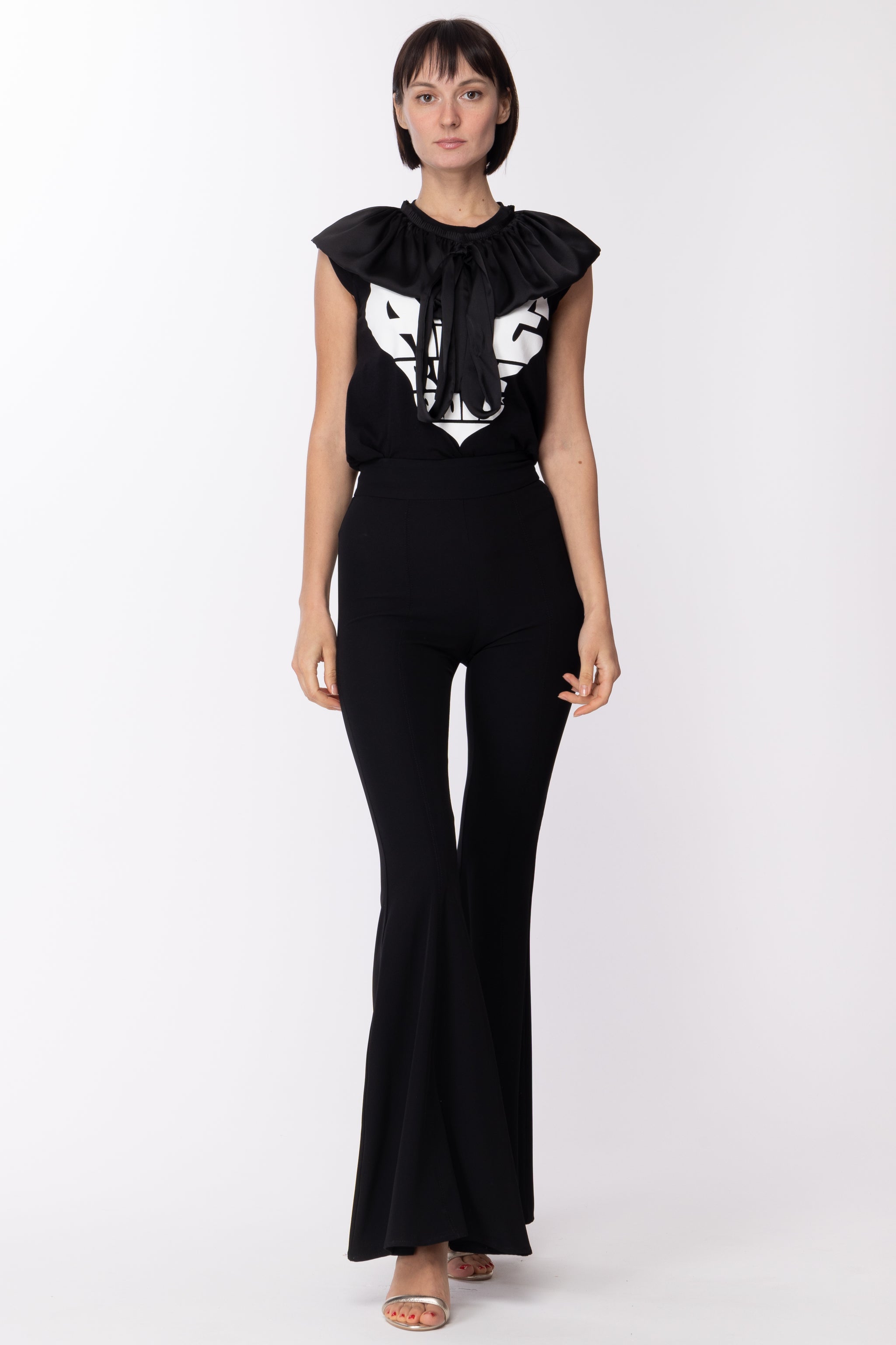 Certainly whimsical, an Aniye by he t-shirt combines a bold print - the heart with logo lettering that we also find in other garments - with a classic motif, such as the wide ruffle with ribbon that from the collar lies on the shoulders, creating a unique contrast of its kind!