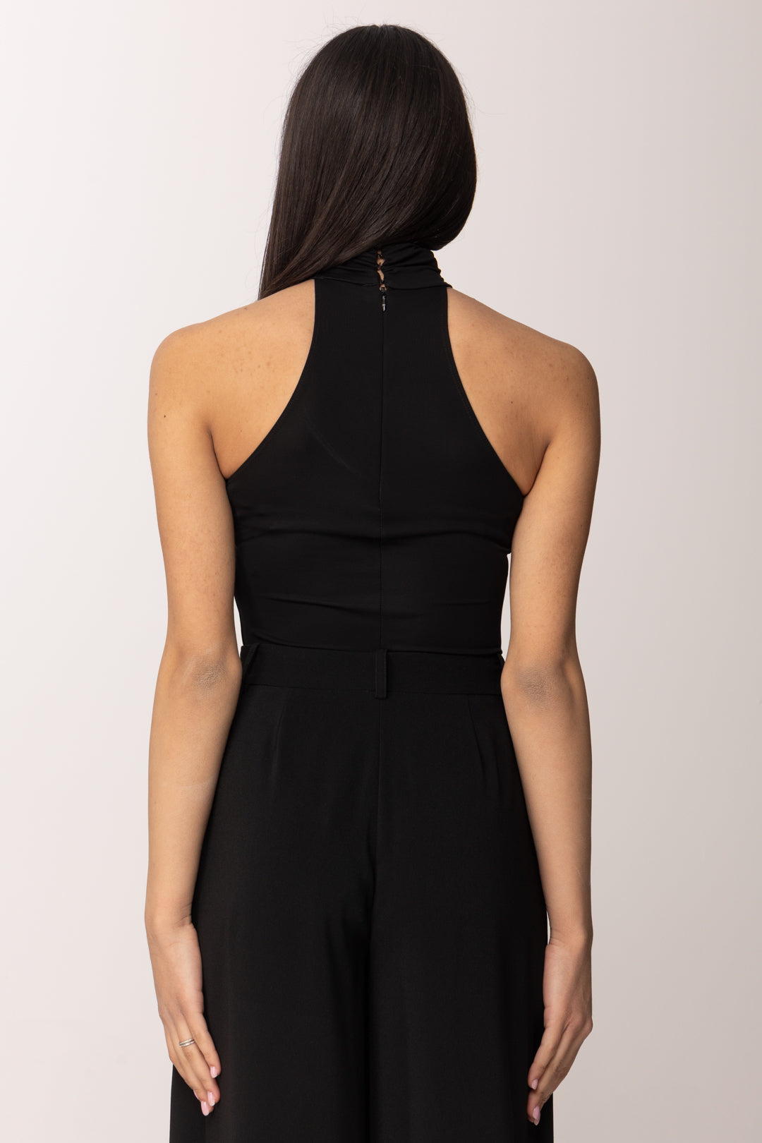 Elegante e sofisticato, questo body Elisabetta Franchi è pensato per valorizzare la silhouette con naturalezza e carattere. Realizzato in jersey crêpe dalla vestibilità slim, avvolge il corpo con una sensazione morbida ma definita, creando un profilo armonioso e femminile. Il collo alto aggiunge un tocco di raffinatezza contemporanea, mentre il detail gioiello in metallo dorato che trattiene lo scollo dona un accento luminoso e distintivo, firmando il capo con eleganza ed enfatizzando, con questo espendiente, anche la linea delle spalle, che restano scoperte.