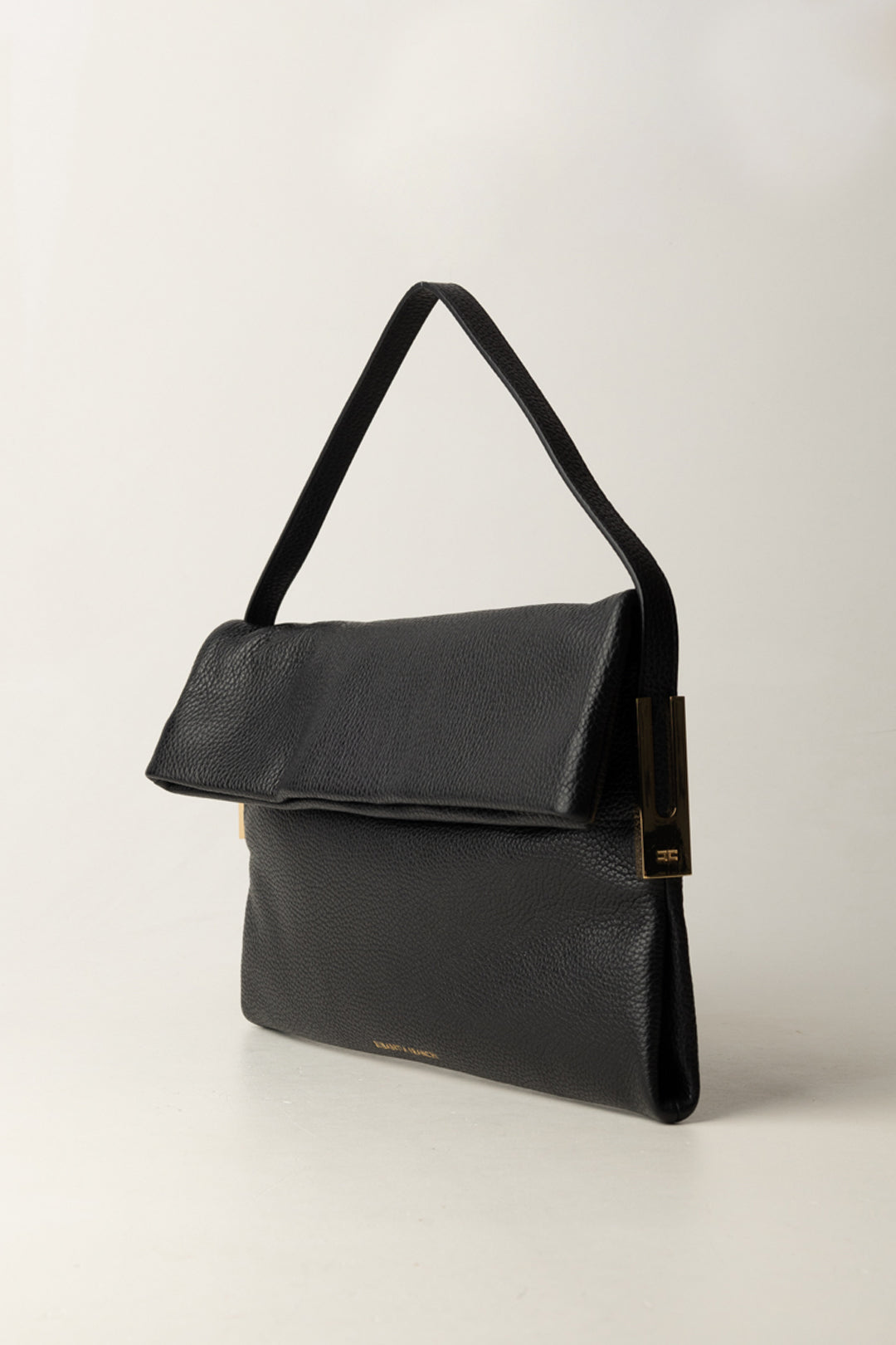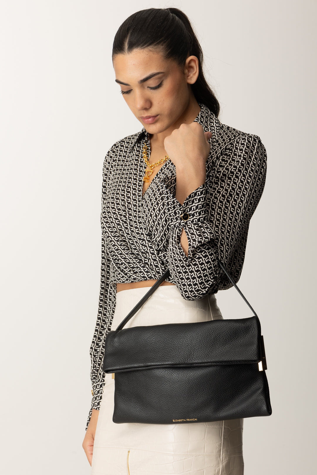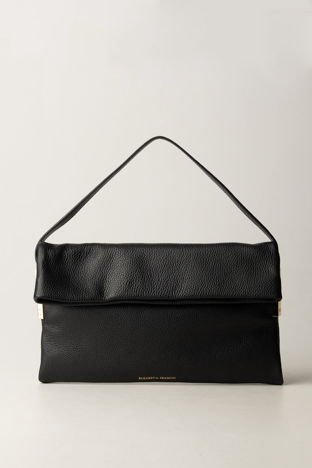 Elisabetta Franchi bag shoulder bag model made of 100% smooth leather, with a minimalist yet sophisticated cut. The elegant and linear shape is enriched by refined golden metal side inserts, embellished with the logo, which capture the light with sobriety and accentuate the brand's distinctive signature. The logo engraved on the base completes a design crafted to be recognizable without ostentation.