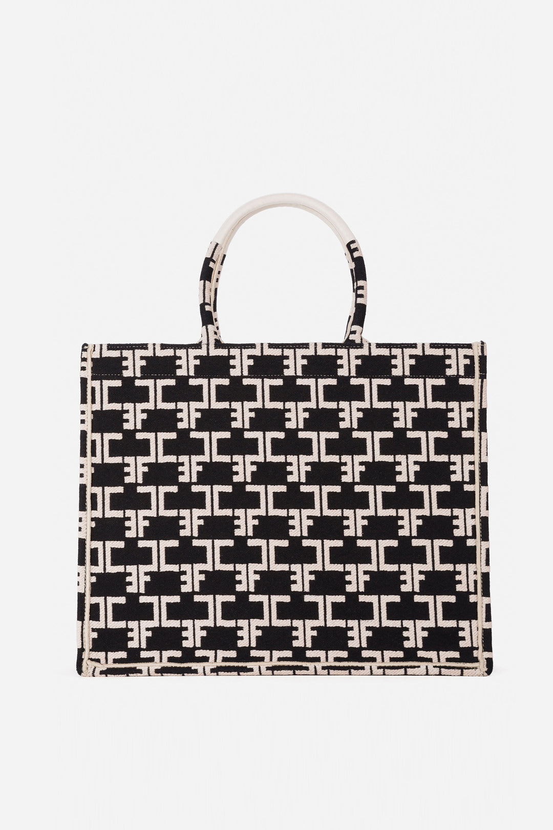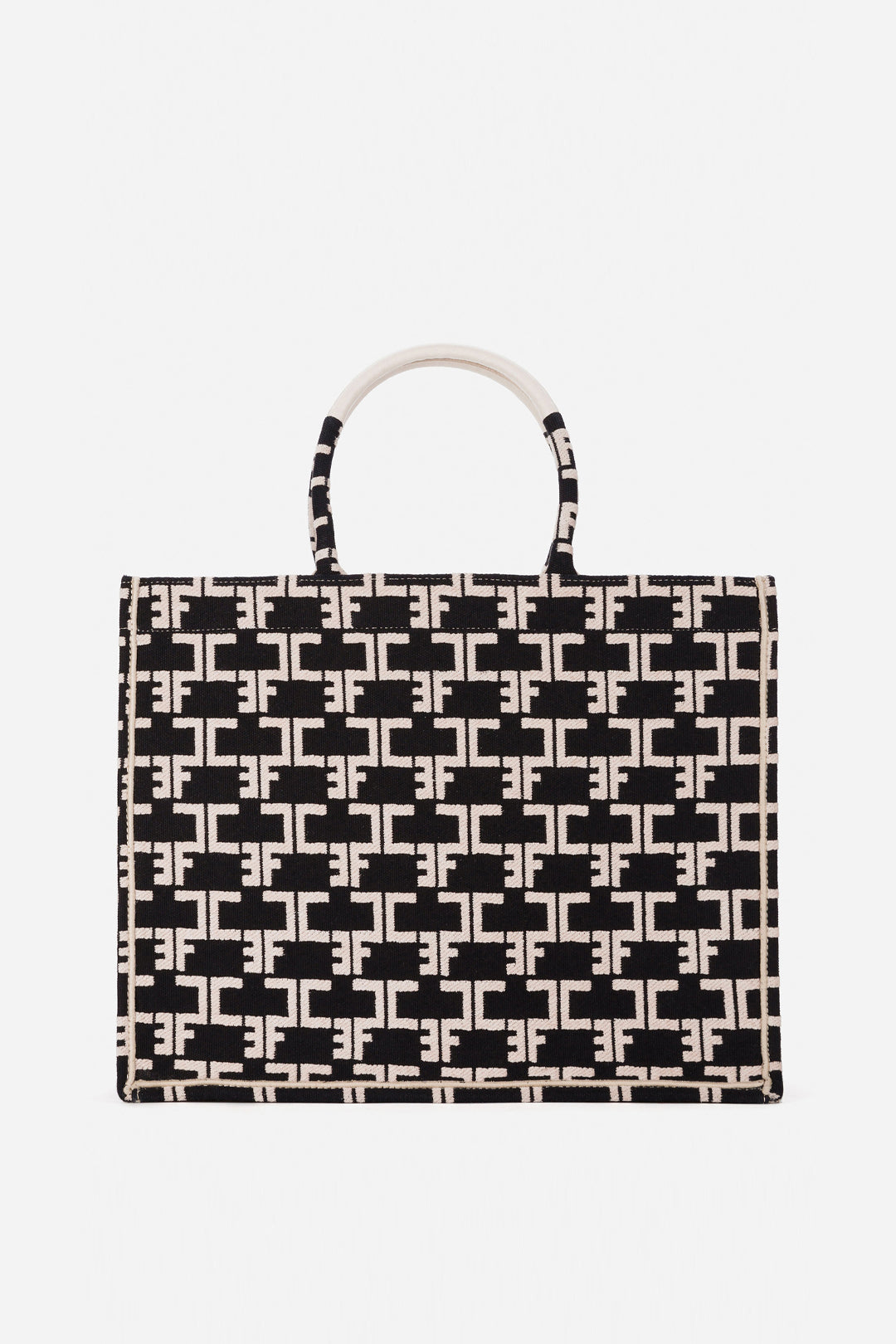 Imponente ma leggera: le dimensioni che non "pesano" per questa borsa Elisabetta Franchi della linea Monogram, come testimonia lastampa all over, di grande capacità e soprattutto stile. La sagoma ampia e generosa accoglie tutto l’essenziale della giornata - laptop, libri, beauty case, agenda - senza perdere eleganza né linea. La stampa monogram all-over in jacquard conferisce alla borsa un carattere immediatamente riconoscibile, rendendola un oggetto di stile oltre che un contenitore. I manici comodi e la struttura aperta permettono un uso quotidiano fluido, mentre i dettagli metallici (targhetta logo, finiture) aggiungono una nota di lucentezza discreta che illumina il look.