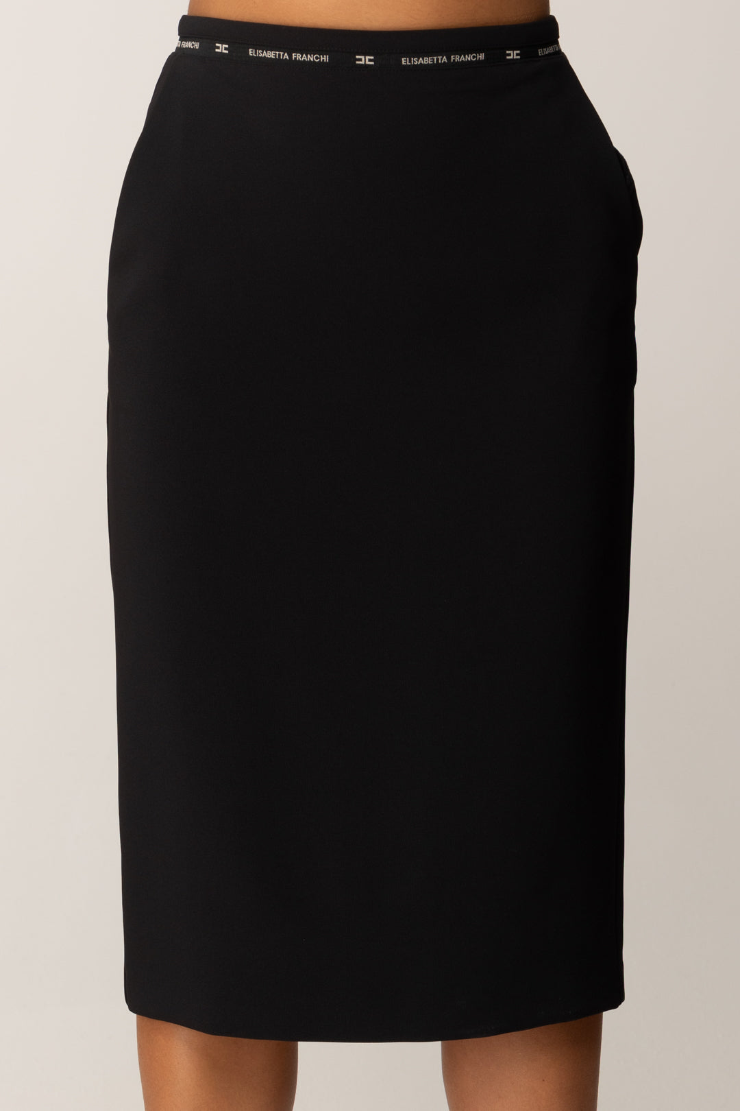 Everyday elegance for a garment with character in its simplicity. Elisabetta Franchi midi skirt designed to enhance your silhouette with a distinctive detail. Made of high-quality lightweight crêpe, it fits slimly, highlighting the hips and gently flowing over the leg. The real protagonist? The refined logo tape, placed around the waist to highlight it, combining aesthetics and brand identity with a refined touch.