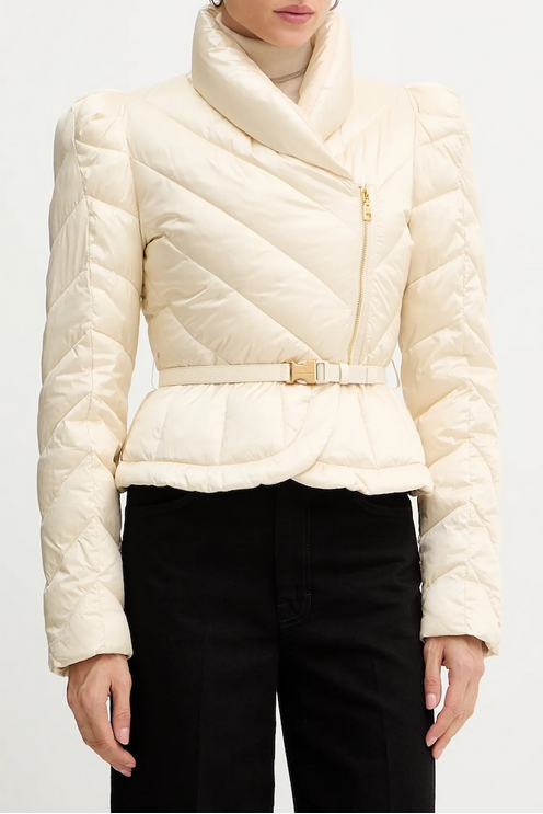 Il capo è arricchito da dettagli sartoriali di grande impatto: il collo alto sovrapposto, pensato per donare protezione e carattere, e le maniche strutturate con spalle bombate che aggiungono volume e un tocco couture. La cintura coordinata con fibbia logata definisce il punto vita, enfatizzando la linea a clessidra tipica dello stile Elisabetta Franchi, mentre la chiusura asimmetrica con zip dorata e tirazip rende il modello dinamico e contemporaneo.