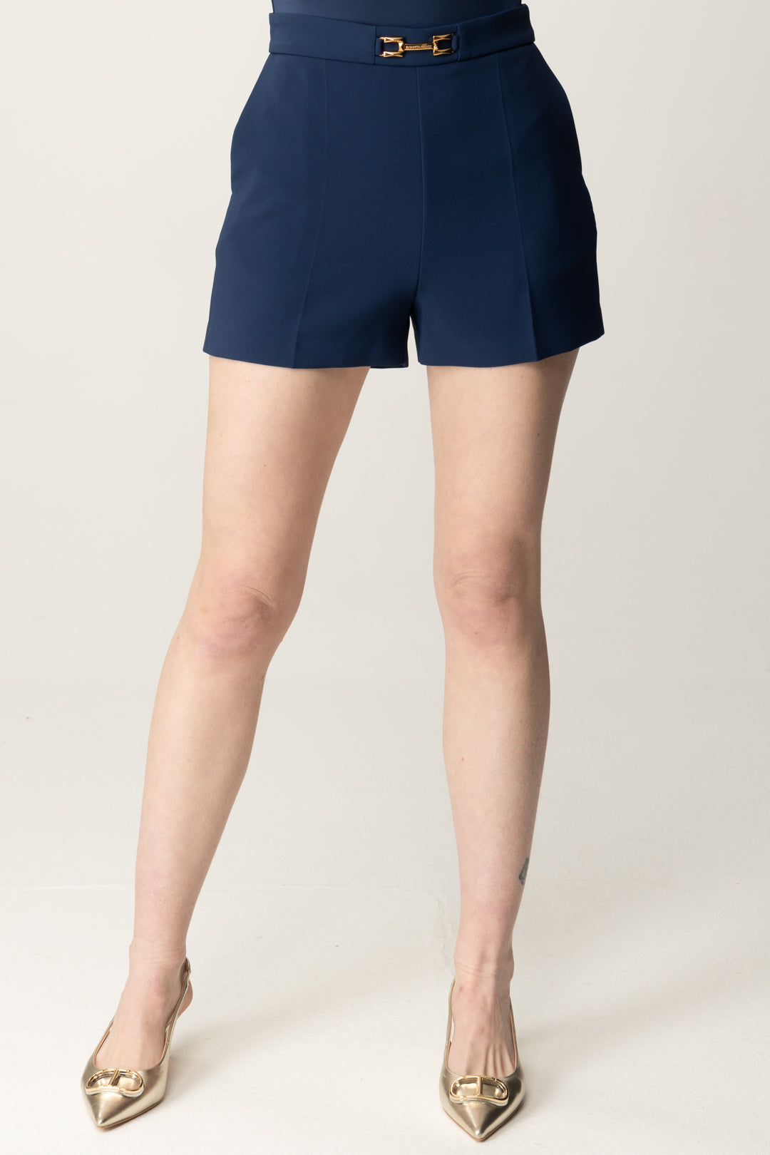 The alternative to the miniskirt to present yourself as carefree, sexy but also elegant. These shorts Elisabetta Franchi in lightweight stretch crêpe feature a waist belt decorated with a golden metal clasp, adding a touch of elegance to the piece. The front and back flaps, enriched with branded buttons, complete the refined design. The slim fit makes them ideal for a sophisticated and feminine look.