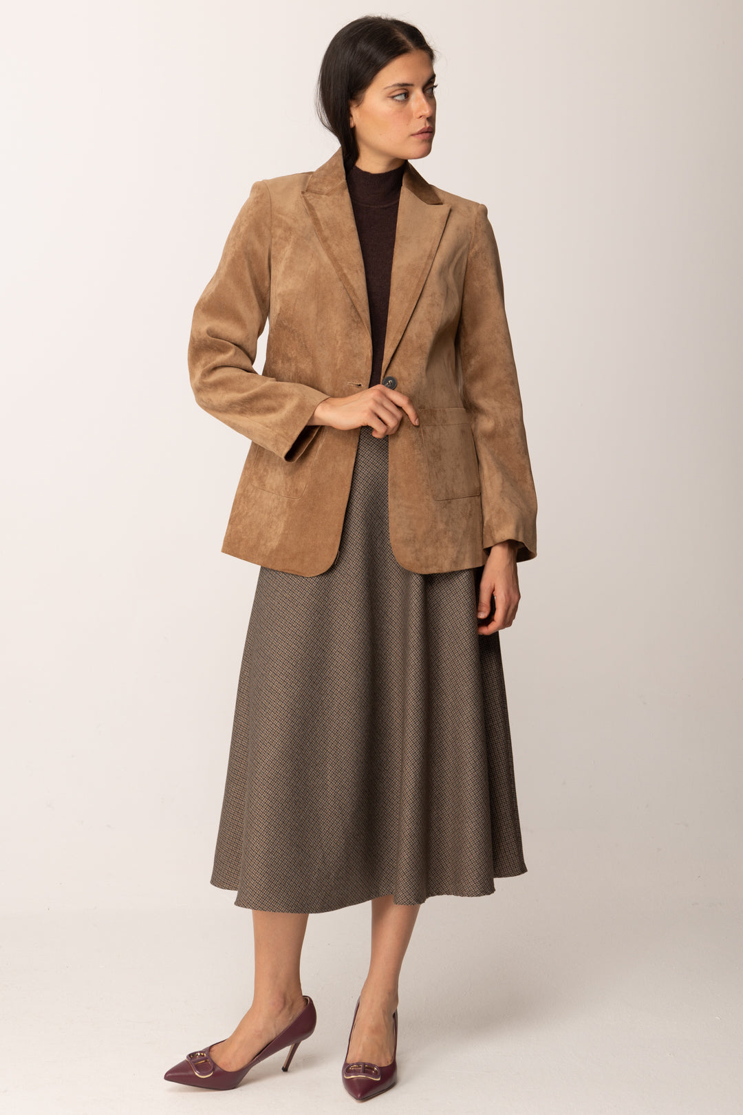 This Khloefemme skirt is the perfect choice for those who love essential and timeless elegance, with a touch of movement. Its flared line naturally follows the hips and opens towards the hem with a softness that gives harmony and length to the figure. The fabric with micro-pattern adds visual depth to the look, creating a refined play that remains discreet but never banal.