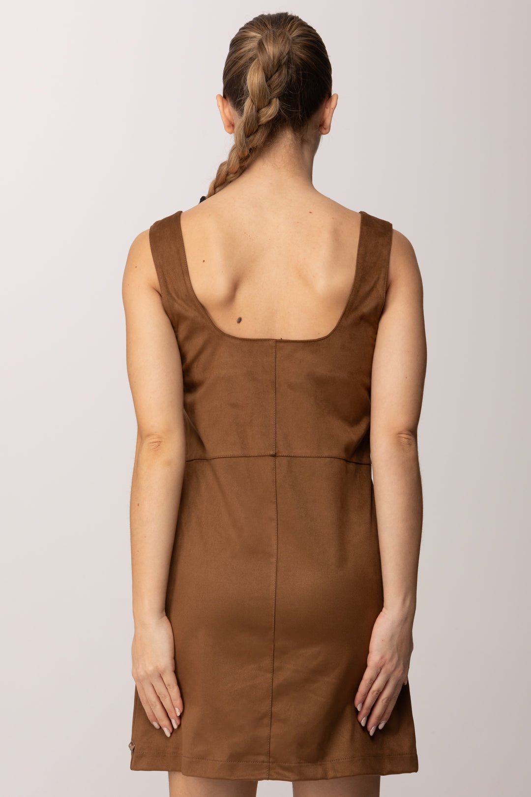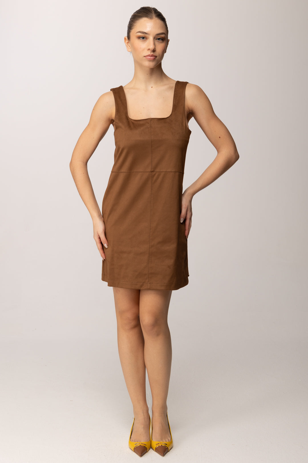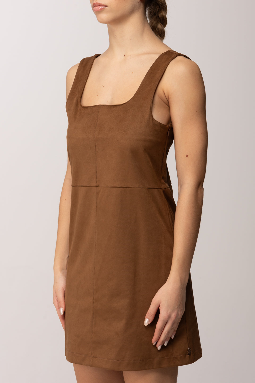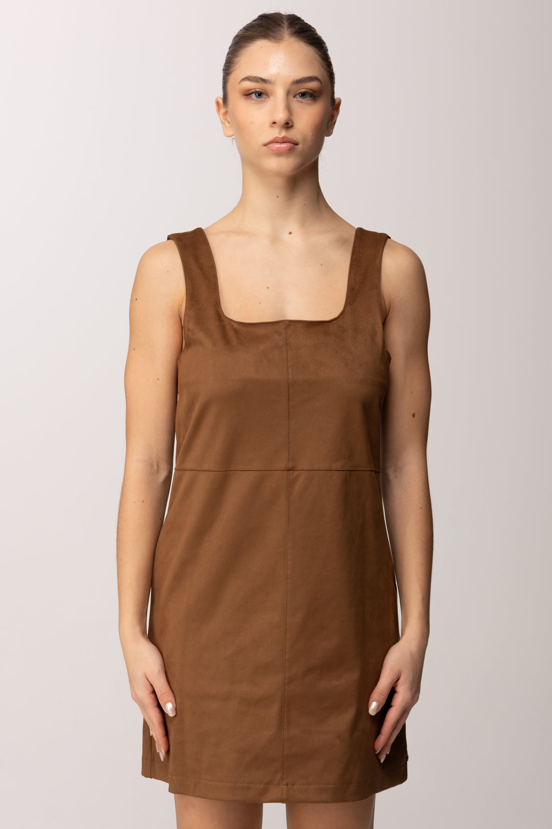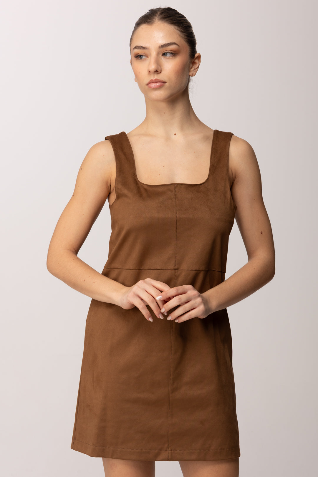 Linee essenziali e carattere deciso definiscono questo mini abito smanicato Meme Road, pensato per valorizzare la silhouette con naturalezza. Il design è pulito e contemporaneo, costruito su un equilibrio perfetto tra semplicità e sensualità discreta. La texture effetto suede dona profondità visiva al capo, rendendolo immediatamente sofisticato pur mantenendo un’allure quotidiana. Lo scollo ampio e leggermente squadrato incornicia il décolleté con eleganza, mentre la costruzione smanicata lascia le spalle scoperte, alleggerendo la linea e rendendo l’abito ideale anche come base per look stratificati. Il taglio segue il corpo senza costringerlo, accompagnando le forme in modo armonioso grazie alle cuciture verticali che slanciano la figura.