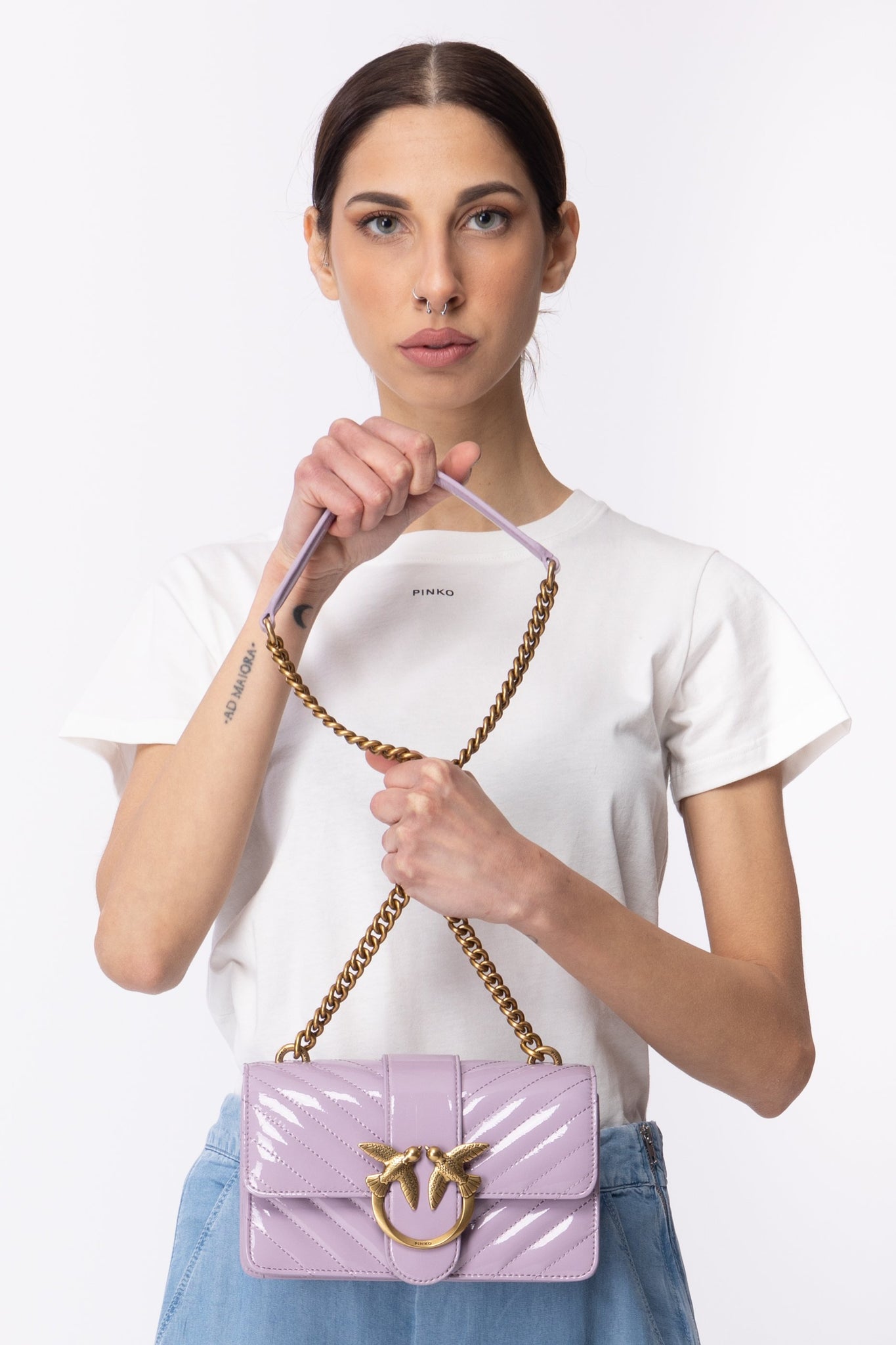 A Love one Mini Pinko bag is recognizable at first glance! This one in particular stands out for its fabric made of quilted nappa with a shiny finish! The flap closure is embellished with the Love Birds logo, and finally, a shoulder strap that combines a chain with a nappa shoulder pad. You never get tired of wearing it!