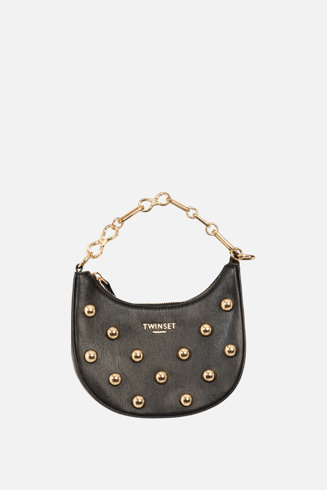 Compatta, luminosa e dal carattere deciso, la Borsa Twinset interpreta il classico modello hobo in una versione moderna e ricercata. La silhouette morbida e arrotondata segue naturalmente la linea del corpo mentre le borchie metalliche applicate sulla superficie creano un raffinato gioco di luce che dona movimento e personalità all’accessorio. Il manico a catena aggiunge un tocco contemporaneo e sofisticato, trasformando questa piccola borsa in un elemento distintivo capace di completare con eleganza anche i look più essenziali.