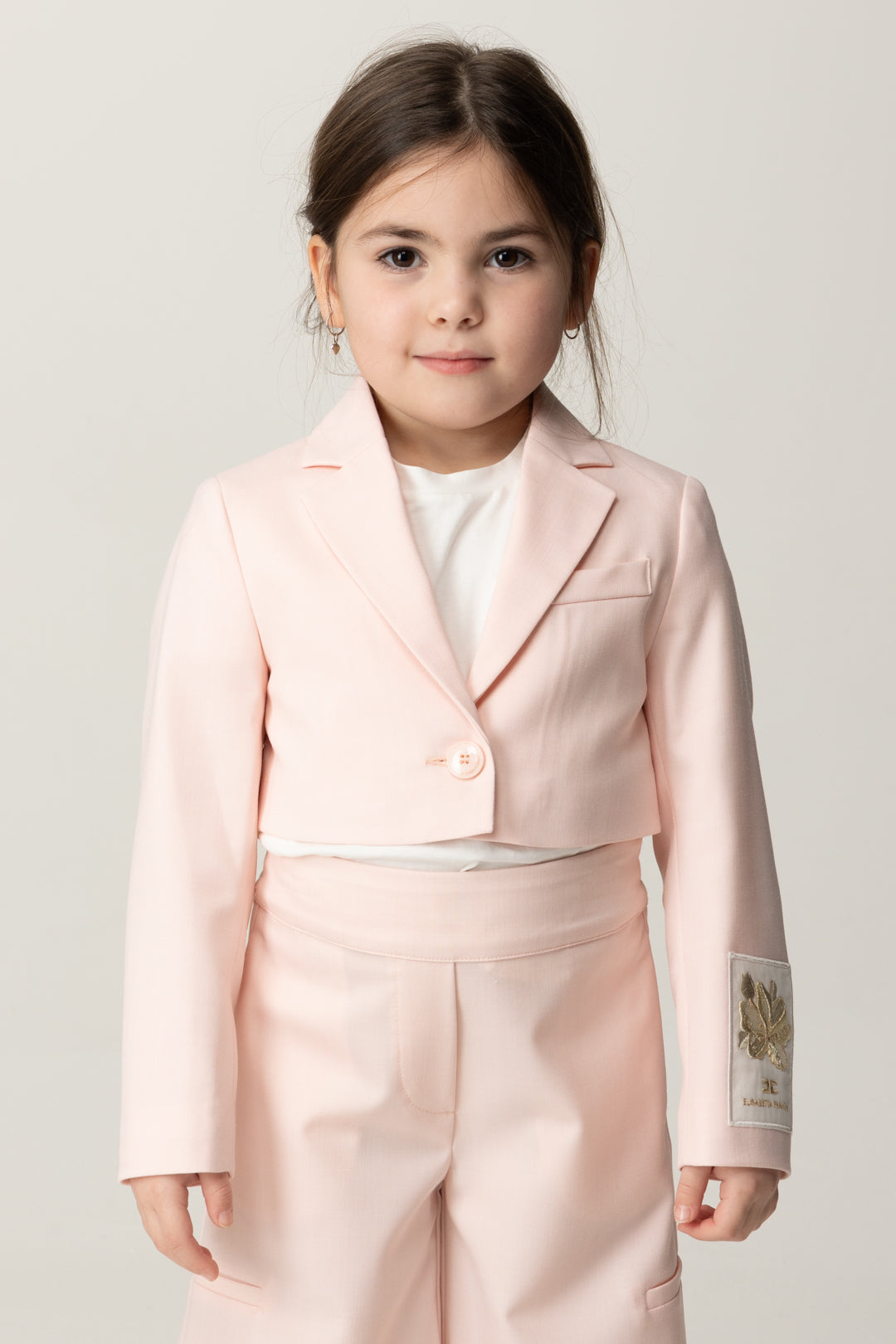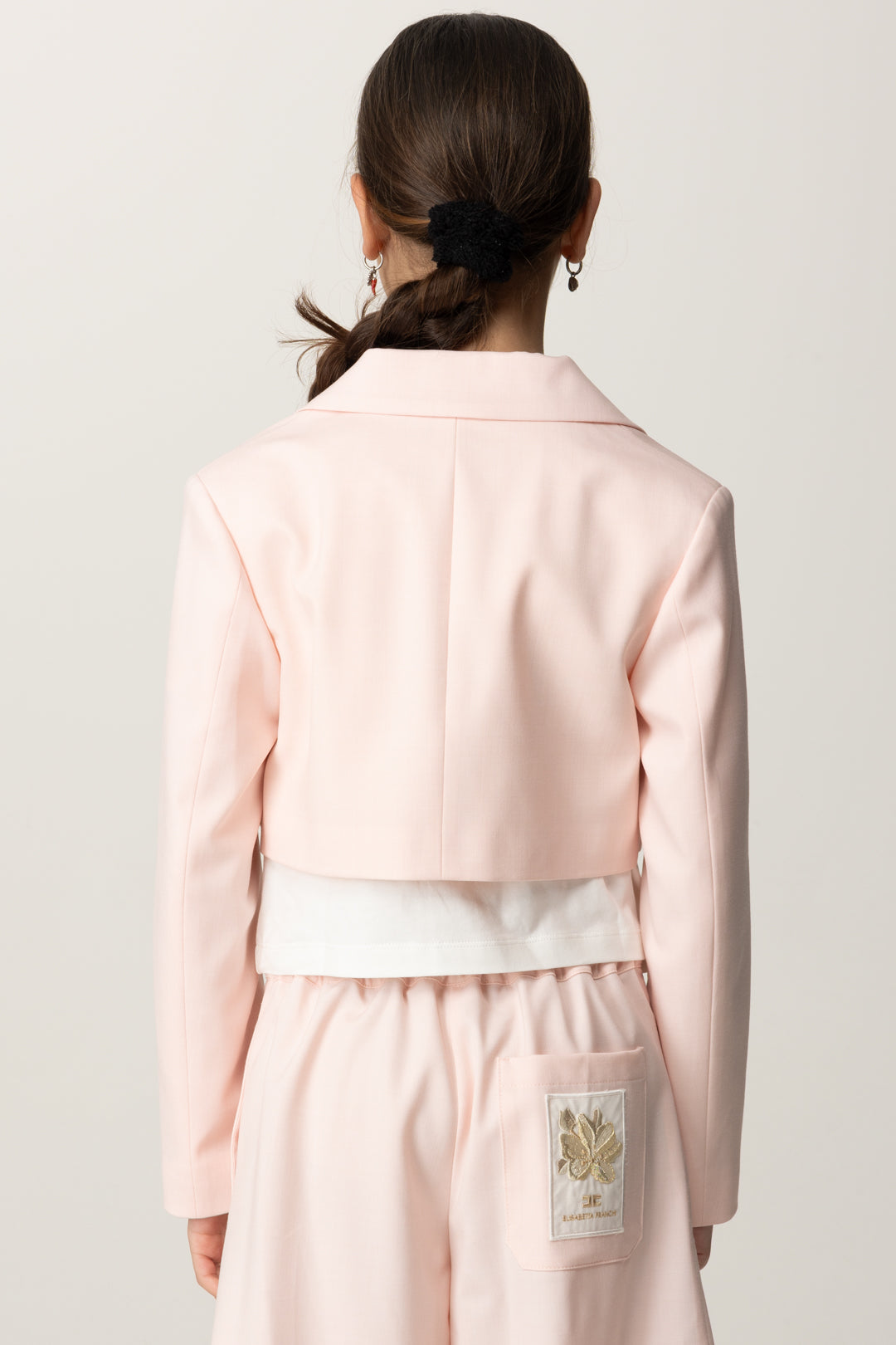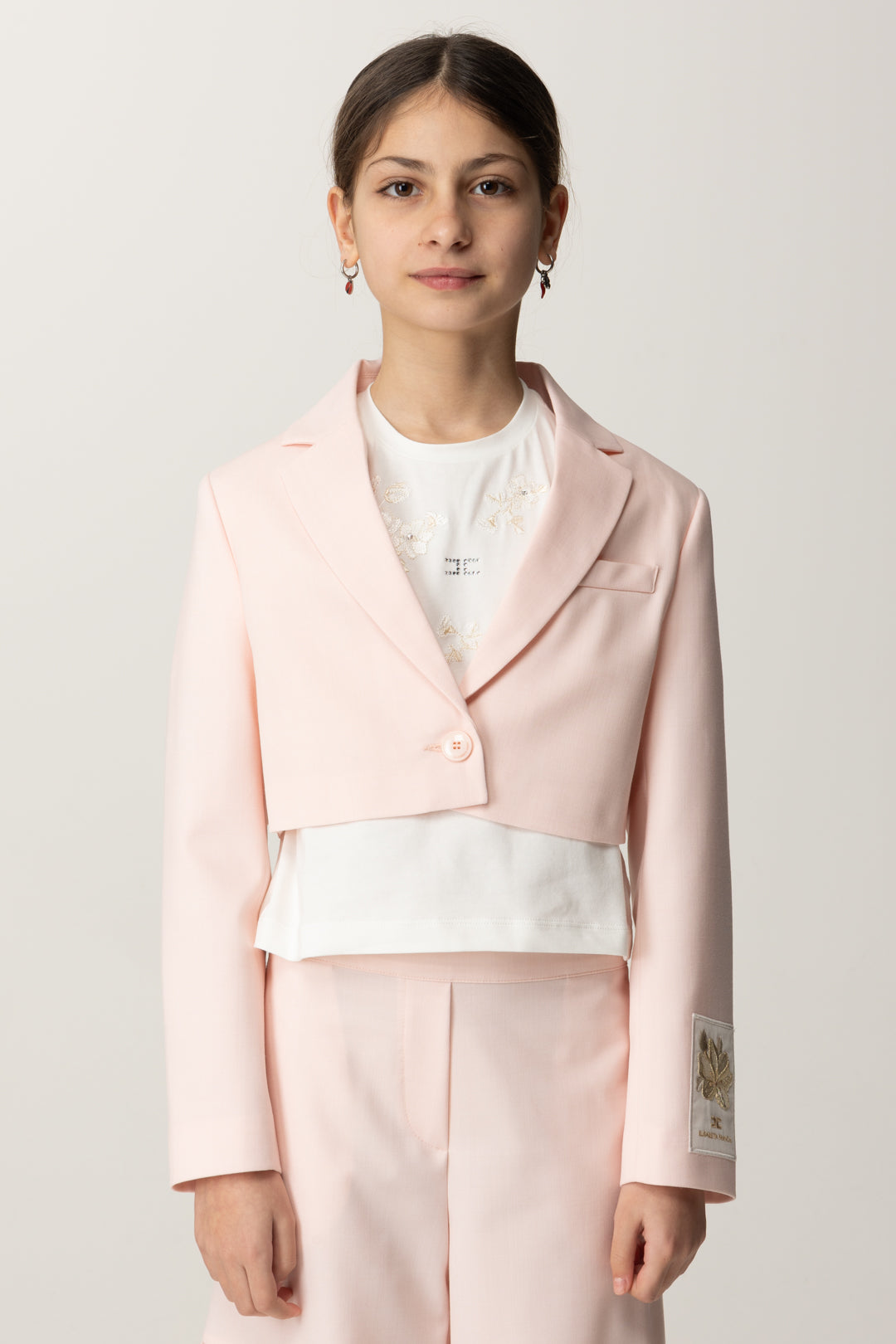 Corte crop que añade un poco de alegría a una prenda de abrigo pensada para los outfits más chic: chaqueta Elisabetta Franchi La mia Bambina realizada en fresco lana y con cierre de un solo botón, caracterizada por la etiqueta bordada en la manga con el logo y el diseño de una flor para subrayar el aire de bella temporada de esta prenda de abrigo. Para llevar también como bolerito sobre vestidos y monos sin mangas.