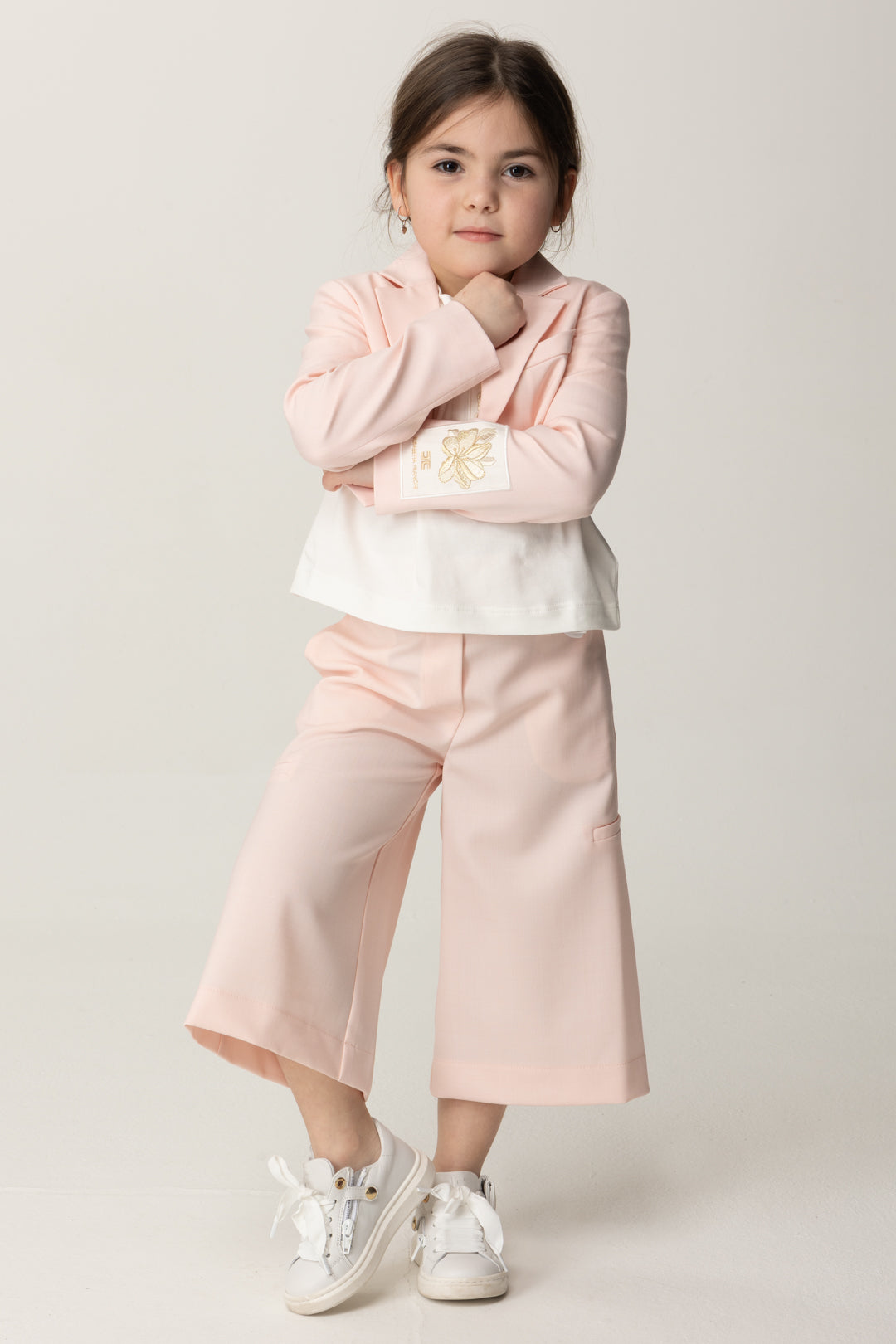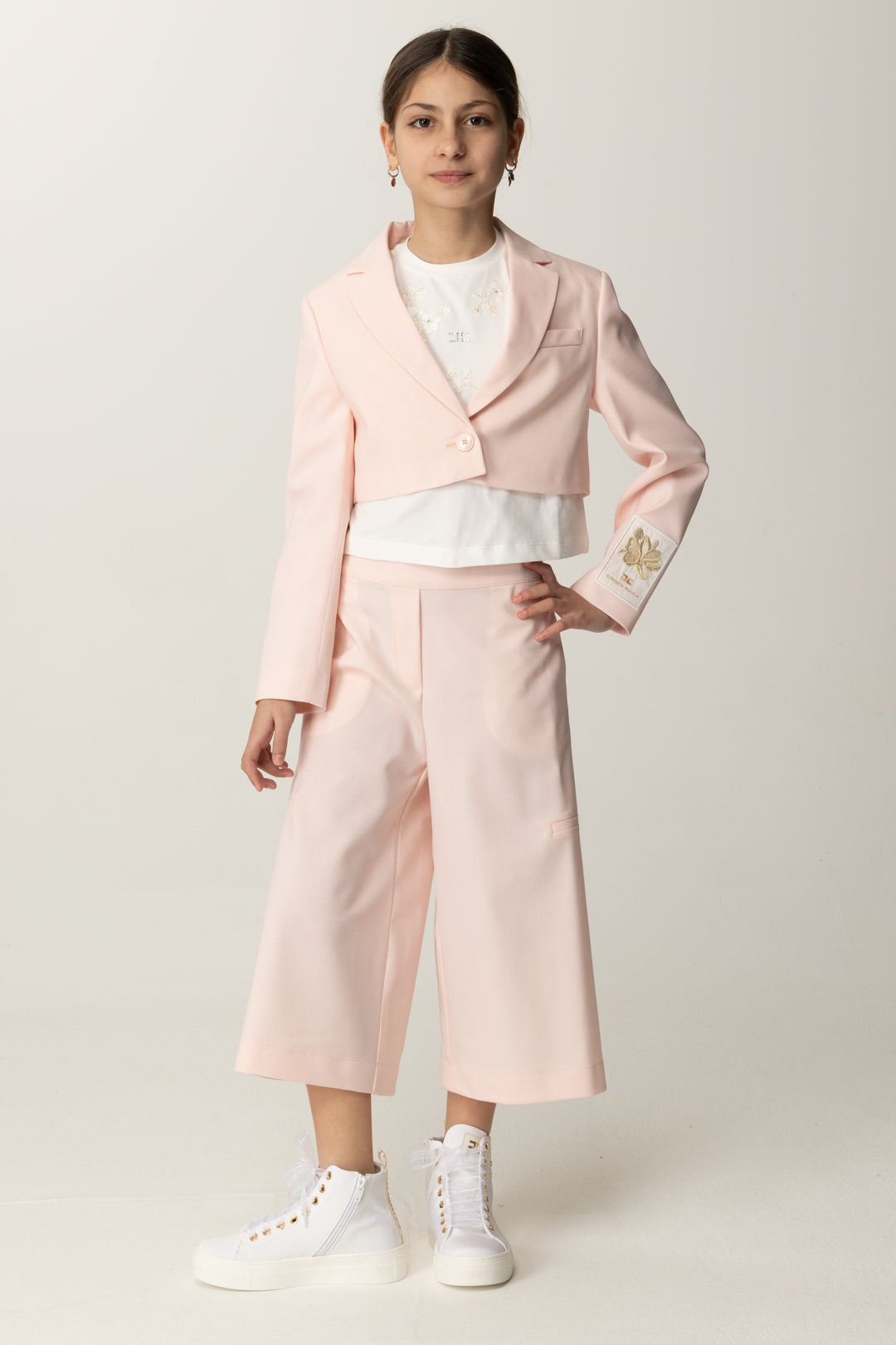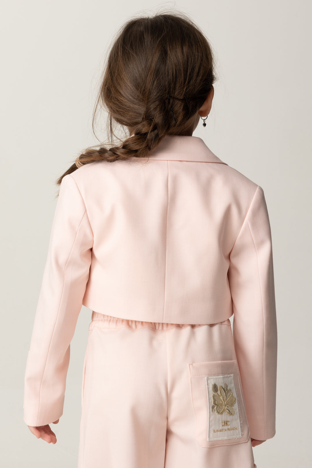 Corte crop que añade un poco de alegría a una prenda de abrigo pensada para los outfits más chic: chaqueta Elisabetta Franchi La mia Bambina realizada en fresco lana y con cierre de un solo botón, caracterizada por la etiqueta bordada en la manga con el logo y el diseño de una flor para subrayar el aire de bella temporada de esta prenda de abrigo. Para llevar también como bolerito sobre vestidos y monos sin mangas.