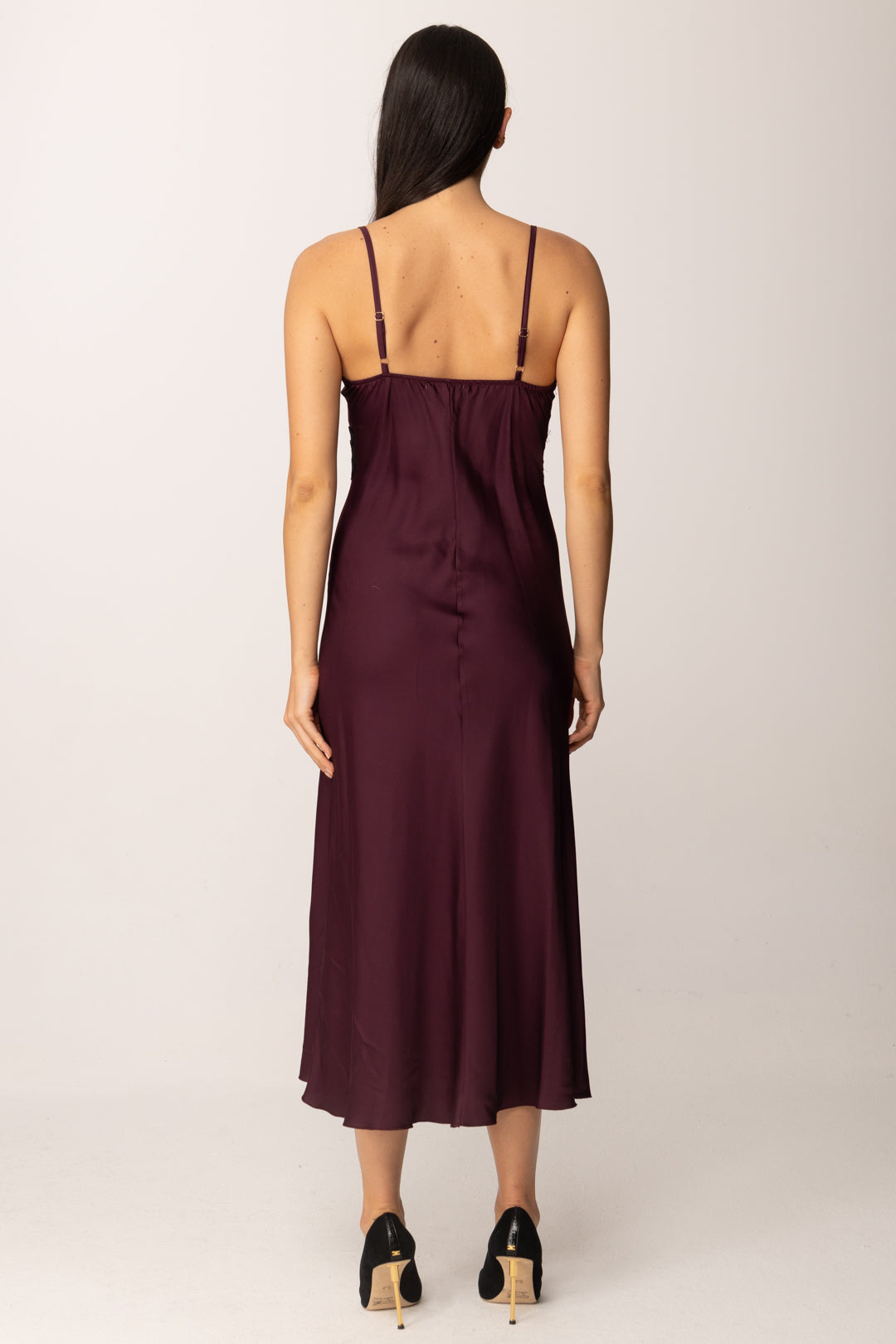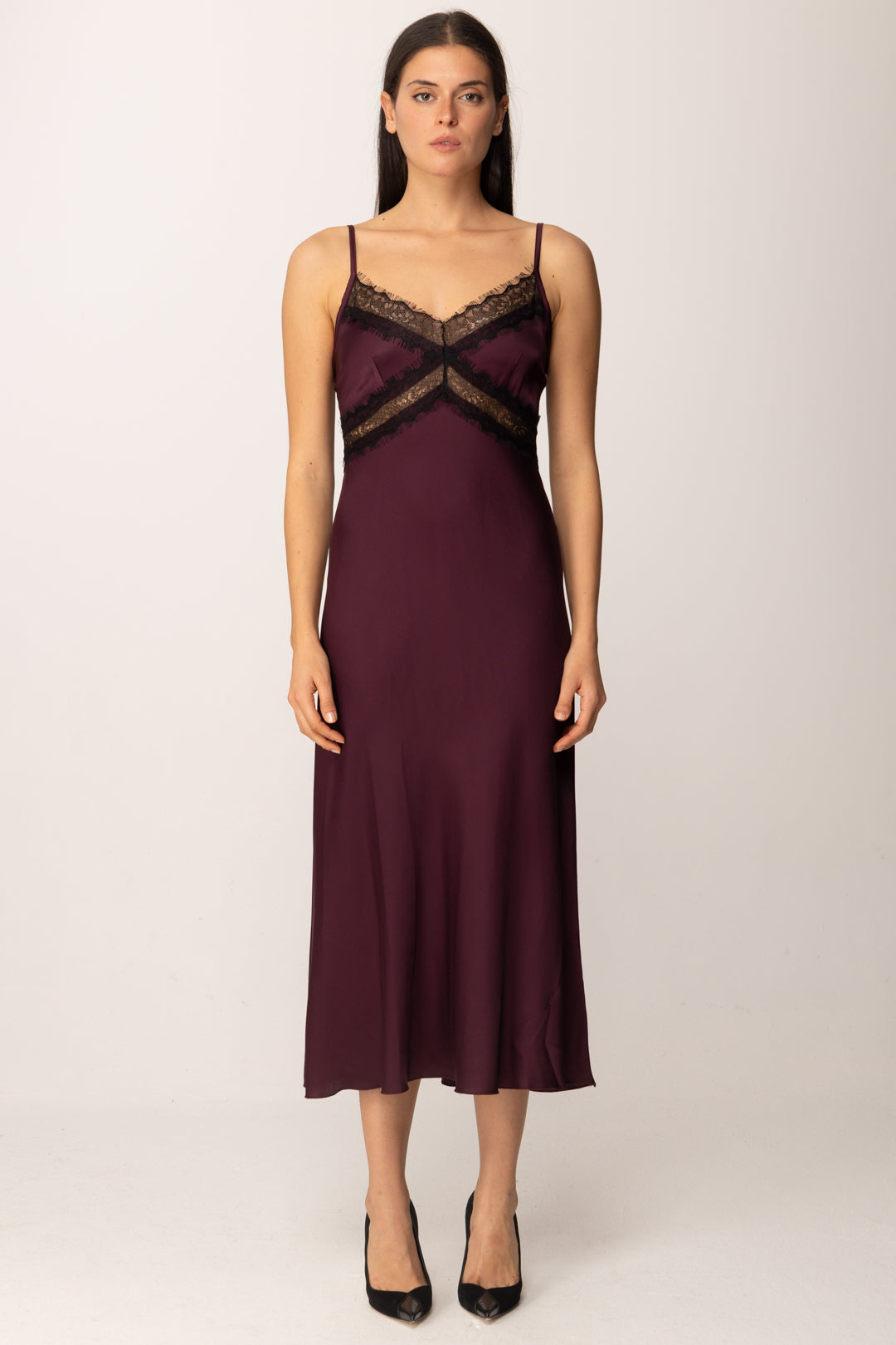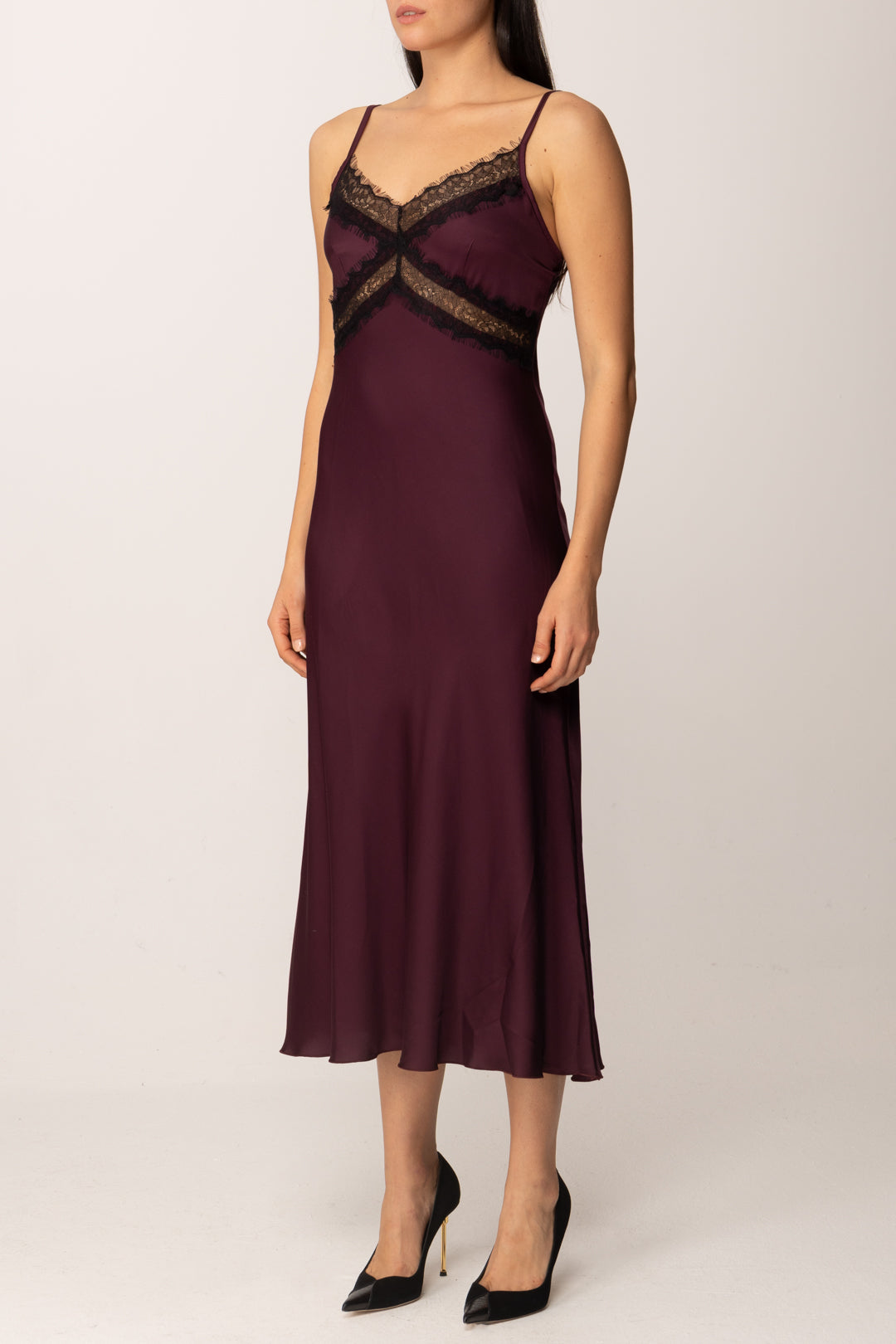 El escote en V se realza con una delicada inserción de encaje que se repite también bajo el busto, creando un refinado juego de transparencias que estiliza la figura y define la cintura con extrema feminidad. Las tiras finas ajustables permiten personalizar el ajuste, mientras que la longitud por debajo de la rodilla lo hace versátil y perfecto para ocasiones especiales.