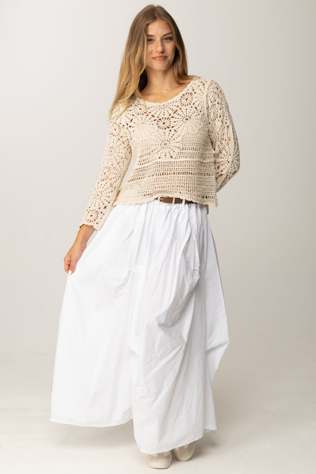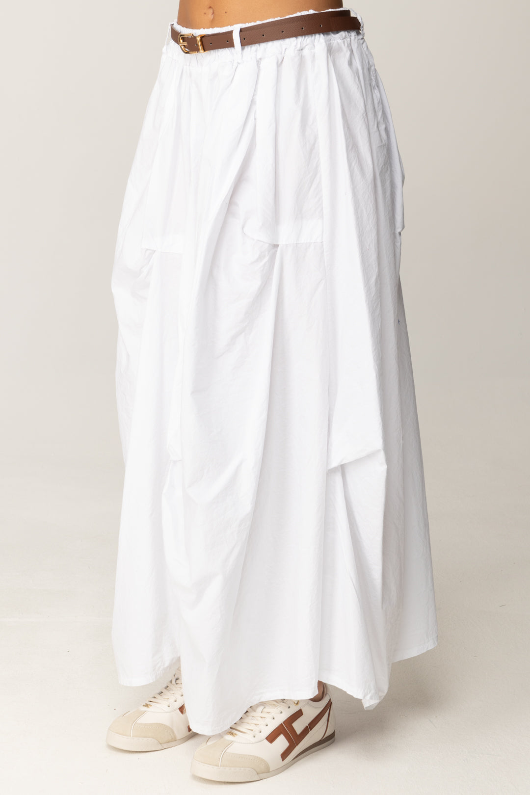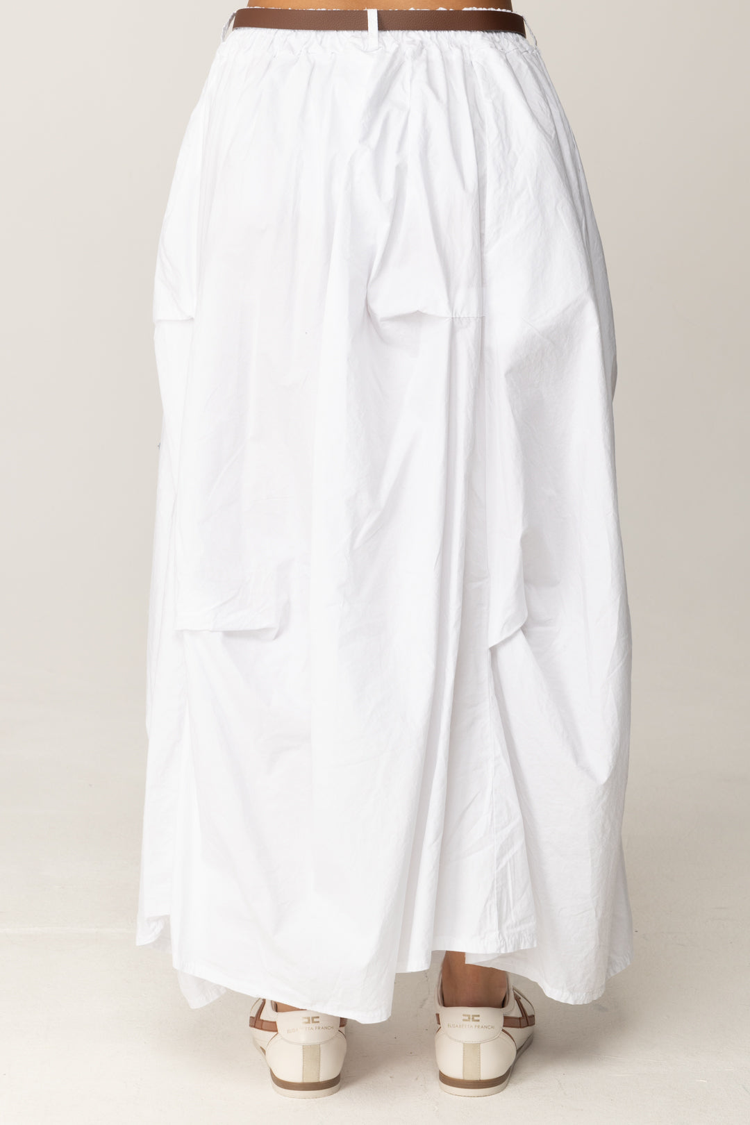 La textura del tejido es deliberadamente irregular, casi desgastada, para evocar una estética natural y auténtica. La cintura es elástica, pero enriquecida con un cinturón de piel sintética con hebilla dorada que define la cintura y añade un toque sofisticado. El color marrón cálido la hace extremadamente versátil, adecuada para cualquier paleta de temporada.